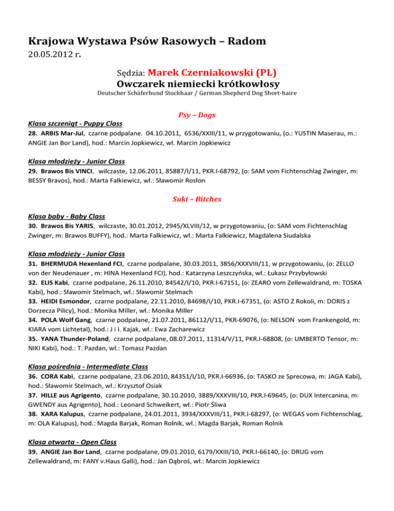 Krajowa Wystawa Psów Rasowych – Radom 20.05.2012 r. Sędzia: Marek Czerniakowski (PL) Owczarek niemiecki krótkowłosy Deutscher Schäferhund Stockhaar / German Shepherd Dog Short-haire Psy – Dogs Klasa szczeniąt - Puppy Class 28. ARBIS Mar-Jul, czarne podpalane. 04.10.2011, 6536/XXIII/11, w przygotowaniu, (o.: YUSTIN Maserau, m.: ANGIE Jan Bor Land), hod.: Marcin Jopkiewicz, wł. Marcin Jopkiewicz Klasa młodzieży - Junior Class 29. Brawos Bis VINCI, wilczaste, 12.06.2011, 85887/I/11, PKR.I-68792, (o: SAM vom Fichtenschlag Zwinger, m: BESSY Bravos), hod.: Marta Falkiewicz, wł.: Sławomir Rosłon Suki – Bitches Klasa baby - Baby Class 30. Brawos Bis YARIS, wilczaste, 30.01.2012, 2945/XLVIII/12, w przygotowaniu, (o: SAM vom Fichtenschlag Zwinger, m: Brawos BUFFY), hod.: Marta Falkiewicz, wł.: Marta Falkiewicz, Magdalena Siudalska Klasa młodzieży - Junior Class 31. BHERMUDA Hexenland FCI, czarne podpalane, 30.03.2011, 3856/XXXVIII/11, w przygotowaniu, (o: ZELLO von der Neudenauer , m: HINA Hexenland FCI), hod.: Katarzyna Leszczyńska, wł.: Łukasz Przybyłowski 32. ELIS Kabi, czarne podpalane, 26.11.2010, 84542/I/10, PKR.I-67151, (o: ZEARO vom Zellewaldrand, m: TOSKA Kabi), hod.: Sławomir Stelmach, wł.: Sławomir Stelmach 33. HEIDI Esmondor, czarne podpalane, 22.11.2010, 84698/I/10, PKR.I-67351, (o: ASTO Z Rokoli, m: DORIS z Dorzecza Pilicy), hod.: Monika Miller, wł.: Monika Miller 34. POLA Wolf Gang, czarne podpalane, 21.07.2011, 86112/I/11, PKR-69076, (o: NELSON vom Frankengold, m: KIARA vom Lichtetal), hod.: J i I. Kajak, wł.: Ewa Zacharewicz 35. YANA Thunder-Poland, czarne podpalane, 08.07.2011, 11314/V/11, PKR.I-68808, (o: UMBERTO Tensor, m: NIKI Kabi), hod.: T. Pazdan, wł.: Tomasz Pazdan Klasa pośrednia - Intermediate Class 36. CORA Kabi, czarne podpalane, 23.06.2010, 84351/I/10, PKR.I-66936, (o: TASKO ze Sprecowa, m: JAGA Kabi), hod.: Sławomir Stelmach, wł.: Krzysztof Osiak 37. HILLE aus Agrigento, czarne podpalane, 30.10.2010, 3889/XXXVIII/10, PKR.I-69645, (o: DUX Intercanina, m: GWENDY aus Agrigento), hod.: Leonard Schweikert, wł.: Piotr Śliwa 38. XARA Kalupus, czarne podpalane, 24.01.2011, 3934/XXXVIII/11, PKR.I-68297, (o: WEGAS vom Fichtenschlag, m: OLA Kalupus), hod.: Magda Barjak, Roman Rolnik, wł.: Magda Barjak, Roman Rolnik Klasa otwarta - Open Class 39. ANGIE Jan Bor Land, czarne podpalane, 09.01.2010, 6179/XXIII/10, PKR.I-66140, (o: DRUG vom Zellewaldrand, m: FANY v.Haus Galli), hod.: Jan Dąbroś, wł.: Marcin Jopkiewicz 40. FIONA Kabi, czarne podpalane, 12.12.2010, 11373/XXIV/10, PKR.I-67657, (o: RIKO Animar, m: UNIQUA Avax Hof), hod.: Sławomir Stelmach, wł.: Piotr Kulczyński 41. IMME vom Frankengold, czarne podpalane, 11.07.2009, 9120/VI/09, PKR.I-68838, (o: ZAMB vom Uckerstrom, m: FANNY vom Frankengold), hod.: Frank Goldlust, wł.: Piotr Osakowicz 42. KELLY Ciech Maz, czarne podpalane, 03.09.2009, 11041/XXIV/09, PKR.I-65690, (o: KEY vom Haus Gali, m: HAYA v.Batu), hod.: Z. Olszewski, wł.: Zbigniew Jurak 43. ODETTA Bohemia Atomica, czarne podpalane, 10.02.2010, 2657/XLVIII/10, PKR.I-68950, (o: QUEL Od Police Ceskke Republiky, m: MAMBA Bohemia Atomica), hod.: Radka Bencova, wł.: Agnieszka Kwaśnik-Chojnacka 44. Brawos Bis TROYA, czarne podpalane, 17.08.2010, 2545/XLVIII/10, PKR.I-68123, (o: QUENN vom Loher Veg, m: Brawos Bis BUFFY), hod.: Marta Falkiewicz, wł.: Marta Falkiewicz Klasa użytkowa - Working Class 45. Brawos Bis SUZANA, czarne podpalane, 07.08.2010, 2454/XLVIII/10, PKR.I-67157, (o: NOEL vom Suentelstein, m: Brawos Bis JILLY), hod.: Marta Falkiewicz, wł.: Joanna Kost, Marta Falkiewicz Sędzia: Marek Czerniakowski (PL) Owczarek niemiecki długowłosy Deutscher Schäferhund Langstockhaar / German Shepherd Dog Long-haired Psy – Dogs Klasa szczeniąt - Puppy Class 46. FALKO Z Zielonego Ursynowa, czarne podpalane, 05.09.2011, 86281/I/11, PKR.I-69396, (o: CASTOR z Peletonu Skorpiona, m: CASABLANCA z Tomickich Lasów), hod.: Janusz Chojnacki, wł.: Janusz Chojnacki Klasa młodzieży - Junior Class 47. XAMBO Kalupus, czarne podpalane, 24.01.2011, 3936/XXXVIII/11, PKR.I-67840, (o: WeEGAS vom Fichtenschlag, m: OLA Kalupus), hod.: Magda Barjak, Roman Rolnik, wł.: Magda Barjak, Roman Rolnik Klasa pośrednia - Intermediate Class 48. FELIX vom Nordteich, czarne podpalane, 03.09.2010, 8980/VI/10, PKR.I-67980, (o: REMO vom Fichtenschlag, m: YANKINA vom Holtkamper See), hod.: Julia Smith, wł.: Wojciech Stachurski 49. WHYSKEY Provocativo, czarne podpalane, 06.01.2011, , 86282/I/11, PKR.I-69193, (o: OBER Bad Boll, m: CHOCOLATE GEJSHA Provocativo), hod.: Barbora Zahadnikova, wł.: Janusz Chojnacki Suki – Bitches Klasa młodzieży - Junior Class 50. SUNSHINE vom Frankengold, czarne podpalane, 20.01.2011, SZ/2263345, , (o: VEGAS du Haut Mansard, m: PIPPI vom Frankengold), hod.: Frank Goldlust, wł.: Frank Goldlust Klasa pośrednia - Intermediate Class 51. USHI vom Grafenbrunn, czarne podpalane, 09.01.2011, 86590/I/11, PKR.I-69587, (o: FULTZ di Zenevredo, m: CHANEL Degli Acheli), hod.: Dirk Scheerer, wł.: Ewa Śmigielska Klasa otwarta - Open Class 52. BORA Wolf-Max, czarne podpalane, 24.03.2009, 3932/XXXVIII/09, PKR.I-64560, (o: KEY V.Haus Galli, m: LESLI Animar), hod.: Piotr Studziński, wł.: Robert Krupa 53. HONEY ze Skalnego Wzgórza, czarne podpalane, 07.03.2009, 3885/XXXVIII/09, PKR.I-64561, (o: ZIMBO v.Messebau, m: KORA Ze Skalnego Wzgórza), hod.: Gertruda Jureczko, wł.: Robert Krupa 54. KARINA Jarkowski Dwór, czarne podpalane, 11.09.2009, 3931/XXXVIII/09, PKR.I-64569, (o: YOKER vom Leithawald, m: DONNA vom Banhofer-Land), hod.: Jarosław Opozda, wł.: Robert Krupa 55. VIVA z Krywlan, czarne podpalane, 16.02.2010, 85161/I/10, PKR.I-67941, (o: VEGAS du Haut Mansard, m: LENA z Krywlan), hod.: J.R. Gęsinowski, wł.: Tomasz Krogulec 56. YABA vom Frankengold, czarne podpalane, 04.08.2008, 11825/XXIV/08, PKR.I-69690 FURBO Degli Achei, (o: , m: DAGGI vom Frankengold), hod.: Frank Goldlust, wł.: Dariusz Grzesiuk Klasa użytkowa - Working Cl