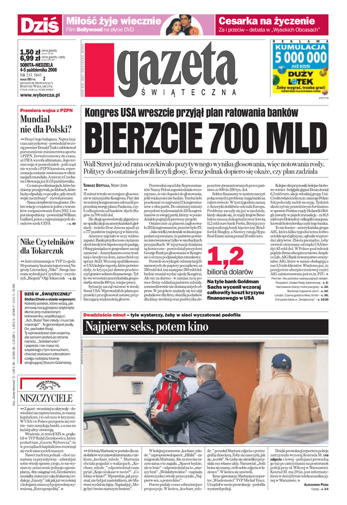Dziś Miłość żyje wiecznie Cesarka na życzenie Film Bollywood na płycie DVD Za i przeciw – debata w „Wysokich Obcasach” gazety 1,50 zł cena 6,99 zł cena gazety i płyty (w tym 7% VAT) (w tym 22% VAT) SOBOTA–NIEDZIELA 4-5 października 2008 NR 233. 5843 NAKŁAD 593 TYS. 2 REDAKTOR PROWADZĄCY BARTOSZ WĘGLARCZYK WYDAJE AGORA SA, NUMER INDEKSU www.wyborcza.pl czas zaryzykować –powiedział wczoraj premier Donald Tusk izablokował porozumienie ministerstwa sportu z PZPN. Zerwał rozmowy do czasu, aż FIFA wycofa ultimatum. Jego termin mija w poniedziałek – jeśli rząd nie wycofa z PZPN kuratora, reprezentacja zostanie zawieszona weliminacjach mundialu. Amecze zCzechami i Słowacją już 11 i 15 października. –Co nam po eliminacjach, które będziemy przegrywali, po klubach, które będą odpadały, co po piłce, gdy strach wejść na trybuny? – mówił premier. –Nasza cierpliwość ma granice. Dobre relacje zrządem to jeden z warunków zorganizowania Euro 2012. I on jest niespełniony –powiedział William Gaillard, jeden znajważniejszych doradców szefa UEFA – s. 40 Nike Czytelników dla Tokarczuk Ceny „Gazety Wyborczej”: D – 1,80 ¤; DK – 16 DKK; GB – 1,20 GBP; L – 1,80 ¤; N – 18 NOK; P – 2,5 ¤; S – 20 SEK 11Jutro (transmisja w TVP 2 o godz. 19) poznamy laureata tegorocznej Nagrody Literackiej „Nike”. Swego laureata wybrali już Czytelnicy –zwyciężyli „Bieguni” Olgi Tokarczuk – s. 11 DZIŚ W „ŚWIĄTECZNEJ” Stefan Chwinostanie wojennym: Kobiety polskie,które widzą,jak zimową nocą grzejesz zziębnięte dłonie przy rozżarzonym koksowniku,współczują ci. „Ach,Boże! Taki młody i musi tak marznąć!”. To generał jest podły. On,pachołek Rosji. Ty wprowadzasz stan wojenny, ale sercem jesteś po stronie narodu,„Solidarności” i papieża i nie masz nic wspólnego z tym komuchem, chociaż stalowym zderzakiem czołgu rozbijasz bramę strajkującej Stoczni Gdańskiej. L A M A Kongres USA wreszcie przyjął plan ratowania banków BIERZCIE 700 MLD Wall Street już od rana oczekiwało pozytywnego wyniku głosowania, więc notowania rosły. Politycy do ostatniej chwili liczyli głosy. Teraz jednak dopiero się okaże, czy plan zadziała TOMASZ DEPTUŁA, NOWY JORK 11 15 minut trwało wczorajsze głosowanie w niższej izbie Kongresu. Pięć dni wcześniej kongresmani odrzucili poprzednią wersję planu Paulsona, czyli odkupienia od banków złych długów za 700 mld dol. Złe długi spowodowały gigantyczne spadki akcji na amerykańskich giełdach – indeks Dow Jonesa spadł aż o 777 punktów (najwięcej w historii). Ameryce zajrzało w oczy widmo zapaści. Banki przytłoczone ciężarem złych kredytów hipotecznych padają. Obieg pieniądza wgospodarce zaczął zamierać –Amerykanom coraz trudniej o kredyt na dom, samochód czy sprzęt AGD. Wczoraj opublikowano wUSA kolejne raporty, które potwierdziły, że kryzys już dawno przekroczył granice sektora finansowego. Tylko we wrześniu amerykańska gospodarka straciła 160 tys. miejsc pracy. Sytuację zaczął ratować w środę Senat USA. Wprowadził do planu poprawki i przegłosował ustawę przytłaczającą większością głosów. Przewodnicząca Izby Reprezentantów Nancy Pelosi zapowiedziała wczoraj rano, że nie dopuści do głosowania, jeśli większości nie będzie. Trzeba było przekonać co najmniej 12 kongresmanów z obu partii. Do ostatniej minuty prezydent wydzwaniał do 133 kongresmanów ze swojej partii, którzy wponiedziałek pogrążyli pierwszy projekt. Ostatecznie za planem zagłosowało 263 kongresmanów, przeciw było 171. –Jako wielki zwolennik wolności gospodarczej uważam, że państwo powinno interweniować tylko wniezbędnych przypadkach. W tej sytuacji działania są konieczne – powiedział prezydent George Bush po głosowaniu wKongresie i od razu podpisał plan ratunkowy. Pozwoli on wykupić od instytucji finansowych złe papiery początkowo za 350 mld dol. (na następne 350 mld dol. będzie musiał wydać zgodę Kongres). Ale nic za darmo – w zamian za tę pomoc firmy oddadzą państwu udziały, amenedżerowie nie dostaną sutych odpraw. W projekcie znalazły się też ulgi podatkowe dla firm, obniżki podatków dla klasy średniej oraz podwyżka de- pozytów gwarantowanych przez państwo ze 100 do 250 tys. dol. Sektor finansowy to system naczyń połączonych iproblemy mają banki na całym świecie. W tym tygodniu zarazę z Ameryki dotkliwie odczuła Europa. Problemy zaczęły się już w niedzielę, kiedy okazało się, że rządy krajów Beneluksu muszą dokapitalizować kwotą 11,2 mld euro bank Fortis, Brytyjczycy nacjonalizują bank hipoteczny Bradford & Bingley, a Niemcy ratują Hypo Real Estate sumą ponad 26 mld euro. 1,2 biliona dolarów Na tyle bank Goldman Sachs wycenił wczoraj całkowity koszt kryzysu finansowego w USA Kolejne dni przynosiły kolejne hiobowe wieści –belgijski gigant Dexia dostał 6,2 mld euro, akcje włoskiej grupy UniCredit (właściciela m.in. naszego Pekao SA) poleciały na łeb na szyję. Tydzień skończył się prawdziwym fortissimo wsprawie Fortisa: rządy Holandii iBelgii zawarły w piątek transakcję – za 16,8 mld euro Holendrzy odkupili iznacjonalizowali holenderską część tego banku. To nie koniec – amerykańska grupa AIG, która kilka tygodni temu ledwo uciekła spod gilotyny, ogłosiła wyprzedaż aktywów. Zbiera pieniądze, żeby zwrócić otrzymany od rządu USA kredyt 85 mld dol. W Polsce pod młotek pójdzie firma ubezpieczeniowa Amplico Life, AIG Bank itowarzystwo emerytalne AIG, które w sumie obsługują u nas 5,5 mln klientów. Wiadomo już, że przejęciem ubezpieczeniowej części AIG zainteresowane jest m.in. PZU. 1 Premier: Nie potrzeba nadzwyczajnych działań. Prezydent: Zwołać Radę Gabinetową – s. 5; Hamowanie branży motoryzacyjnej – s. 33; Bankowe trzęsienie ziemi – s. 34; Londyn. Czarna godzina Mary Smith – s. 35; O kryzysie także w