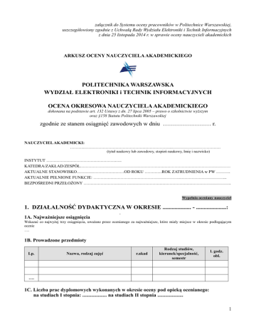 załącznik do Systemu oceny pracowników w Politechnice Warszawskiej, uszczegółowiony zgodnie z Uchwałą Rady Wydziału Elektroniki i Technik Informacyjnych z dnia 25 listopada 2014 r. w sprawie oceny nauczycieli akademickich ARKUSZ OCENY NAUCZYCIELA AKADEMICKIEGO POLITECHNIKA WARSZAWSKA WYDZIAŁ ELEKTRONIKI i TECHNIK INFORMACYJNYCH OCENA OKRESOWA NAUCZYCIELA AKADEMICKIEGO dokonana na podstawie art. 132 Ustawy z dn. 27 lipca 2005 – prawo o szkolnictwie wyższym oraz §158 Statutu Politechniki Warszawskiej zgodnie ze stanem osiągnięć zawodowych w dniu …………………… r. NAUCZYCIEL AKADEMICKI: ……….……………………………………………………..……………………………. (tytuł naukowy lub zawodowy, stopień naukowy, Imię i nazwisko) INSTYTUT ………………………………………….…. KATEDRA/ZAKŁAD/ZESPÓŁ…………………………………………………………………………………………… AKTUALNE STANOWISKO……………………………OD ROKU …………ROK ZATRUDNIENIA w PW ………. AKTUALNIE PEŁNIONE FUNKCJE: …………………………………………………….…………………………... BEZPOŚREDNI PRZEŁOŻONY …………………………………………………………………………………………. Wypełnia oceniany nauczyciel 1. DZIAŁALNOŚĆ DYDAKTYCZNA W OKRESIE ................... - ....................: 1A. Najważniejsze osiągnięcia Wskazać co najwyżej trzy osiągnięcia, uważane przez ocenianego za najważniejsze, które miały miejsce w okresie podlegającym ocenie …. 1B. Prowadzone przedmioty Lp. Nazwa, rodzaj zajęć r.akad Rodzaj studiów, kierunek/specjalność, semestr l. godz. obl. …. 1C. Liczba prac dyplomowych wykonanych w okresie oceny pod opieką ocenianego: na studiach I stopnia: ................... na studiach II stopnia .................... 1 1D. Osiągnięcia w zakresie przygotowania i realizacji procesu dydaktycznego Wyszczególnić: prowadzenie nowych przedmiotów lub nowych form zajęć dydaktycznych, opracowanie nowych, programów studiów bądź modułów kształcenia, kart przedmiotów, koncepcji programowych, założeń programowych studiów podyplomowych, itp., prowadzenie zajęć w języku obcym, prowadzenie zajęć na studiach doktoranckich, kursach i studiach podyplomowych, inne aktywności w procesie dydaktycznym. W przypadku rozszerzeń lub aktualizacji treści bądź unowocześnienia form – sprecyzować, na czym polegały te zmiany. …. 1E. Osiągnięcia w zakresie twórczości dla celów dydaktycznych Załączyć wydruk z systemu Ewidencji Dorobku PW, obejmujący w szczególności dane o: publikacjach podręczników bądź skryptów akademickich, przygotowaniu pomocy dydaktycznych w postaci preskryptów, programów komputerowych, instrukcji do ćwiczeń laboratoryjnych, materiałów pomocniczych do zajęć – zamieszczonych w REPOZYTORIUM PW. Ponadto wskazać inne opracowania dla studentów, doktorantów, uczestników studiów podyplomowych, które nie zostały ujęte w Ewidencji Dorobku PW ani zamieszczone w Repozytorium PW. …. 1E. Osiągnięcia w zakresie pracy ze studentami Wyszczególnić: wyniki ankietyzacji zajęć dydaktycznych i przeprowadzonych hospitacji, uzyskane wyróżnienia za działalność dydaktyczną („złota kreda”, Nagroda JM Rektora PW, inne), pozaprogramową działalność dydaktyczną i wychowawczą. …. 1F. Popularyzacja wiedzy (np. zajęcia z licealistami, pikniki naukowe, olimpiady, publikacje popularyzatorskie) …. 1G. Podnoszenie kwalifikacji zawodowych (np. uzyskanie uprawnień projektowych, studia podyplomowe i staże w obszarach związanych z działalnością zawodową) …. 1H. Osiągnięcia w działalności dydaktycznej, związane z realizacją zadań określonych przez Wydział (Wyliczenie zadań, które Wydział uznaje za istotne z punktu widzenia prowadzonej działalności dydaktycznej) …. 2. DZIAŁALNOŚĆ NAUKOWA I KSZTAŁCENIE KADRY W OKRESIE ................... - .................... ORAZ OGÓLNA CHARAKTERYSTYKA DOROBKU TWÓRCZEGO: 2A. Najważniejsze osiągnięcia w okresie podlegającym ocenie Wskazać co najwyżej trzy osiągnięcia, uważane przez ocenianego za najważniejsze, które miały miejsce w okresie podlegającym ocenie …. 2B. Ogólna charakterystyka dorobku twórczego Tabela A: Zbiorcza charakterystyka dorobku naukowego i w kształceniu kadry w całym okresie pracy A Charakterystyka dorobku w całym okresie pracy 1 Liczba opublikowanych monografii, redakcji monografii 2 Liczba opublikowanych artykułów w czasopismach recenzowanych 3 Liczba recenzowanych publikacji z konferencji, rozdziałów w książkach 2 4 Liczba uzyskanych patentów, zarejestrowanych wzorów przemysłowych i topografii układów scalonych, złożonych wniosków patentowych 5 Liczba wypromowanych doktorów 6 Liczba wykonanych recenzji w postępowaniach o nadanie tytułu profesora, w postępowaniach habilitacyjnych 7 Liczba wykonanych recenzji rozpraw doktorskich 8 Liczba cytowań, wartość H-indeksu - w bazie Google Scholar 9 Liczba cytowani, wartość H-indeksu – w bazie stosowanej w KOJN Dodatkowe informacje opisowe (wg uznania ocenianego nauczyciela akademickiego): …. 2C. Osiągnięcia zaliczane do oceny osiągnięć jednostki naukowej 1) Wydruk z systemu Ewidencji Dorobku PW / Repozytorium PW zawierający: wykaz elementów dorobku nauczyciela wymienionych w wierszach 2 do 5 Tabeli B, uzyskanych w ostatnich 4 latach, oraz wykaz projektów badawczych finansowanych ze źródeł zewnętrznych, w których brał on udział w okresie oceny – załącznik do niniejszego Arkusza oceny. 2) Tabela B: Zbiorcza ocena punktowa aktywności naukowej, w kształceniu kadry i w zakresie materialnych efektów realizacji prac badawczych, w okresie oceny, podawana wg zasad punktacji stosowanej przy kompleksowej ocenie jednostek naukowych (KOJN) B Ocena punktowa (wg KOJN) aktywności naukowej,