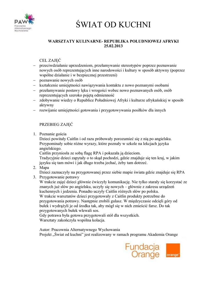 ŚWIAT OD KUCHNI WARSZTATY KULINARNE- REPUBLIKA POŁUDNIOWEJ AFRYKI 25.02.2013 − − − − − − CEL ZAJĘĆ przeciwdziałanie uprzedzeniom, przełamywanie stereotypów poprzez poznawanie nowych osób reprezentujących inne narodowości i kultury w sposób aktywny (poprzez wspólne działanie i w bezpiecznej przestrzeni) poznawanie nowych osób kształcenie umiejętności nawiązywania kontaktu z nowo poznanymi osobami przełamywanie postawy lęku i wrogości wobec nowo poznawanych osób, osób reprezentujących szeroko pojętą odmienność zdobywanie wiedzy o Republice Południowej Afryki i kulturze afrykańskiej w sposób aktywny rozwijanie umiejętności gotowania i przygotowywania posiłków dla innych PRZEBIEG ZAJĘĆ 1. Poznanie gościa Dzieci powitały Caitlin i od razu próbowały porozumieć się z nią po angielsku. Przypominały sobie różne wyrazy, które poznały w szkole na lekcjach języka angielskiego. Caitlin przyniosła ze sobą flagę RPA i pokazała ją dzieciom. Tradycyjnie dzieci zapytały o to skąd pochodzi, gdzie znajduje się ten kraj, w jakim języku się tam mówi i jak długo trzeba jechać, żeby tam dotrzeć. 2. Mapa Dzieci zaznaczyły na przygotowanej przez siebie mapie świata gdzie znajduje się RPA 3. Przygotowanie potrawy W trakcie zajęć dzieci głównie ćwiczyły komunikację. Nie tylko starały się korzystać ze znanych już słów po angielsku, uczyły się nowych – głównie z zakresu urządzeń kuchennych i jedzenia. Ponadto uczyły Caitlin różnych słów po polsku. W trakcie warsztatów dzieci przygotowały z Caitlin produkty potrzebne do przygotowania potrawy. Następnie zrobili gulasz. W międzyczasie odcięli góry od bułek i wydrążyli je od środka tak, aby mógł się w nich zmieścić farsz. Do tak przygotowanych bułek wlewali sos. Gdy potrawa była gotowa przygotowali stół dla wszystkich. Warsztaty zakończyła wspólna kolacja. Autor: Pracownia Alternatywnego Wychowania Projekt „Świat od kuchni” jest realizowany w ramach programu Akademia Orange LISTA UCZESTNIKÓW: 1.Aleksandra Cymer 2.Maciej Kozłowski 3.Paulina Ziółkowska 4.Marta Ziółkowska 5.Bartek Sobuń 6.Marcin Chojnacki 7.Grzegorz Pasikowski 8.Justyna Różalska 9.Paulina Rymkiewicz 10. Franciszek Charliński 11. Aleksandra Zawadowska 12. Paulina Milczarek 13. Ewelina Wieczorek 14. Patrycja Siekiera 15. Karina Lubczyńska 16. Patrycja Kozanecka 17. Hanna Janczak 18. Oliwia Szambelan 19. Julia Szambelan 20. Martyna Milczarek 21. Dawid Nowak 22. Jakub Pilarz 23. Andrzej Kozłowski 24. Ganda Reszka 25.Oliwia Jukiel 26. Dawid Jukiel 27. Gabrysia Budzyńska 28. Miłosz Szambelan 29. Hubert Pilarz 30. Franciszek Janczak 31.Mikołaj Sobuń
