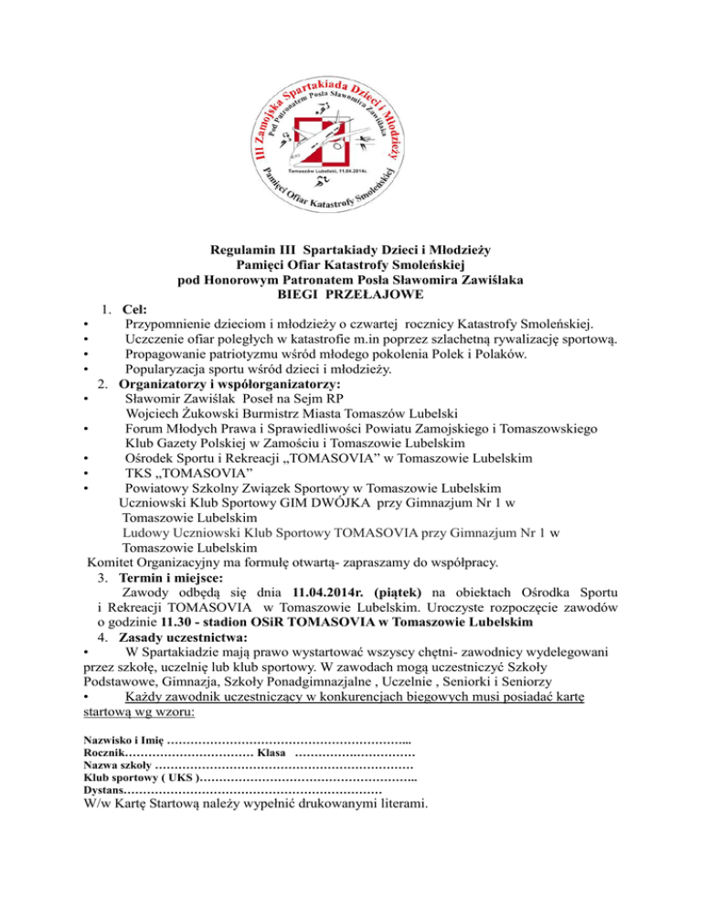 Regulamin III Spartakiady Dzieci i Młodzieży Pamięci Ofiar Katastrofy Smoleńskiej pod Honorowym Patronatem Posła Sławomira Zawiślaka BIEGI PRZEŁAJOWE 1. Cel: • Przypomnienie dzieciom i młodzieży o czwartej rocznicy Katastrofy Smoleńskiej. • Uczczenie ofiar poległych w katastrofie m.in poprzez szlachetną rywalizację sportową. • Propagowanie patriotyzmu wśród młodego pokolenia Polek i Polaków. • Popularyzacja sportu wśród dzieci i młodzieży. 2. Organizatorzy i współorganizatorzy: • Sławomir Zawiślak Poseł na Sejm RP Wojciech Żukowski Burmistrz Miasta Tomaszów Lubelski • Forum Młodych Prawa i Sprawiedliwości Powiatu Zamojskiego i Tomaszowskiego Klub Gazety Polskiej w Zamościu i Tomaszowie Lubelskim • Ośrodek Sportu i Rekreacji „TOMASOVIA” w Tomaszowie Lubelskim • TKS „TOMASOVIA” • Powiatowy Szkolny Związek Sportowy w Tomaszowie Lubelskim Uczniowski Klub Sportowy GIM DWÓJKA przy Gimnazjum Nr 1 w Tomaszowie Lubelskim Ludowy Uczniowski Klub Sportowy TOMASOVIA przy Gimnazjum Nr 1 w Tomaszowie Lubelskim Komitet Organizacyjny ma formułę otwartą- zapraszamy do współpracy. 3. Termin i miejsce: Zawody odbędą się dnia 11.04.2014r. (piątek) na obiektach Ośrodka Sportu i Rekreacji TOMASOVIA w Tomaszowie Lubelskim. Uroczyste rozpoczęcie zawodów o godzinie 11.30 - stadion OSiR TOMASOVIA w Tomaszowie Lubelskim 4. Zasady uczestnictwa: • W Spartakiadzie mają prawo wystartować wszyscy chętni- zawodnicy wydelegowani przez szkołę, uczelnię lub klub sportowy. W zawodach mogą uczestniczyć Szkoły Podstawowe, Gimnazja, Szkoły Ponadgimnazjalne , Uczelnie , Seniorki i Seniorzy • Każdy zawodnik uczestniczący w konkurencjach biegowych musi posiadać kartę startową wg wzoru: Nazwisko i Imię ……………………………………………………... Rocznik…………………………… Klasa …………….…………… Nazwa szkoły ………………………………………………………… Klub sportowy ( UKS )……………………………………………….. Dystans………………………………………………………… W/w Kartę Startową należy wypełnić drukowanymi literami. 5. Zgłoszenia: • Zgłoszenia zbiorowe do konkurencji biegowych podpisane przez Dyrektora Szkoły, Władze Uczelni lub Prezesa Klubu lub oraz lekarza – stwierdzające zdolność do biegów należy dostarczyć w dniu zawodów 11.04.2014r. do godziny 11.00. Biuro Zawodów będzie zlokalizowane na terenie OSiR TOMASOVIA ul. Al. Sportowa 8 22-600 Tomaszów Lubelski Tel. 846659350 . 6. Program zawodów biegowych: • Godzina 10.00-11.15 weryfikacja zgłoszeń. • Godzina 11.30 Uroczyste otwarcie Spartakiady Godz. 12.00 12.05 12.10 12.15 12.20 12.25 12.40 13.45 13.50 13.55 Kl I-III dziewczęta Szkoły Podstawowe Kl I-III chłopcy Szkoły Podstawowe Kl IV dziewczęta Szkoły Podstawowe Kl IV chłopcy Szkoły podstawowe Kl V-VI dziewczęta Szkoły Podstawowe Kl V-VI chłopcy Szkoły Podstawowe 400 m. 400m. 600m. 600m. 600m. 600m. Kl I dziewczęta Gimnazja Kl I chłopcy Gimnazja Kl II -III dziewczęta Gimnazja K II-III chłopcy Gimnazja 600m. 6000m. 6000m. 1000m. 14.00 Kl I-III dziewczęta Szkoły Ponadgimazjalne. 1000m. 14.05 Kl I-III chłopcy Szkoły Ponadgimazjalne. 1000m. 14,10 Studenci 1 000m 14.10 Seniorki 1000m. 14.10 Seniorzy 2000m. •Dekoracja za miejsca I-VI bezpośrednio po zakończeniu biegu. Godzina 14.20 Uroczyste zakończenie zawodów- stadion OSiR w Tomaszowie Lubelskim. 6. Nagrody: • Najlepsze szkoły ( Szkoły Podstawowe, Gimnazja, Szkoły Ponadgimnazjalne, Uczelnie) za zajęcie I-III miejsca w klasyfikacji zespołowej otrzymują puchary. Do klasyfikacji szkół zaliczać będziemy 20 najlepszych wyników na każdym dystansie wg klucza: I miejsce – 20 punktów, II miejsce- 19 punktów, …........................., 20 miejsce- 1 punkt. • Zawodnicy za zajęcie I-III miejsca na każdym dystansie otrzymają okolicznościowe medale oraz nagrody indywidualne. Za zajęcie miejsca I-VI zawodnicy otrzymają dyplomy. 7. Zasady finansowania: • Koszty organizacyjne ponoszą organizatorzy i współorganizatorzy. • Koszty uczestnictwa ponoszą jednostki delegujące startujących zawodników (Szkoły Podstawowe, Gimnazja, Szkoły Ponadgimnazjalne, Uczelnie, Kluby Sportowe). 8. Postanowienie końcowe: Biegi zostaną przeprowadzone bez względu na warunki atmosferyczne. Zawody zostaną przeprowadzone zgodnie z przepisami PZLA. Ubezpieczenie zawodników należy do jednostki delegującej. Serdecznie zapraszamy do wzięcia udziału ORGANIZATORZY REGULAMIN Turnieju Piłki Nożnej rozgrywanego w ramach III Spartakiady Dzieci i Młodzieży Pamięci ofiar Katastrofy Smoleńskiej pod Honorowym Patronatem Posła Sławomira Zawiślaka • • • • I Cel: Przypomnienie dzieciom i młodzieży o czwartej rocznicy Katastrofy Smoleńskiej. Uczczenie ofiar poległych w katastrofie m.in poprzez szlachetną rywalizację sportową. Propagowanie patriotyzmu wśród młodego pokolenia Polek i Polaków. Popularyzacja sportu wśród dzieci i młodzieży. II Organizatorzy i współorganizatorzy: Sławomir Zawiślak Poseł na Sejm RP Wojciech Żukowski Burmistrz Miasta Tomaszów Lubelski • Forum Młodych Prawa i Sprawiedliwości Powiatu Zamojskiego i Tomaszowskiego Klub Gazety Polskiej w Zamościu i Tomaszowie Lubelskim • Ośrodek Sportu i Rekreacji „TOMASOVIA” w Tomaszowie Lubelskim • TKS „TOMASOVIA” • Powiatowy Szkolny Związek Sportowy w Tomaszowie Lubelskim Zamojski Okręgowy Związek Piłki Nożnej w Zamościu Uczniowski Klub Sportowy GIM DWÓJKA przy Gimnazjum Nr 1 w Tomaszowie Lubelskim Ludowy Uczniowski Klub Sportowy TOMASOVIA przy Gimnazjum Nr 1 w Tomaszowie Lubelskim Komitet Organizacyjny ma formułę otwartą- zapraszamy do współpracy. 1. Termin i miejsce: 11.04.2014 r. (PIĄTEK) - OSiR TOMASOVIA ul. Al. Sportowa 8 w Tomaszowie Lubelskim 2. Uczestnictwo: zespoły reprezentujące Szkoły Podstawow