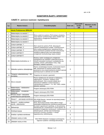 zał. nr 2b KOSZTORYS ŚLEPY / OFERTOWY CZĘŚĆ II - pomoce naukowe i dydaktyczne Lp. Nazwa towaru Charakterystyka Ilość szt. Szkoła Podstawowa BRALIN: 1 Matematyka na wesoło 1 2 Matematyka na wesoło 2 3 Matematyka na wesoło 3 4 Matematyka na wesoło 4 5 Liczę w pamięci 1 6 Liczę w pamięci 2 7 Liczę w pamięci 3 8 Liczę w pamięci 4 9 Liczę w pamięci 5 5 Zbiory zadań do systemu PUS słuŜące utrwalaniu przez dziecko symbolicznego zapisu działań oraz doskonaleniu umiejętności dodawania i odejmowania. 5 5 5 5 Zbiór zasad do systemu PUS, dotyczących czterech podstawowych działań arytmetycznych, które swoją przystępnością i zabawową formą słuŜą poznawaniu podstaw techniki rachunkowej, utrwaleniu pojęcia liczby oraz doskonaleniu umiejętności symbolicznego zapisu działań. 5 5 5 5 10 Matematyka konkretna cz. 1 Zestawy zadań rozwijających umiejętności posługiwania się metodami matematycznymi w róŜnych sytuacjach Ŝyciowych: posługiwania się symetrią, rytmem, jednostkami miary, wagi, pieniądza, znakami rzymskimi 11 Makatka systemu dziesiętnego Pomoc umoŜliwiająca liczenie, ilustrowanie liczb 0999, zamienianie na wyŜsze (niŜsze) rzędy, grupowanie oraz przeprowadzanie prostych operacji arytmetycznych w zakresie od 0 do 999. 5 12 Tangram czterokolorowy – 24 komplety Tangramy do ćwiczeń z geometrii 2 Gra w znaczki Pomoc dydaktyczna do ćwiczeń w dodawaniu, odejmowaniu, mnoŜeniu i dzieleniu liczb wielocyfrowych. Gra w znaczki składa się z drewnianych tafelków w trzech kolorach z nadrukowanymi liczbami 1, 10, 100 i 1000, a takŜe Ŝetonów i pionków. 2 Program edukacyjny EDU ROM 4 Program edukacyjny EDU ROM 4 Program edukacyjny EDU ROM 2 13 14 15 16 17 Matematyka – dodawanie i odejmowanie Matematyka - mnoŜenie i dzielenie Porusz umysł – ćwiczenia matematyczno-pamięciowe Zeszyt 1 - percepcja wzrokowa EDU ROM Zeszyty ćwiczeń do stymulacji prawej i 18 Zeszyt 2 – analiza synteza wzrok., odwrócenia 19 Sekwencje 20 Grafopercepcja 21 Analiza i synteza wzrokowa 22 Układam wzory w koła 23 Układam wzory w linie lewej półkuli mózgu Seria „Stymulacja prawej i lewej półkuli mózgu” zawierająca terapeutyczne ćwiczenia przeznaczone dla dzieci zagroŜonych dysleksją, ze skrzyŜowaną lateralizacją lub z trudnościami w nauce języka, do rozwijania umiejętności wzrokowych, motorycznych, sekwencyjnych, pamięć oraz koordynację wzrokowo-ruchową, przydatne w terapii logopedycznej, reedukacyjnej. EDU ROM Układanki rozwijające postrzeganie, logiczne myślenie i orientację kierunkową. Strona 1 z 3 5 4 4 4 5 5 4 4 Cena jedn. brutto [zł] Wartość brutto [zł] 24 25 Dobieranki ćwiczenia percepcji EDU ROM Ćwiczenia doskonalące percepcję i pamięć wzrokową wzrokowej Ćwiczenia grafomotoryczne 26 Płytka do pisania – linia 27 Płytka do pisania - kratka 28 Alfabet do nawlekania 29 Logopedia – eduSensus – pakiet podstawowy EDU ROM Ćwiczenia do doskonalenie techniki pisania, wyrabianie nawyku prawidłowego posługiwania się narzędziami do rysowania i pisania, wyrabianie umiejętności stopniowego przesuwania ręki piszącej od strony lewej do prawej, w formie 33 kart formatu A4 do kserowania • zapinana teczka EDU ROM Praktyczne czarne płytki do pisania białymi kredkami (zmywana na mokro). Z jednej strony nadrukowana liniatura lub kratka do kreślenia liter i cyfr, natomiast rewers czarny – do swobodnego pisania lub rysowania. Wymiar 24 x 20 cm 5 5 10 10 EDU ROM ss. 335 Zestaw literek z tworzywa (wys. 3, 2 cm) • 5 kolorowych sznurków • 60 dwustronnych kart (wy m. 5,5 x 18 cm) • z zamykanym pudełkiem Pakiet podstawowy 5 programów logopedycznych w skład którego wchodzą: Szereg ciszący, Szereg syczący, Szereg szumiący, RóŜnicowanie szeregów, Głoska „r” • Aplikacja logopedy i mikrofon 2 1 RAZEM BRUTTO Bralin: Zespół Szkół NOWA WIEŚ KSIĄśĘCA: 30 Muzyczne dzwonki chromatyczne (cymbałki) 10 Przystawka interaktywna 31 Współpracująca z kaŜdą białą tablicą 2x3 oraz z dowolnym projektorem. Pióro z wbudowanym wskaźnikiem laserowym oraz przyciskami funkcyjnymi: Lewy i Prawy klawisz myszy. Połączenie USB Plug and Play. W przystawce: technologia podczerwieni i ultradźwięków. W zestawie: pióro cyfrowe, uchwyt mocujący, oprogramowanie na CD. Gwarancja: 24 miesiące 1 32 Domino logopedyczne obrazkowo – wyrazowe szereg L - R 1 33 Domino logopedyczne obrazkowo – wyrazowe szereg J – R 1 34 Domino logopedyczne obrazkowo – wyrazowe szereg L– J 1 35 Domino logopedyczne obrazkowo – wyrazowe szereg L– J. szereg sz – cz, Ŝ - dŜ 1 36 Puzzle logopedyczne s – z- c -ć -dź 1 37 Puzzle logopedyczne j-ł-ch-n-m 1 38 Łamigłówki logopedyczne - junior 1 39 EduROM Matematyka na wesoło Stare zamczysko 1 40 EduROM Matematyka na wesoło Wyspa skarbów 1 41 EduROM Matematyka na wesoło Niezwykłe wakacje 1 42 EduROM Matematyka na wesoło ZOO 1 Strona 2 z 3 43 Multimedialna gra edukacyjna Młody Eistein -rozwijamy inteligencję 1 44 Multimedialna gra edukacyjna Młody Eistein -rozwijamy wyobraźnię 1 45 Multimedialna gra edukacyjna Młody Eistein - sprawny umysł 1 46 Program komputerowy –logopedyczne zabawy część III ś – ź - ć - dź 1 47 Program komputerowy - logopedyczne zabawy część V mowa bezdźwięczna 1 48 Program komputerowy - logopedyczne zabawy część VI – róŜnicowanie szeregów 1 49 Program komputerowy - logopedyczne zabawy część VII – słuch fonemowy 1 RAZEM BRUTTO Nowa Wieś KsiąŜęca: RAZEM BRUTTO całość zamówienia (Bralin + Nowa Wieś Ks.): Strona 3 z 3