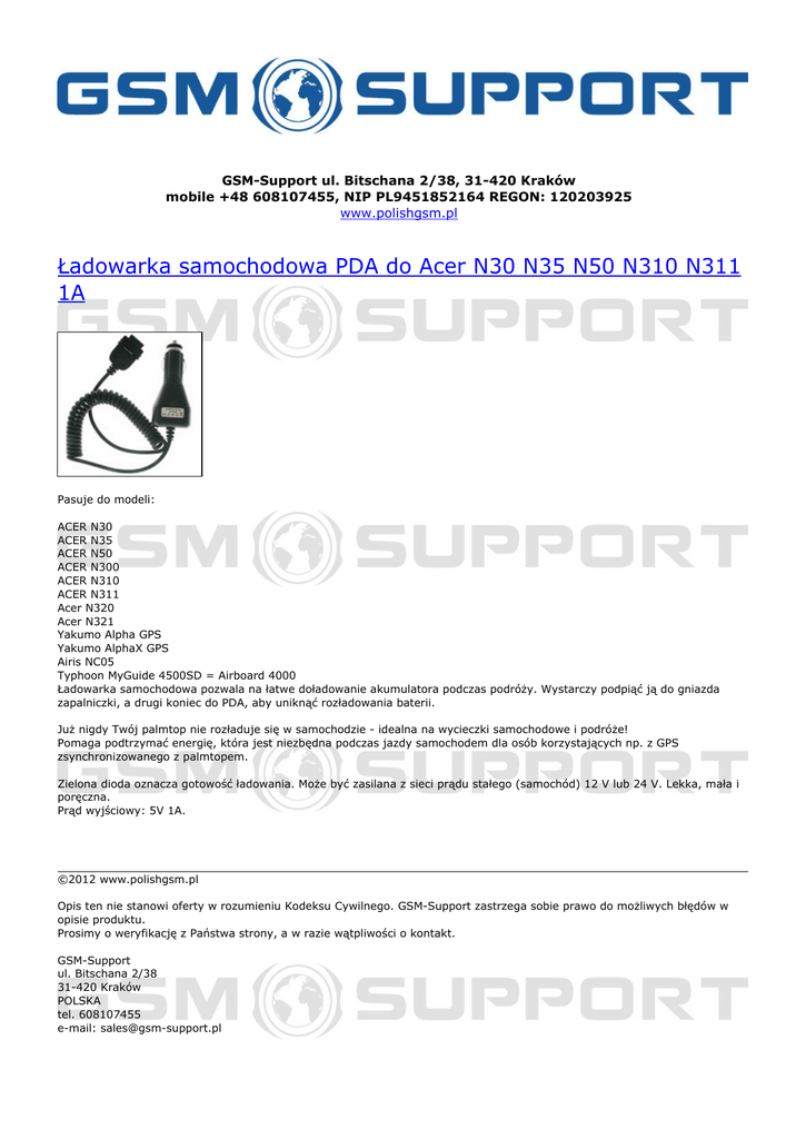 GSM-Support ul. Bitschana 2/38, 31-420 Kraków mobile +48 608107455, NIP PL9451852164 REGON: 120203925 www.polishgsm.pl Ładowarka samochodowa PDA do Acer N30 N35 N50 N310 N311 1A Pasuje do modeli: ACER N30 ACER N35 ACER N50 ACER N300 ACER N310 ACER N311 Acer N320 Acer N321 Yakumo Alpha GPS Yakumo AlphaX GPS Airis NC05 Typhoon MyGuide 4500SD = Airboard 4000 Ładowarka samochodowa pozwala na łatwe doładowanie akumulatora podczas podróży. Wystarczy podpiąć ją do gniazda zapalniczki, a drugi koniec do PDA, aby uniknąć rozładowania baterii. Już nigdy Twój palmtop nie rozładuje się w samochodzie - idealna na wycieczki samochodowe i podróże! Pomaga podtrzymać energię, która jest niezbędna podczas jazdy samochodem dla osób korzystających np. z GPS zsynchronizowanego z palmtopem. Zielona dioda oznacza gotowość ładowania. Może być zasilana z sieci prądu stałego (samochód) 12 V lub 24 V. Lekka, mała i poręczna. Prąd wyjściowy: 5V 1A. ©2012 www.polishgsm.pl Opis ten nie stanowi oferty w rozumieniu Kodeksu Cywilnego. GSM-Support zastrzega sobie prawo do możliwych błędów w opisie produktu. Prosimy o weryfikację z Państwa strony, a w razie wątpliwości o kontakt. GSM-Support ul. Bitschana 2/38 31-420 Kraków POLSKA tel. 608107455 e-mail: [email protected] Powered by TCPDF (www.tcpdf.org)