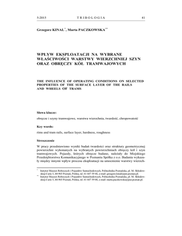 5-2015 TRIBOLOGIA 41 Grzegorz KINAL *, Marta PACZKOWSKA ** WPŁYW EKSPLOATACJI NA WYBRANE WŁAŚCIWOŚCI WARSTWY WIERZCHNIEJ SZYN ORAZ OBRĘCZY KÓŁ TRAMWAJOWYCH THE INFLUENCE OF OPERATING CONDITIONS ON SELECTED PROPERTIES OF THE SURFACE LAYER OF THE RAILS AND WHEELS OF TRAMS Słowa klucze: obręcze i szyny tramwajowe, warstwa wierzchnia, twardość, chropowatość Key words: rims and tram rails, surface layer, hardness, roughness Streszczenie W pracy przedstawiono wyniki badań twardości oraz struktury geometrycznej powierzchni wykonanych na wybranych powierzchniach obręczy kół i szyn tramwajowych. Pojazdy, których obręcze badano, należały do Miejskiego Przedsiębiorstwa Komunikacyjnego w Poznaniu Spółka z o.o. Badania wykazały między innymi wpływ procesu eksploatacji na umocnienie warstwy wierzch* ** Instytut Maszyn Roboczych i Pojazdów Samochodowych, Politechnika Poznańska, pl. M. Skłodowskiej-Curie 5, 60-965 Poznań, Polska, tel. 61 647 59 46, e-mail: [email protected]. Instytut Maszyn Roboczych i Pojazdów Samochodowych, Politechnika Poznańska, pl. M. Skłodowskiej-Curie 5, 60-965 Poznań, Polska, tel. 61 647 59 06, e-mail: [email protected]. 42 TRIBOLOGIA 5-2015 niej obręczy i badanych szyn oraz zmiany chropowatości powierzchni tocznej w stosunku do wierzchołka obrzeża obręczy w wyniku eksploatacji. WPROWADZENIE Transport tramwajowy stanowi ważne ogniwo transportu w aglomeracji miasta. O właściwym funkcjonowaniu tego ogniwa decyduje wiele czynników. Jednak biorąc pod uwagę procesy związane z samą eksploatacją techniczną obiektu, zasadnicze znaczenie ma utrzymanie właściwego stanu technicznego elementów, dalej zespołów i w konsekwencji całego skomplikowanego obiektu. W czasie eksploatacji elementów współpracujących w warunkach tarcia tocznego może dochodzić do lokalnego umocnienia ich warstwy wierzchniej [L. 4, 6]. Utwardzenie w obszarze warstwy wierzchniej jest niezwykle istotne dla procesów zużycia zarówno obręczy koła tramwajowego, jak i współpracującej z nim szyny [L. 1]. Badania wskazują, że twardość materiału obręczy koła powinna być większa o około 20% od twardości szyny. W takim przypadku stwierdza się najmniejsze zużycie obu elementów stanowiących parę cierną [L. 6]. Biorąc pod uwagę parę trącą w postaci obręczy i szyny tramwajowej, należy zauważyć, że w czasie eksploatacji mogą następować zmiany struktury geometrycznej powierzchni współpracujących ze sobą elementów, a to z kolei może mieć wpływ na przebieg procesu zużywania pary trącej. Zmiany parametrów struktury geometrii powierzchni tarcia mogą również być oznaką zmian, które zaszły w warstwie wierzchniej elementu – na przykład miejscowego utwardzenia lub procesu powierzchniowego zużywania zmęczeniowego (w wyniku, którego doszło do powierzchniowych ubytków materiału) [L. 2]. Dla taboru kolejowego prowadzone są pomiary chropowatości szyn [L. 5] i wydaje się, że taka diagnostyka byłaby słuszna również w przypadku taboru tramwajowego [L. 2, 3] – nie tylko szyn, a również obręczy i to w trakcie ich pracy. Celem badań była ocena wpływu procesu eksploatacji szyn oraz obręczy kół tramwajowych na twardość i chropowatość ich warstwy wierzchniej. METODYKA BADAŃ Obiektami badań były szyna, gdzie część powierzchni tocznej główki była napawana (dwa fragmenty) oraz obręcze kół tramwajowych eksploatowane przez Miejskie Przedsiębiorstwo Komunikacyjne w Poznaniu Spółka z o. o. Badane obręcze tramwajowe pochodziły z pojazdów: Solaris Tramino S105P, Siemens Combino, Moderus Beta MF 02 AC, Konstal 105N, Düewag GT8. Badaniom poddano także fragmenty szyn tramwajowych Ri60N zdemontowanych z odcinka prostego wcześniej eksploatowanego. Obręcze tramwajowe osadzone były wcześniej na kole bosym, tym samym obydwa elementy stanowiły część zestawu kołowego wózka napędowego znajdu- 5-2015 TRIBOLOGIA 43 jącego się na przodzie skrajnego członu pojazdu. Badano po dwie obręcze dla każdego pojazdu, zdementowane z tego samego wózka napędowego, z kół będących po tej samej stronie pojazdu, jednak na dwóch różnych osiach (Rys. 1). II I Rys. 1. Schematyczne przedstawianie położenia kół z badanymi obręczami w wózku tramwaju wraz z przyjętymi oznaczeniami Fig. 1. Schematic representation of the position of the wheel rims studied in a wheelchair tram with the approved indications Prowadząc badania, należało uzyskać próbki z badanych obiektów. W tym celu wycięto z otrzymanych szyn oraz obręczy tramwajowych stosowne fragmenty. Wygląd próbek do badań po ich wycięciu z dostarczonych elementów przedstawiono na Rysunku 2. a) b) Rys. 2. Wygląd próbek do badań wyciętych z: a) szyny tramwajowej, b) obręczy tramwajowej Fig. 2. Appearance of the test pieces cut from: a) a tram rail, b) of the rim of tram W kolejnym etapie badań wybrano miejsca przeprowadzenia pomiarów twardości oraz struktury geometrycznej powierzchni (chropowatości) metodą profilową. Pomiary twardości wykonano na powierzchni tocznej, wierzchołku obrzeża i płaszczyźnie czołowej wewnętrznej obręczy. W przypadku szyny wykonano pomiary powierzchni tocznej główki oraz wewnętrznej powierzchni kołnierza rowka szyny. Miejsce położenia obszarów pomiarowych przedstawiono na Rysunku 3. Ponadto w przypadku badania twardości wykonano także 44 TRIBOLOGIA 5-2015 pomiary materiału rodzimego obręczy i szyny. W każdym miejscu pomiaru wykonano sześć pomiarów twardości, które następnie uśredniano. D C A A B C D E B E Miejsce wykonania pomiaru w materiale rodzimym Miejsce wykonania pomiaru w materiale rodzimym Kierunki wykonania profili w danym miejscu pomiarowym a) Kierunki wykonania profili w danym miejscu pomiarowym b) Rys. 3. Schemat rozmieszczenia miejsc wykonania pomiarów twardości HV 10 oraz profili chropowatości powierzchni dla badanych próbek: a) obręczy (A, B, C – powierzchnia to