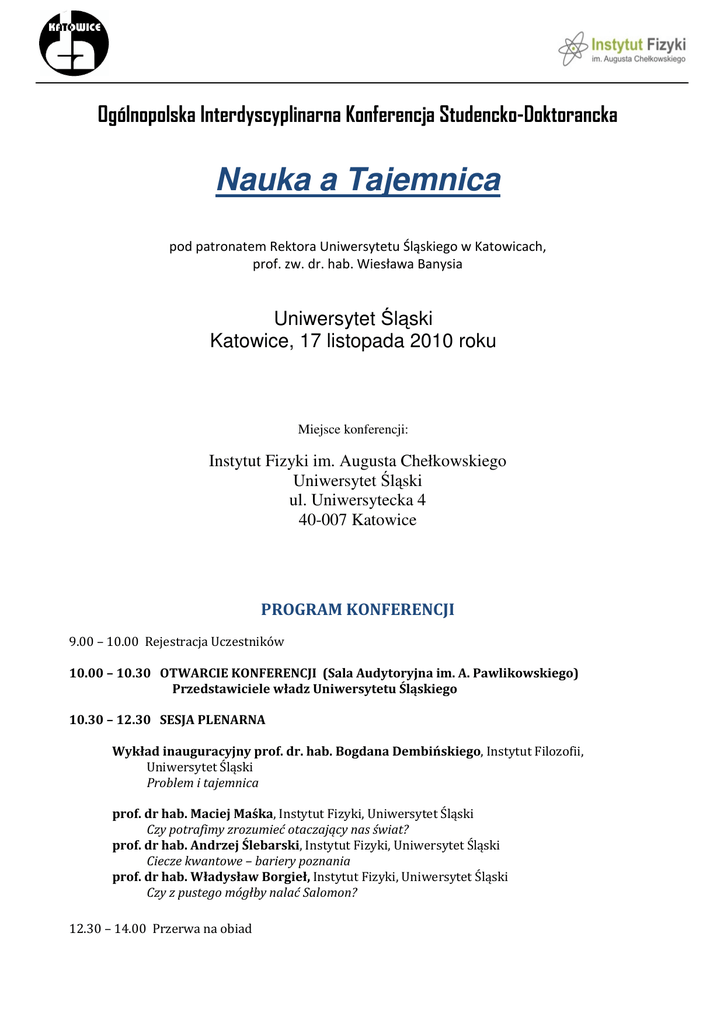 Ogólnopolska Interdyscyplinarna Konferencja Studencko-Doktorancka Nauka a Tajemnica pod patronatem Rektora Uniwersytetu Śląskiego w Katowicach, prof. zw. dr. hab. Wiesława Banysia Uniwersytet Śląski Katowice, 17 listopada 2010 roku Miejsce konferencji: Instytut Fizyki im. Augusta Chełkowskiego Uniwersytet Śląski ul. Uniwersytecka 4 40-007 Katowice PROGRAM KONFERENCJI 9.00 – 10.00 Rejestracja Uczestników 10.00 – 10.30 OTWARCIE KONFERENCJI (Sala Audytoryjna im. A. Pawlikowskiego) Przedstawiciele władz Uniwersytetu Śląskiego 10.30 – 12.30 SESJA PLENARNA Wykład inauguracyjny prof. dr. hab. Bogdana Dembińskiego, Instytut Filozofii, Uniwersytet Śląski Problem i tajemnica prof. dr hab. Maciej Maśka, Instytut Fizyki, Uniwersytet Śląski Czy potrafimy zrozumieć otaczający nas świat? prof. dr hab. Andrzej Ślebarski, Instytut Fizyki, Uniwersytet Śląski Ciecze kwantowe – bariery poznania prof. dr hab. Władysław Borgieł, Instytut Fizyki, Uniwersytet Śląski Czy z pustego mógłby nalać Salomon? 12.30 – 14.00 Przerwa na obiad 14.00 – 15.30 SESJE RÓWNOLEGŁE SESJA 1 (s. 161) SESJA 2 (s. 162) 14. 00 14.00 14.15 14.30 14.45 15.00 15.15 mgr Małgorzata Turska, Uniwersytet Śląski Czy osobowość człowieka jest poznawalna? Podmiotowość jako próba uchwycenia unikalności jednostki Tomasz Burdzik, Uniwersytet Śląski Granice poznania psychologa mgr Mariola Paruzel, Uniwersytet Śląski Od Platona do Feyerabenda czyli o kłopotach współczesnej psychologii (i nie tylko) mgr Jolanta Rypień – Wilczek, Uniwersytet Śląski Zmysły ludzkie – niedoskonałe narzędzia odkrywania tajemnic rzeczywistości mgr Justyna Wojciechowska, Uniwersytet Marii Curie-Skłodowskiej w Lublinie Jak porozumieć się z kimś, kto prawie nie mówi? - Tajemnice komunikacji dziecka z alalią prolongatą. Dyskusja 14.15 14.30 14.45 15.00 15.15 mgr Michał Kosche, KUL Ten niewypowiedziany językiem Bóg. Apofatyczność i katafatyczność Języka. Rafał Zawisza, Uniwersytet Warszawski Między dydaktyką a pornografią, czyli o szansach na ocalenie Tajemnicy poprzez dyskurs religijny. mgr Anna Maliszewska, Uniwersytet Śląski Nowe metafory Boga w teologii feministycznej jako próba wyrażenia „Niewyrażalnego/nej” Marek Dziekan, Uniwersytet Łódzki Nicolai Hartmanna teoria irracjonalności Przemysław Dzięgielewski, Uniwersytet Mikołaja Kopernika w Toruniu Henryk Elzenberg wobec mistyki Dyskusja 15.30 – 16.00 Przerwa na kawę 16.00 – 17.30 SESJE RÓWNOLEGŁE SESJA 3 (s. 161) SESJA 4 (s. 162) 16.00 16.00 16.15 16.30 16.45 17.00 17.15 mgr Alicja Lizurej, Szkoła Wyższa Psychologii Społecznej w Warszawie Swoi a obcy-czy możliwe jest poznanie innego? mgr Ewa Cudzich, Uniwersytet Śląski Antropologiczne odkrywanie tajemnicy Innego Magdalena Mikrut, Uniwersytet Śląski Inny jako jedna z postaci dialogu człowieka z Bogiem i kulturą Magdalena Bisz, Uniwersytet Śląski Tajemnica sacrum a rzeczywistość ponowoczesna Grzegorz Wróbel, Uniwersytet Humanistyczno-Przyrodniczy Jana Kochanowskiego w Kielcach Czy to jeszcze człowiek, czy tylko „eksponat”? Dyskusja 16.15 16.30 16.45 17.00 17.30 PODSUMOWANIE KONFERENCJI (Sala Audytoryjna II) 18.00 Zakończenie mgr Agata Hajda, Uniwersytet Śląski Wizerunek „innego” w legendach oraz baśniach śląskich mgr Marta Wierzbicka, Uniwersytet Warszawski Między przejrzystością a przeszkodą: Poznanie tajemnicy w „Rękopisie znalezionym w Saragossie” Jana Potockiego Kamila Czaja, Uniwersytet Śląski Uczłowieczenie Boga a Jego Tajemnica. O „Śniadaniu z Bogiem” Jacka Kaczmarskiego mgr Agnieszka Niewiara, Uniwersytet Śląski Epifanie negatywne. Interpretacja świadectw granicy wyrażalności w późnej poezji Julii Hartwig Dyskusja