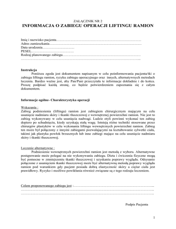 ZAŁĄCZNIK NR 2 INFORMACJA O ZABIEGU OPERACJI LIFTINGU RAMION Imię i nazwisko pacjenta……………………………………………………………… Adres zamieszkania…………………………………………………………………… Data urodzenia……………………… PESEL……………………………… Rodzaj planowanego zabiegu………………………………………………………… ………………………………………………………………………………………... Instrukcja Poniższa zgoda jest dokumentem napisanym w celu poinformowania pacjenta/tki o zabiegu liftingu ramion, ryzyku zabiegu operacyjnego oraz innych, alternatywnych metodach leczenia. Bardzo ważne jest, aby Pan/Pani przeczytała te informacje dokładnie i do końca. Proszę podpisać każdą stronę, co będzie potwierdzeniem zapoznania się z całym dokumentem. Informacje ogólne- Charakterystyka operacji Wskazania : Zabieg podniesienia (liftingu) ramion jest zabiegiem chirurgicznym mającym na celu usunięcie nadmiaru skóry i tkanki tłuszczowej z wewnętrznej powierzchni ramion. Nie jest to zabieg wykonywany w celu usunięcia nadwagi. Ludzie otyli powinni wykonać ten zabieg dopiero po schudnięciu, kiedy uzyskają stałą wagę. Istnieją różne techniki stosowane przez chirurgów plastyków w celu wykonania liftingu wewnętrznych powierzchni ramion. Zabieg ten może był połączony z innymi zabiegami pozwalającymi na kształtowanie sylwetki ciała, takimi jak plastyka powłok brzusznych lub inne zabiegi mające na celu usunięcie nadmiaru skóry i tkanki tłuszczowej. Leczenie alternatywne : Podniesienie wewnętrznych powierzchni ramion jest metodą z wyboru. Alternatywne postępowanie może polegać na nie wykonywaniu zabiegu. Dieta i ćwiczenia fizyczne mogą być pomocne w zmniejszeniu tkanki tłuszczowej i uzyskaniu poprawy wyglądu. Odsysanie połączone z usunięciem tkanki tłuszczowej może być alternatywną metodą poprawy wyglądu ramion pod warunkiem gdy pacjent posiada dobrą elastyczność skóry a ciężar ciała jest prawidłowy. Ryzyko i możliwe powikłania również związane są z tego rodzaju leczeniem. Celem proponowanego zabiegu jest :…………………………………………………………... ………………………………………………………………………………………………….. ………………………………………………………………………………………………….. Podpis Pacjenta 1 Dające się przewidzieć następstwa zabiegu : 1. Blizny – Każde postępowanie chirurgiczne powoduje powstawanie blizn, które czasami nie są ładne. Nieprawidłowe blizny mogą występować na powierzchni skóry i tkankach położonych głębiej. Blizny mogą mieć kolor różniący się od koloru otaczającej skóry. W celu korekcji tych blizn może być konieczna dodatkowa operacja. 2. Asymetria – Pewna asymetria ramion występuje u większości ludzi. Różnice w wyglądzie lub symetrii może także występować po operacji. Dodatkowa operacja może być konieczna w celu poprawy asymetrii. 3. Przebarwienia skóry/obrzęk – zasinienia skóry i obrzęk zawsze występują normalnie po operacji liftingu ramion. Skóra w operowanej okolicy może wydawać się jaśniejsza lub ciemniejsza niż otaczająca skóra. Rzadko zdarza się jednak, że to przebarwienie skóry może utrzymywać się przez długi okres czasu lub może pozostać na zawsze. 4. Nierówności widoczne na powierzchni skóry – Nierówności widoczne na skórze oraz widoczne zagłębienia mogą występować po zabiegu. Ponadto może występować pofałdowanie skóry lub jej zmarszczenie. Po pewnym czasie może to ulec poprawie lub wymagać dodatkowej operacji. 5. Odległe wyniki – Zmiany kształtu ciała mogą być związane z wiekiem, odchudzaniem się lub tyciem, ciążą lub z innymi zmianami w organizmie zachodzącymi niezależnie od przebytej wcześniej operacji. 6. Ból – Po operacji może występować ból o różnym nasileniu. Przewlekły ból występuje rzadko i związany jest zazwyczaj z pociąganiem nerwów przez powstającą bliznę. Po lekach przeciwbólowych nie wolno prowadzić samochodu, nie wolno podejmować ważnych decyzji, nie wolno pić alkoholu. Czynniki ryzyka związane z liftingiem ramion Każde leczenie operacyjne obejmuje pewną ilość czynników ryzyka i jest bardzo ważne zrozumienie ryzyka związanego z zabiegiem liftingu ramion. Podjęcie decyzji o wykonaniu zabiegu jest sprawą indywidualną i polega na porównaniu ryzyka z możliwą poprawą wyglądu ramion. Każde leczenie operacyjne obejmuje pewną ilość czynników ryzyka, stąd niezwykle istotne jest zrozumienie ryzyka związanego z zabiegiem. Pomimo, że większość pacjentów nie ma własnych doświadczeń z niżej wymienionymi powikłaniami, powinno się je omówić z chirurgiem plastykiem, aby uzyskać pewność co do podjęcia właściwej decyzji i w pełni zrozumieć ryzyko, potencjalne powikłania i konsekwencje operacji. Poniżej zostały przedstawione dotychczas stwierdzone naukowo przypadki możliwych objawów ubocznych lub powikłań związanych z operacją liftingu ramion. 1. Krwawienie – występuje rzadko. Jest możliwe w trakcie lub po operacji. Jeżeli występuje krwawienie pooperacyjne, może wymagać natychmiastowego leczenia w celu zapobiegnięcia powstawaniu krwiaka lub transfuzji. Aby zmniejszyć ryzyko wystąpienia krwawienia nie można zażywać aspiryny i leków przeciwzapalnych co najmniej 21 dni przed planowanym zabiegiem. Niektóre zioła i suplementy diety mogą zwiększać ryzyko powstania krwawienia. Leki przeciwzakrzepowe zawierające heparynę mogą również wywołać krwawienie i obniżyć poziom płytek krwi. Podpis Pacjenta 2 2. Infekcja – jest bardzo rzadkim powikłaniem po tego typu operacji. Jeśli wystąpi infekcja leczenie polega na podawaniu antybiotyków. Jeżeli infekcj
