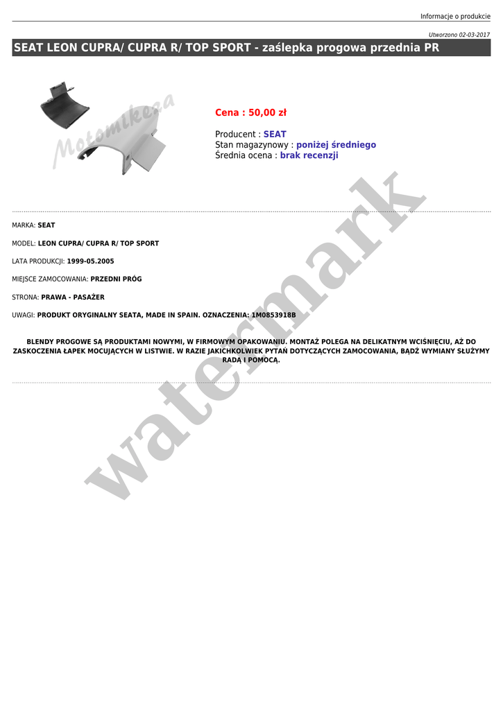 Informacje o produkcie Utworzono 02-03-2017 SEAT LEON CUPRA/ CUPRA R/ TOP SPORT - zaślepka progowa przednia PR Cena : 50,00 zł MARKA: SEAT er m ar k Producent : SEAT Stan magazynowy : poniżej średniego Średnia ocena : brak recenzji MODEL: LEON CUPRA/ CUPRA R/ TOP SPORT LATA PRODUKCJI: 1999-05.2005 MIEJSCE ZAMOCOWANIA: PRZEDNI PRÓG STRONA: PRAWA - PASAŻER UWAGI: PRODUKT ORYGINALNY SEATA, MADE IN SPAIN. OZNACZENIA: 1M0853918B w at BLENDY PROGOWE SĄ PRODUKTAMI NOWYMI, W FIRMOWYM OPAKOWANIU. MONTAŻ POLEGA NA DELIKATNYM WCIŚNIĘCIU, AŻ DO ZASKOCZENIA ŁAPEK MOCUJĄCYCH W LISTWIE. W RAZIE JAKICHKOLWIEK PYTAŃ DOTYCZĄCYCH ZAMOCOWANIA, BĄDŹ WYMIANY SŁUŻYMY RADĄ I POMOCĄ.