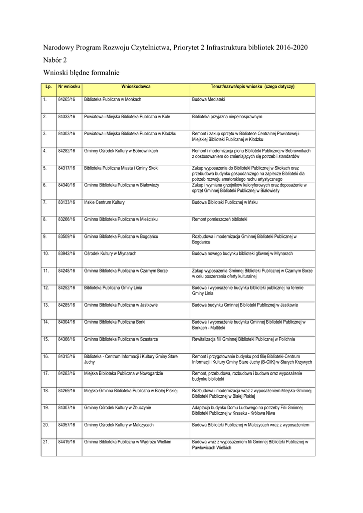 Narodowy Program Rozwoju Czytelnictwa, Priorytet 2 Infrastruktura bibliotek 2016-2020 Nabór 2 Wnioski błędne formalnie Lp. Nr wniosku Wnioskodawca Temat/nazwa/opis wniosku (czego dotyczy) 1. 84265/16 Biblioteka Publiczna w Mońkach Budowa Mediateki 2. 84333/16 Powiatowa i Miejska Biblioteka Publiczna w Kole Biblioteka przyjazna niepełnosprawnym 3. 84303/16 Powiatowa i Miejska Biblioteka Publiczna w Kłodzku Remont i zakup sprzętu w Bibliotece Centralnej Powiatowej i Miejskiej Biblioteki Publicznej w Kłodzku 4. 84282/16 Gminny Ośrodek Kultury w Bobrownikach Remont i modernizacja pionu Biblioteki Publicznej w Bobrownikach z dostosowaniem do zmieniających się potrzeb i standardów 5. 84317/16 Biblioteka Publiczna Miasta i Gminy Skoki 6. 84340/16 Gminna Biblioteka Publiczna w Białowieży Zakup wyposażenia do Biblioteki Publicznej w Skokach oraz przebudowa budynku gospodarczego na zaplecze Biblioteki dla potrzeb rozwoju amatorskiego ruchu artystycznego Zakup i wymiana grzejników kaloryferowych oraz doposażenie w sprzęt Gminnej Biblioteki Publicznej w Białowieży 7. 83133/16 Ińskie Centrum Kultury Budowa Biblioteki Publicznej w Ińsku 8. 83266/16 Gminna Biblioteka Publiczna w Mieścisku Remont pomieszczeń biblioteki 9. 83509/16 Gminna Biblioteka Publiczna w Bogdańcu Rozbudowa i modernizacja Gminnej Biblioteki Publicznej w Bogdańcu 10. 83942/16 Ośrodek Kultury w Młynarach Budowa nowego budynku biblioteki głównej w Młynarach 11. 84248/16 Gminna Biblioteka Publiczna w Czarnym Borze Zakup wyposażenia Gminnej Biblioteki Publicznej w Czarnym Borze w celu poszerzenia oferty kulturalnej 12. 84252/16 Biblioteka Publiczna Gminy Linia Budowa i wyposażenie budynku biblioteki publicznej na terenie Gminy Linia 13. 84285/16 Gminna Biblioteka Publiczna w Jastkowie Budowa budynku Gminnej Biblioteki Publicznej w Jastkowie 14. 84304/16 Gminna Biblioteka Publiczna Borki Budowa i wyposażenie budynku Gminnej Biblioteki Publicznej w Borkach - Multiteki 15. 84366/16 Gminna Biblioteka Publiczna w Szastarce Rewitalizacja filii Gminnej Biblioteki Publicznej w Polichnie 16. 84315/16 Biblioteka - Centrum Informacji i Kultury Gminy Stare Juchy Remont i przygotowanie budynku pod filię Biblioteki-Centrum Informacji i Kultury Gminy Stare Juchy (B-CIiK) w Starych Krzywych 17. 84283/16 Miejska Biblioteka Publiczna w Nowogardzie Remont, przebudowa, rozbudowa i budowa oraz wyposażenie budynku biblioteki 18. 84269/16 Miejsko-Gminna Biblioteka Publiczna w Białej Piskiej Rozbudowa i modernizacja wraz z wyposażeniem Miejsko-Gminnej Biblioteki Publicznej w Białej Piskiej 19. 84307/16 Gminny Ośrodek Kultury w Zbuczynie Adaptacja budynku Domu Ludowego na potrzeby Filii Gminnej Biblioteki Publicznej w Krzesku - Królowa Niwa 20. 84357/16 Gminny Ośrodek Kultury w Malczycach Budowa Biblioteki Publicznej w Malczycach wraz z wyposażeniem 21. 84419/16 Gminna Biblioteka Publiczna w Wądrożu Wielkim Budowa wraz z wyposażeniem fili Gminnej Biblioteki Publicznej w Pawłowicach Wielkich 22. 84351/16 Gminna Biblioteka Publiczna w Pokrzywnicy Adaptacja, rozbudowa i wyposażenie istniejącego budynku przemysłowego na potrzeby utworzenia nowej siedziby Gminnej Biblioteki Publicznej w Pokrzywnicy Budowa Biblioteki Głównej w Krzeszowicach 23. 84361/16 Miejsko-Gminna Biblioteka Publiczna w Krzeszowicach 24. 84413/16 Miejska Biblioteka Publiczna Środa Wielkopolska 25. 84423/16 Gminna Biblioteka Publiczna w Sieroszewicach Budowa Budynku Biblioteki i Klubu Seniora w Strzyżewie 26. 84441/16 Miejska Biblioteka Publiczna Limanowa Przebudowa i Rozbudowa Budynku przy ul. Czecha w Limanowej dla potrzeb Miejskiej Biblioteki 27. 84335/16 Biblioteka Samorządowa w Zelgnie Przebudowa lokalu oraz zakup wyposażenia dla filii bibliotecznej w miejscowości Głuchowo 28. 84422/16 Biblioteka Publiczna Gminy i Miasta w Strzyżowie Zakup i montaż wyposażenia do Biblioteki Publicznej oraz Parku Literackiego w Strzyżowie 29. 84392/16 Biblioteka Publiczna Miasta i Gminy Krosno Odrzańskie 30. 84436/16 Miejska Biblioteka Publiczna w Cieszanowie Multimedialna biblioteka dla wszystkich - podniesienie jakości świadczenia usług poprzez przeniesienie Biblioteki Publicznej w Krośnie Odrzańskim do nowego, w pełni wyposażonego obiektu. Biblioteka - mechanik rzeczywistości czyli wkraczamy w XXI wiek z czytelnikiem pod rękę. 31. 84412/16 Miejska Biblioteka Publiczna w Sandomierzu Przebudowa i nadbudowa Miejskiej Biblioteki w Sandomierzu 32. 84376/16 Gminny Ośrodek Informacji, Kultury i Czytelnictwa w Zębowicach Remont i modernizacja Biblioteki Gminnej w Zębowicach 33. 84425/16 Gminne Centrum Kultury i Czytelnictwa w Jodłowej Przebudowa gminnej biblioteki w Jodłowej 34. 84440/16 Biblioteka Publiczna Gminy Wejherowo Przebudowa budynku dawnej szkoły na Filię Biblioteczną w miejscowości Bieszkowice 35. 84390/16 Gminna Biblioteka Publiczna Fabianki Budowa Gminnej Biblioteki Publicznej w Fabiankach 36. 84406/16 Gminna Biblioteka Publiczna w Kotuniu Remont, przebudowa oraz wyposażenie Gminnej Biblioteki Publicznej w Kotuniu Rozbudowa Miejskiej Biblioteki Głównej w Środzie Wielkopolskiej