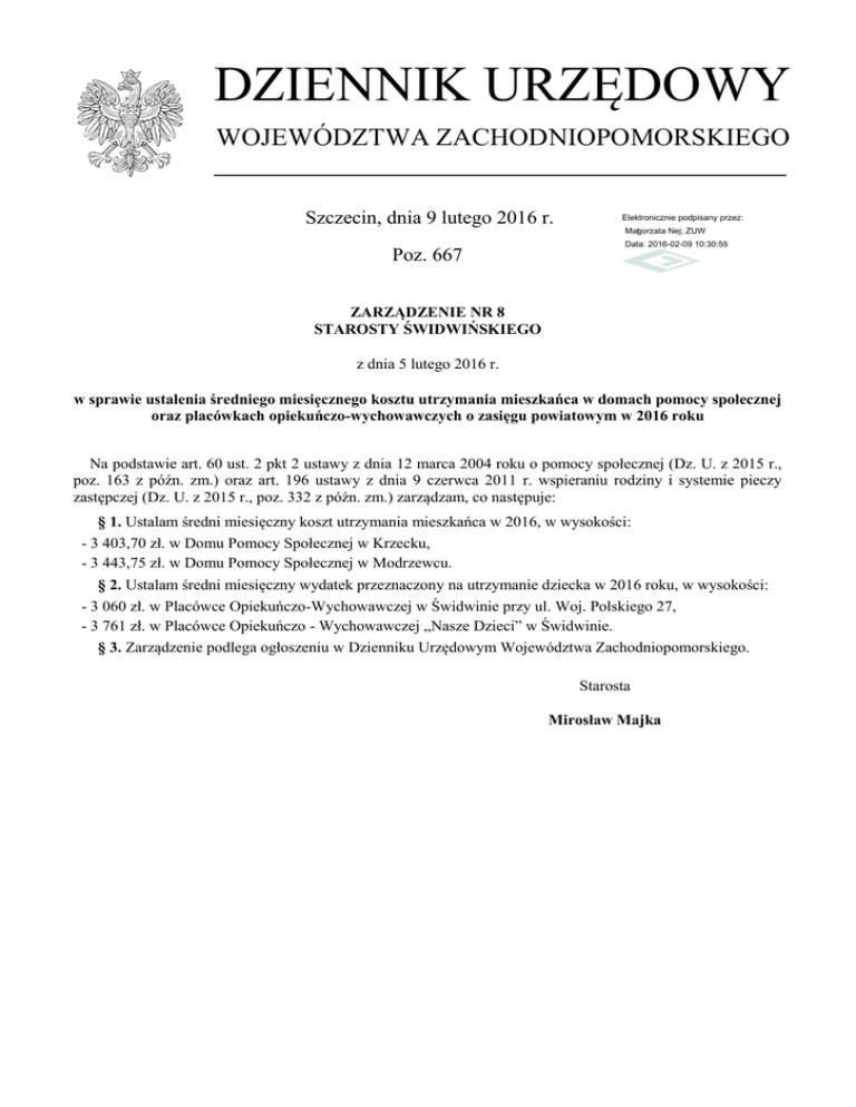 DZIENNIK URZĘDOWY WOJEWÓDZTWA ZACHODNIOPOMORSKIEGO Szczecin, dnia 9 lutego 2016 r. Elektronicznie podpisany przez: Małgorzata Nej; ZUW Poz. 667 Data: 2016-02-09 10:30:55 ZARZĄDZENIE NR 8 STAROSTY ŚWIDWIŃSKIEGO z dnia 5 lutego 2016 r. w sprawie ustalenia średniego miesięcznego kosztu utrzymania mieszkańca w domach pomocy społecznej oraz placówkach opiekuńczo-wychowawczych o zasięgu powiatowym w 2016 roku Na podstawie art. 60 ust. 2 pkt 2 ustawy z dnia 12 marca 2004 roku o pomocy społecznej (Dz. U. z 2015 r., poz. 163 z późn. zm.) oraz art. 196 ustawy z dnia 9 czerwca 2011 r. wspieraniu rodziny i systemie pieczy zastępczej (Dz. U. z 2015 r., poz. 332 z późn. zm.) zarządzam, co następuje: § 1. Ustalam średni miesięczny koszt utrzymania mieszkańca w 2016, w wysokości: - 3 403,70 zł. w Domu Pomocy Społecznej w Krzecku, - 3 443,75 zł. w Domu Pomocy Społecznej w Modrzewcu. § 2. Ustalam średni miesięczny wydatek przeznaczony na utrzymanie dziecka w 2016 roku, w wysokości: - 3 060 zł. w Placówce Opiekuńczo-Wychowawczej w Świdwinie przy ul. Woj. Polskiego 27, - 3 761 zł. w Placówce Opiekuńczo - Wychowawczej „Nasze Dzieci” w Świdwinie. § 3. Zarządzenie podlega ogłoszeniu w Dzienniku Urzędowym Województwa Zachodniopomorskiego. Starosta Mirosław Majka