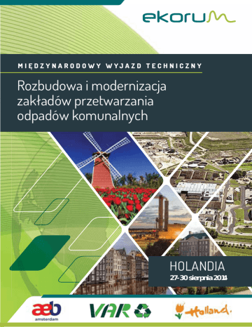 M I Ę D Z Y N A R O D O W Y W YJ A Z D T E C H N I C Z N Y Rozbudowa i modernizacja zakładów przetwarzania odpadów komunalnych HOLANDIA 27-30 sierpnia 2014 Ponad 90% Holendrów segreguje odpady „u źródła” HOLANDIA Niewątpliwe wpływ na taki wynik ma efektywna edukacja ekologiczna społeczeństwa i rozwinięta sieć PSZOK-ów. Holandia znajduje się w czołówce państw europejskich, które deponują na składowiskach najmniej, jedynie 2% odpadów. Dzięki nowoczesnej strukturze, kraj ten jest w stanie odzyskać 64% surowców ze strumienia odpadów, pozostała część poddawana jest termicznej obróbce. Holenderskie podejście jest proste: w miarę możliwości unikać tworzenia odpadów, odzyskać cenne surowce z odpadu, produkować energię w procesie spalania odpadów resztkowych, a dopiero potem składować, ale czynić to w sposób przyjazny dla środowiska. Takie założenie zostało włączone do ustawodawstwa holenderskiego w 1994 roku i stanowi podstawę do "hierarchizowania odpadów" w europejskiej dyrektywie ramowej w sprawie odpadów. Amsterdam światowym liderem w zakresie gospodarki odpadami Dzięki działalności spółki Waste and Energy Company (AEB) zarządzającej bardzo wydajną spalarnią odpadów, będącą wzorem dla innych miast całego świata Amsterdam jest światowym liderem w zakresie gospodarki odpadami. Wszystkie tramwaje i autobusy w Amsterdamie działają na energii elektrycznej wytworzonej przez AEB. Największa na świecie spalarnia odpadów w Amsterdamie Podczas wyjazdu będziemy wizytowali największą na świecie spalarnię odpadów w Amsterdamie oraz nowoczesną kompostownię, zakład fermentacji, sortownię i składowisko odpadów. Realizowane podczas wyjazdu wizytacje oraz spotkania z przedstawicielami holenderskich zakładów pozwolą przenieść holenderskie nowoczesne rozwiązania na grunt polski. SERDECZNIE ZAPRASZAMY NA WYJAZD! PATRONAT MEDIALNY PROGRAM środa, 27.08.2014 8:00 Wyjazd z hotelu Campanile w Poznaniu 15:00 Zwiedzanie ogrodów oraz zamku Herrenhausen w Hannoverze 16:30 Obiadokolacja 21:30 Dojazd do hotelu, nocleg 7:30 Śniadanie 8:30 Wyjazd z hotelu 10:00 czwartek, 28.08.2014 Przyjazd do Amsterdamu, wizytacja zakładu termicznego przekształcania odpadów AEB w Amsterdamie Zakład zlokalizowany jest w strefie wybrzeża Amsterdamu i jest największą instalacją na świecie przetwarzającą odpady. Spalarnia ta posiada 8 linii, a jej wydajność wynosi 1 400 000 Mg/rok. Odpady pochodzą nie tylko ze stolicy Holandii, ale również dostarczane są statkami. Spalarnia AEB została zmodernizowana w 2007 roku. Do oczyszczania spalin zastosowano najnowocześniejsze technologie, zapewniając przy tym niezbędną redukcję emisji niebezpiecznych substancji. 12:30 Przyjazd do centrum Amsterdamu, lunch 13:30 Spotkanie z lokalnym przewodnikiem, rejs statkiem po amsterdamskich kanałach, zwiedzenie miasta 17:00 Czas wolny w Amsterdamie 19:00 Kolacja w browarze 22:30 Powrót do hotelu PAKIETY EKORUM Zapraszamy do zaprezentowania swojej oferty podczas wyjazdu technicznego organizowanego przez EKORUM W swojej ofercie proponujemy m.in.: - partner wyjazdu - kolportaż folderów i gadżetów firmowych - zamieszczenie reklamy w materiałach szkoleniowych W sprawie szczegółów prosimy o kontakt: Paweł Szadziewicz tel. 608 332 700 e-mail: [email protected] Śniadanie 9:30 Zwiedzanie barokowego pałacu Het Loo w Apeldoorn 11:00 Wizytacja instalacji: zakład fermentacji, kompostownia odpadów, sortownia, składowisko odpadów i inne Na obszarze o powierzchni 75 ha zlokalizowane są instalacje do przetwarzania odpadów komunalnych należące do prywatnej spółki. W całości zakład przerabia rocznie 1 300 000 ton odpadów komunalnych oraz przemysłowych. Ponad 85% trafiających tu odpadów poddawana jest recyklingowi. Zakład fermentacji odpadów wraz z kompostownią przetwarza rocznie 240 000 ton odpadów organicznych, co stanowi 15% tego rodzaju odpadów produkowanych przez całe państwo. Z tej masy 60 000 ton poddawana jest suchej fermentacji, pozostała część kompostowana tlenowo. Dzięki temu powstaje 14 mln kWh energii elektrycznej oraz 100 000 ton kompostu. Sortownia odpadów przerabia 180 000 ton odpadów przemysłowych rocznie, odzyskując surowce wtórne oraz paliwo z odpadów na poziomie 85%. Zakład posiada jedyną na świecie instalację do przetwarzania sztucznej trawy z boisk, kortów itp. Na swoim terenie posiada obiekty do oczyszczania gleby z zanieczyszczeń, takich jak paliwa, metale ciężkie, azbest. W ten sposób oczyszcza rocznie 125 000 ton gleby. Instalacja do recyklingu odpadów budowalnych i rozbiórkowych zagospodarowuje rocznie 240 000 ton odpadów. Z oczyszczonej gleby oraz przetworzonych odpadów budowalnych produkowane są cementowe bloczki budowlane. Składowisko na 200 000 ton odpadów, produkuje energię elektryczną na poziomie 3,5 mln kWh. 14:00 16:30 Wyjazd do Polski Obiadokolacja w Niemczech sobota, 30.08.2014 4:00 Około godziny 4:00 przyjazd do Poznania do hotelu Campanile Organizator: EKO MAREKTING www.ekorum.pl tel. 61 67 00 965 e-mail: [email protected] edukacja ekologiczna strony www produkcja filmów opracowania i druk materiałów informacyjno-edukacyjnych gadżety z logo (kalendarze, smycze, torby, itp.) Projekt i opracowanie graficzne: Agnieszka Matczak, www.graf–city.pl piątek, 29.08.2014 8:30 INFORMACJE ORGANIZACYJNE 1. 2. Termin Wyjazdu: 27-30 sierpnia 2014 r. 3. Dokument niezbędny do wyjazdu: ważny dowód osobisty lub paszport. 4. Przy zgłoszeniu więcej niż 1 osoby udzielany jest 5% rabat od każdej kolejnej osoby. 5. Jeżeli udział w wyjeździe jest finansowany przynajmniej w 70% ze środków publicznych usługa jest zwolniona z podatku VAT. 6. Kartę zgłoszenia wraz z potwierdzeniem przelewu prosimy przesłać faksem: pod numer + 48 61 66 89 166 lub zeskanować i wysłać na adres e-mail [email protected] w terminie do dnia 11.07.2014 r. Po tym terminie prosimy o kontakt