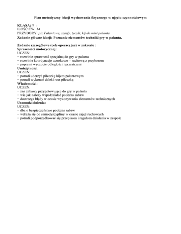 Plan metodyczny lekcji wychowania fizycznego w ujęciu czynnościowym KLASA: IV a ILOŚĆ ĆW: 14 PRZYBORY: pił. Palantowe, szarfy, tyczki, kij do mini palanta Zadanie główne lekcji: Poznanie elementów techniki gry w palanta. Zadanie szczegółowe (cele operacyjne) w zakresie : Sprawności motorycznej: UCZEŃ: − rozwinie sprawność specjalną do gry w palanta − rozwinie koordynację wzrokowo – ruchową z przyborem − poprawi wyczucie odległości i przestrzeni Umiejętności: UCZEŃ: − potrafi uderzyć piłeczkę kijem palantowym − potrafi wykonać daleki rzut piłeczką Wiadomości: UCZEŃ: − zna zabawy przygotowujące do gry w palanta − wie jak należy współdziałać podczas zabaw − dostrzega błędy w czasie wykonywania elementów technicznych Usamodzielnienia: UCZEŃ: − dba o bezpieczeństwo podczas zabaw − wdraża się do samodyscypliny w czasie zajęć ruchowych − potrafi podporządkować się przepisom i regułom działania w zespole CZYNNOŚCI UCZNIÓW DOCELOWE ZADANIA Część Nabierze wstępna pozytywnej motywacji do udziału w lekcji Część Pobudzi i główna A przygotuje organizm do wysiłku fizycznego Część − poprawi główna B koordynację ruchową − poprawi celność rzutu piłeczką CZYNNOŚCI NAUCZYCIELA METODY, UWAGI − Słucha informacji nauczyciela − Pozna zadania lekcji i reguły zabaw i gier − Przygotowuje się do świadomego i aktywnego udziału w lekcji -poleca zbiórkę, pogadanka -sprawdza gotowość ucznia do lekcji, - podaje temat lekcji -wyjaśni wpływ przygotowania organizmu na efektywność ćwiczeń -zwraca uwagę na zachowanie zasad bezpieczeństwa podczas ćwiczeń -motywuje uczniów do aktywnego uczestnictwa. Bierze udział w zabawie − Omawia reguły zabawy zabawowa „Berek lawina” − Podaje polecenie do ustawienia - podrzut i chwyt piłki w miejscu, w w luźnej wyskoku, z przysiadem, rozsypce - krążenie piłki wokół tułowia, − Omówienie i pokaz - przekładanie piłki wokół kolan, poszczególnych ćwiczeń bioder, głowy, - piłka trzymana na wysokości bioder, − Kontroluje prawidłowość zadaniowa ścisła wykonywanych ćwiczeń uderzamy kolanami w piłkę, - piłka z tyłu uderzamy piętami, - w lekkim rozkroku toczenie piłki wokół stóp i po ósemce, − leżenie tyłem – piłeczka między stopami, przejście do leżenia przewrotnego z piłeczką i powrót - siad rozkroczny – toczenie piłki wokoło, toczenie pod uniesionymi NN, pod prawą i lewą NN, - leżenie przodem – toczenie piłki z prawej ręki do lewej równoczesnym unoszeniem klatki piersiowej, - swobodne podskoki z piłką. Bierze udział w zabawie „ Złap − wydaje polecenie do zabawowa złodzieja”. Uczniowie dzielą się na dwa ustawienia się zespoły. Na boisku oznaczmy linię drużynami i objaśnia zasady startu i mety. Trzecia linia środkowa zabawy, liczy punkty. dzieli boisko na dwie równe części. Czwarta linia dzieli zaś jedną połowę boiska na dwie równe części. Na linii środkowej są ustawione piłeczki. Jedna drużyna ustawia się na linii końcowej druga zaś na czwartej linii. Na gwizdek szeregi jednocześnie starują i biegną w swoją stronę. Gracze znajdujący się bliżej piłeczek zabierają je i jak najszybciej uciekają z powrotem do linii mety nie dając się dogonić. Za złapanie uciekającego zespół otrzymuje punkt. Bierze udział w zabawie „Sztafeta − wydaje polecenie do piłeczek”.Gracze ustawiają się w dwóch ustawienia się rzędach obok chorągiewek. Uczniowie drużynami i objaśnia zasady znajdujący się na czele rzędu trzymają zabawy. w ręku piłeczki. Na znak nauczyciela pierwsi gracze obu rzędów rzucają piłeczki o ścianę tak silnie aby odbiły zabawowa się z powrotem i biegną na koniec rzędu. Następny gracz podnosi piłeczkę i rzuca nią o ścianę. Wygrywa drużyna która pierwsza wykona zadanie. ścisła „Palant”-Cel gry:drużyna podbijająca stara się jak najdłużej utrzymać w gnieździe przez celne podbijanie piłki i ukończenie biegów; drużyna chwytająca dąży do uzyskania gniazda. W tym celu stara się schwycić piłkę będącą w powietrzu , albo też przerzucić piłkę przez linię gniazda, by w ten sposób wstrzymać możliwie najwięcej graczy na swym boisku, a co za tym idzie „wygłodzić" przeciwną drużynę. − podaje zadania poszczególnym zespołom, omówi zasady gry, motywuje uczniów do współzawodnictwa, liczy punkty, podaje wynik końcowy Zasady gry: Gracze znajdujący się w gnieździe wstępują kolejno do półkola, skąd mają prawo podbijać piłkę na pole chwytania przy pomocy palanta. Podbicie jest dobre jeśli; a) piłka przeszła nad ziemią linię półmetka, Podbicie jest nieważne, jeśli podbijający: a) nie podbije piłki tak, aby wyszła poza linię półmetka b) wypuści palant z ręki, Po podbiciu piłki gracz, który piłkę podbił, ułożywszy palant w granicach pola podbijania, biegnie do mety zaliczając po kolei wyznaczone bazy. W momencie odrzucenia piłki do gniazda przez zespół chwytający zawodnik zatrzymuje się przy najbliższej bazie. Po dobiegnięciu do mety drużyna otrzymuje punkt. , on zaś ma prawo do dalszej gry w gnieździe. Gracz, który który nie wykonał prawidłowego odbicia piłki przechodzi na pierwszą bazę zakłada szarfę i biegnie za zero punktów po prawidłowym wybiciu następnego gracza. Gracze będący na bazach w przypadku złego odbicia swojego zawodnika nie biegną do kolejnych baz. Co każde dziesięć zdobytych punktów przez drużynę będącą w gnieździe następuje zmiana miejsc. Część Uspokoi końcowa organizm po wysiłku Wdroży się do samooceny. Bierze udział w zabawie „Minutka” - daje sygnał do rozpoczęcia zabawy, mierzy czas. zabawowa - staje na zbiórce -słucha informacji nauczyciela dokonuje samooceny własnych umiejętności. - poleca zbiórkę w szeregu -ocenia i podsumowuje zaangażowanie uczniów, -wyróżnia najlepszych