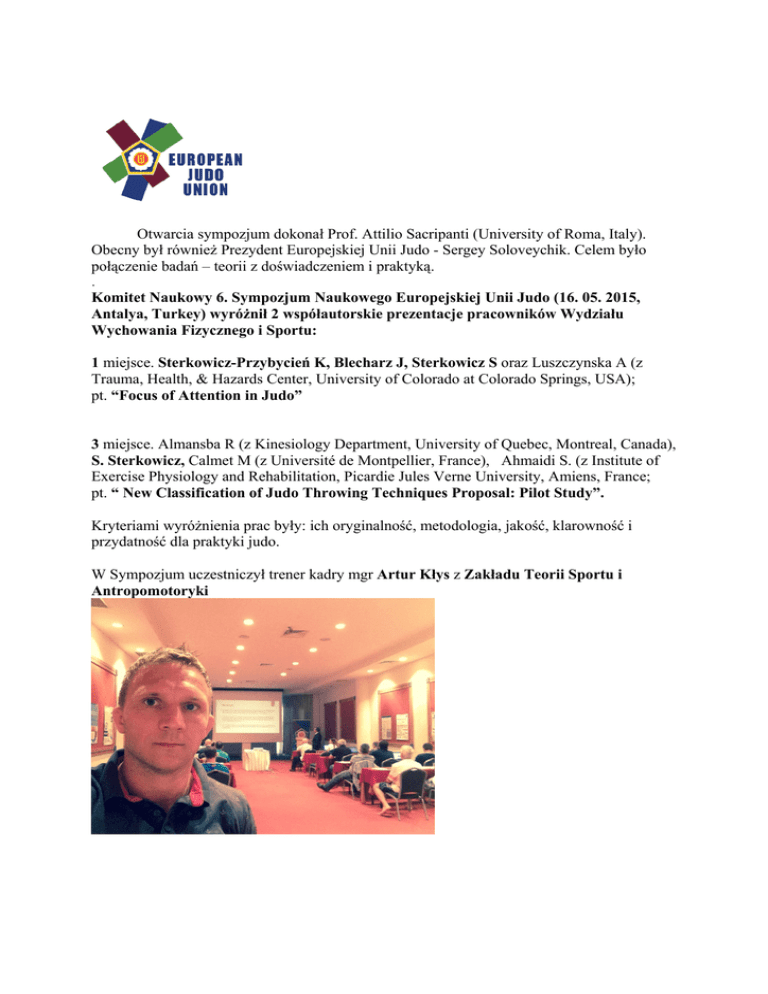 Otwarcia sympozjum dokonał Prof. Attilio Sacripanti (University of Roma, Italy). Obecny był również Prezydent Europejskiej Unii Judo - Sergey Soloveychik. Celem było połączenie badań – teorii z doświadczeniem i praktyką. . Komitet Naukowy 6. Sympozjum Naukowego Europejskiej Unii Judo (16. 05. 2015, Antalya, Turkey) wyróżnił 2 współautorskie prezentacje pracowników Wydziału Wychowania Fizycznego i Sportu: 1 miejsce. Sterkowicz-Przybycień K, Blecharz J, Sterkowicz S oraz Luszczynska A (z Trauma, Health, & Hazards Center, University of Colorado at Colorado Springs, USA); pt. “Focus of Attention in Judo” 3 miejsce. Almansba R (z Kinesiology Department, University of Quebec, Montreal, Canada), S. Sterkowicz, Calmet M (z Université de Montpellier, France), Ahmaidi S. (z Institute of Exercise Physiology and Rehabilitation, Picardie Jules Verne University, Amiens, France; pt. “ New Classification of Judo Throwing Techniques Proposal: Pilot Study”. Kryteriami wyróżnienia prac były: ich oryginalność, metodologia, jakość, klarowność i przydatność dla praktyki judo. W Sympozjum uczestniczył trener kadry mgr Artur Kłys z Zakładu Teorii Sportu i Antropomotoryki