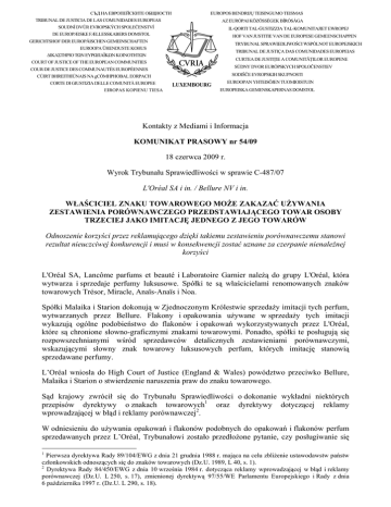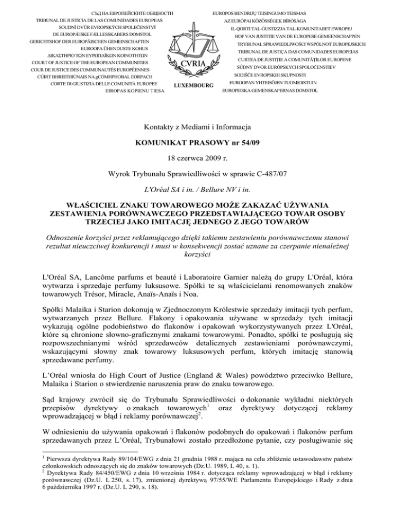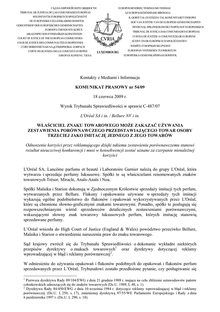 СЪД НА ЕВРОПЕЙСКИТЕ ОБЩНОСТИ TRIBUNAL DE JUSTICIA DE LAS COMUNIDADES EUROPEAS EUROPOS BENDRIJŲ TEISINGUMO TEISMAS AZ EURÓPAI KÖZÖSSÉGEK BÍRÓSÁGA SOUDNÍ DVŮR EVROPSKÝCH SPOLEČENSTVÍ IL-QORTI TAL-ĠUSTIZZJA TAL-KOMUNITAJIET EWROPEJ DE EUROPÆISKE FÆLLESSKABERS DOMSTOL HOF VAN JUSTITIE VAN DE EUROPESE GEMEENSCHAPPEN GERICHTSHOF DER EUROPÄISCHEN GEMEINSCHAFTEN TRYBUNAŁ SPRAWIEDLIWOŚCI WSPÓLNOT EUROPEJSKICH EUROOPA ÜHENDUSTE KOHUS TRIBUNAL DE JUSTIÇA DAS COMUNIDADES EUROPEIAS ∆ΙΚΑΣΤΗΡΙΟ ΤΩΝ ΕΥΡΩΠΑΪΚΩΝ ΚΟΙΝΟΤΗΤΩΝ CURTEA DE JUSTIŢIE A COMUNITĂŢILOR EUROPENE COURT OF JUSTICE OF THE EUROPEAN COMMUNITIES SÚDNY DVOR EURÓPSKYCH SPOLOČENSTIEV COUR DE JUSTICE DES COMMUNAUTÉS EUROPÉENNES SODIŠČE EVROPSKIH SKUPNOSTI CÚIRT BHREITHIÚNAIS NA gCÓMHPHOBAL EORPACH EUROOPAN YHTEISÖJEN TUOMIOISTUIN CORTE DI GIUSTIZIA DELLE COMUNITÀ EUROPEE EIROPAS KOPIENU TIESA EUROPEISKA GEMENSKAPERNAS DOMSTOL Kontakty z Mediami i Informacja KOMUNIKAT PRASOWY nr 54/09 18 czerwca 2009 r. Wyrok Trybunału Sprawiedliwości w sprawie C-487/07 L'Oréal SA i in. / Bellure NV i in. WŁAŚCICIEL ZNAKU TOWAROWEGO MOŻE ZAKAZAĆ UŻYWANIA ZESTAWIENIA PORÓWNAWCZEGO PRZEDSTAWIAJĄCEGO TOWAR OSOBY TRZECIEJ JAKO IMITACJĘ JEDNEGO Z JEGO TOWARÓW Odnoszenie korzyści przez reklamującego dzięki takiemu zestawieniu porównawczemu stanowi rezultat nieuczciwej konkurencji i musi w konsekwencji zostać uznane za czerpanie nienależnej korzyści L'Oréal SA, Lancôme parfums et beauté i Laboratoire Garnier należą do grupy L'Oréal, która wytwarza i sprzedaje perfumy luksusowe. Spółki te są właścicielami renomowanych znaków towarowych Trésor, Miracle, Anaïs-Anaïs i Noa. Spółki Malaika i Starion dokonują w Zjednoczonym Królestwie sprzedaży imitacji tych perfum, wytwarzanych przez Bellure. Flakony i opakowania używane w sprzedaży tych imitacji wykazują ogólne podobieństwo do flakonów i opakowań wykorzystywanych przez L'Oréal, które są chronione słowno-graficznymi znakami towarowymi. Ponadto, spółki te posługują się rozpowszechnianymi wśród sprzedawców detalicznych zestawieniami porównawczymi, wskazującymi słowny znak towarowy luksusowych perfum, których imitację stanowią sprzedawane perfumy. L’Oréal wniosła do High Court of Justice (England & Wales) powództwo przeciwko Bellure, Malaika i Starion o stwierdzenie naruszenia praw do znaku towarowego. Sąd krajowy zwrócił się do Trybunału Sprawiedliwości o dokonanie wykładni niektórych przepisów dyrektywy o znakach towarowych1 oraz dyrektywy dotyczącej reklamy wprowadzającej w błąd i reklamy porównawczej2. W odniesieniu do używania opakowań i flakonów podobnych do opakowań i flakonów perfum sprzedawanych przez L’Oréal, Trybunałowi zostało przedłożone pytanie, czy posługiwanie się 1 Pierwsza dyrektywa Rady 89/104/EWG z dnia 21 grudnia 1988 r. mająca na celu zbliżenie ustawodawstw państw członkowskich odnoszących się do znaków towarowych (Dz.U. 1989, L 40, s. 1). 2 Dyrektywa Rady 84/450/EWG z dnia 10 września 1984 r. dotycząca reklamy wprowadzającej w błąd i reklamy porównawczej (Dz.U. L 250, s. 17), zmienionej dyrektywą 97/55/WE Parlamentu Europejskiego i Rady z dnia 6 października 1997 r. (Dz.U. L 290, s. 18). przez osobę trzecią oznaczeniem podobnym do renomowanego znaku towarowego może zostać uznane za czerpanie nienależnej korzyści z tego znaku, jeżeli posługiwanie to jest korzystne z punktu widzenia prowadzonej przez tę osobę sprzedaży towarów, nie pociągając za sobą zarazem ryzyka wprowadzenia w błąd odbiorców i nie stanowiąc działania na szkodę właściciela znaku towarowego. Na to pytanie Trybunał odpowiedział twierdząco. Trybunał stoi na stanowisku, że czerpanie nienależnej korzyści z charakteru odróżniającego lub renomy znaku towarowego nie jest zależne od istnienia ryzyka wprowadzenia w błąd ani ryzyka działania na szkodę właściciela tego znaku. Trybunał stwierdził, że do ustalenia, czy używanie oznaczenia powoduje czerpanie nienależnej korzyści z charakteru odróżniającego lub renomy znaku towarowego, konieczne jest przeprowadzenie całościowej oceny, która będzie uwzględniać między innymi renomę i charakter odróżniający znaku towarowego, stopień podobieństwa między kolidującymi ze sobą znakami oraz charakter danych towarów lub usług i istniejący między nimi stopień pokrewności. W rozpatrywanym przypadku Malaika i Starion odnoszą korzyści handlowe z faktu używania, przy sprzedaży swych niskiej klasy imitacji, opakowań i flakonów podobnych do opakowań i flakonów wykorzystywanych przez spółkę L'Oréal dla jej luksusowych perfum. Ponadto, podobieństwo to zostało wypracowane celowo tak, aby wywołać u odbiorców odpowiednie skojarzenie z oryginalnymi perfumami, wraz z zamiarem ułatwienia sprzedaży imitacji. Trybunał uznał, że w tych okolicznościach na uwadze należy mieć w szczególności fakt, że używanie opakowań i flakonów podobnych do opakowań i flakonów imitowanych perfum służy czerpaniu korzyści, do celów reklamowych, z charakteru odróżniającego i renomy znaków towarowych, pod którymi perfumy te są sprzedawane. Trybunał stwierdził, że kiedy osoba trzecia próbuje, poprzez używanie oznaczenia podobnego do renomowanego znaku towarowego, działać w jego cieniu w celu skorzystania z jego atrakcyjności, reputacji i prestiżu oraz wykorzystać - bez żadnej rekompensaty finansowej i bez podjęcia ze swej strony żadnych działań w celu jej zaoferowania - wysiłek handlowy włożony przez właściciela znaku towarowego w wykreowanie i utrzymanie jego wizerunku, odnoszenie korzyści z takiego używania należy uznać za czerpanie nienależnej korzyści z charakteru odróżniającego lub renomy wspomnianego znaku. Jeżeli chodzi o zestawienia porównawcze perfum wymieniające nazwy luksusowych perfum spółki
