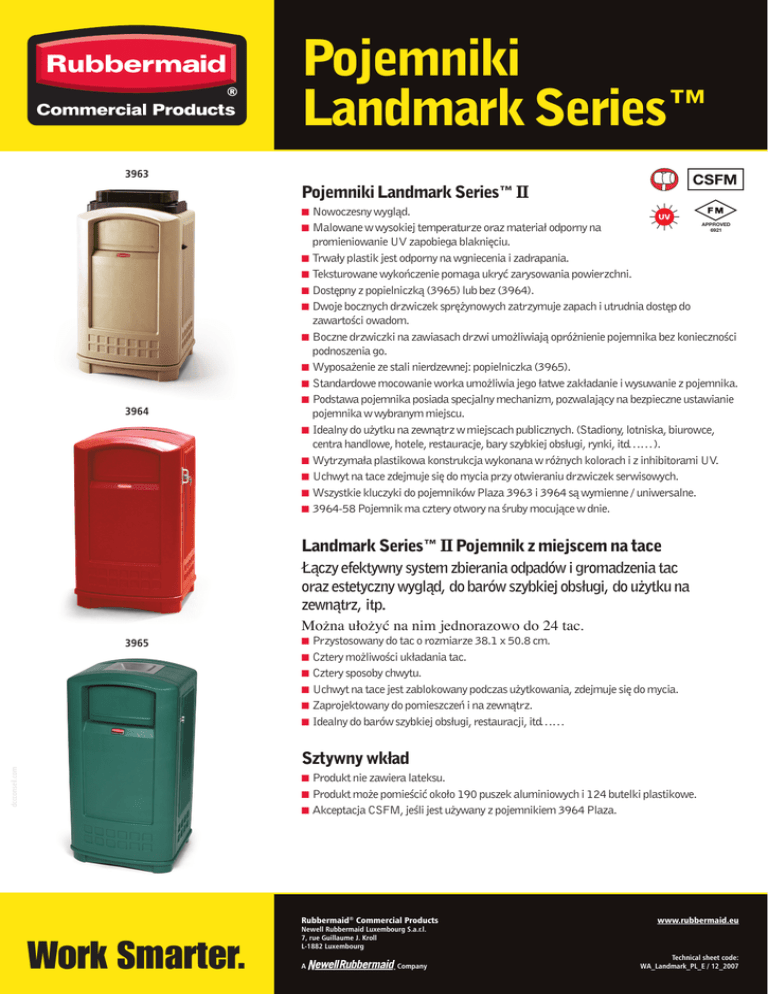 Pojemniki Landmark Series™ 3963 Pojemniki Landmark Series™ II ■■ Nowoczesny wygląd. ■■ Malowane w wysokiej temperaturze oraz materiał odporny na APPROVED 6921 promieniowanie UV zapobiega blaknięciu. ■■ Trwały plastik jest odporny na wgniecenia i zadrapania. ■■ Teksturowane wykończenie pomaga ukryć zarysowania powierzchni. ■■ Dostępny z popielniczką (3965) lub bez (3964). ■■ Dwoje bocznych drzwiczek sprężynowych zatrzymuje zapach i utrudnia dostęp do 3964 zawartości owadom. ■■ Boczne drzwiczki na zawiasach drzwi umożliwiają opróżnienie pojemnika bez konieczności podnoszenia go. ■■ Wyposażenie ze stali nierdzewnej: popielniczka (3965). ■■ Standardowe mocowanie worka umożliwia jego łatwe zakładanie i wysuwanie z pojemnika. ■■ Podstawa pojemnika posiada specjalny mechanizm, pozwalający na bezpieczne ustawianie pojemnika w wybranym miejscu. ■■ Idealny do użytku na zewnątrz w miejscach publicznych. (Stadiony, lotniska, biurowce, centra handlowe, hotele, restauracje, bary szybkiej obsługi, rynki, itd……). ■■ Wytrzymała plastikowa konstrukcja wykonana w różnych kolorach i z inhibitorami UV. ■■ Uchwyt na tace zdejmuje się do mycia przy otwieraniu drzwiczek serwisowych. ■■ Wszystkie kluczyki do pojemników Plaza 3963 i 3964 są wymienne / uniwersalne. ■■ 3964-58 Pojemnik ma cztery otwory na śruby mocujące w dnie. Landmark Series™ II Pojemnik z miejscem na tace Łączy efektywny system zbierania odpadów i gromadzenia tac oraz estetyczny wygląd, do barów szybkiej obsługi, do użytku na zewnątrz, itp. Można ułożyć na nim jednorazowo do 24 tac. 3965 ■■ Przystosowany do tac o rozmiarze 38.1 x 50.8 cm. ■■ Cztery możliwości układania tac. ■■ Cztery sposoby chwytu. ■■ Uchwyt na tace jest zablokowany podczas użytkowania, zdejmuje się do mycia. ■■ Zaprojektowany do pomieszczeń i na zewnątrz. ■■ Idealny do barów szybkiej obsługi, restauracji, itd…… dccconseil.com Sztywny wkład ■■ Produkt nie zawiera lateksu. ■■ Produkt może pomieścić około 190 puszek aluminiowych i 124 butelki plastikowe. ■■ Akceptacja CSFM, jeśli jest używany z pojemnikiem 3964 Plaza. Rubbermaid® Commercial Products Work Smarter. Newell Rubbermaid Luxembourg S.a.r.l. 7, rue Guillaume J. Kroll L-1882 Luxembourg A Company www.rubbermaid.eu Technical sheet code: WA_Landmark_PL_E / 12_2007 Pojemniki Landmark Series™ INFORMACJA O PRODUKCIE Symbol Oznaczenie Materiał Wymiary (cm) Zewnętrzne 3963-58 3964-58 3965-58 3958 Landmark™ z miejscem na tace Landmark™ bez popielniczki Landmark™ z popielniczką Sztywny wkład pasujący do wszystkich pojemników Polietylen Polietylen Polietylen Polietylen 62,9 x 64,1 x 109,2 62,9 x 64,1 x 109,2 62,9 x 64,1 x 109,2 49,5 x 49,5 x 70,2 Wewnętrzne Otwór Pojemność • • • Dół: 39.7 x 39.7 Góra: 46,35 x 46,35 Wysokość: 69.9 38,1 x 20,3 38,1 x 20,3 38,1 x 20,3 • 189,3 L 189,3 L 189,3 L 132,5 L Kolory Opakowanie 1 1 1 4 CZĘŚCI WYMIENNE 3963-L1 Zestaw do mocowania tac do pojemnika Plaza Kod wyposażenia dodatkowego/kompl. Ilość Opis Uwagi 60-3963-Y1 Bla (czarny) 1 Zestaw do mocowania tac (czarny) Dostępny w kartonie 3964-L2 Uchwyt do mocowania worków foliowych Kod wyposażenia dodatkowego/kompl. Ilość Opis Uwagi 64-3964-Y1 Bla (czarny) 1 Uchwyt UBO do pojemnika Plaza 10-256P-00 8 Śruba, 0.4 x 1.9, Typ AB, Łeb stożkowy ścięty, nacięcie krzyżykowe Opcjonalny do 62-3964-W1 0000 lub oryginalne wyposażenie dla 64-3964-T1 BLA • 3964-L3 Zatrzask Kod wyposażenia dodatkowego/kompl. Ilość Opis Uwagi 51-3964-00 54-3960-00 1 1 Zatrzask Plaza Zatrzask ustalający Plaza • • Kod wyposażenia dodatkowego/kompl. Ilość Opis Uwagi D26-3964-00 D93-3964-D1 D94-3964-E1 D13-8420-00 2 1 1 2 Sprężyny Klapa sprężynowa Klapka uchylna 0.7 Śruby • • • • 3964-L4 Klapa wymienna 3964-L5 Wyposażenie pojemnika Plaza dccconseil.com Kod wyposażenia dodatkowego/kompl. Ilość 60-3964-Y1 0000 1 10-256P-00 15-3964-01 17-3964-00 24-3964-00 25-3964-00 51-3964-00 54-3960-00 56-3960-00 73-3964-00 17-6123-00 45-3964-00 30-111-00 4 14 8 2 2 1 1 1 1 14 1 1 Opis Uwagi Wyposażenie Śruba z łbem stożkowym ściętym Śruba Śruba Śruba Nakrętka samoblokująca sześciokątna Zatrzask Plaza Zatrzask ustalający Plaza Płytka zatrzaskowa Instrukcja obsługi Płaska uszczelka 8 x 10 Uchwyt na worki Pudełko użytkowe Rubbermaid® Commercial Products Work Smarter. Newell Rubbermaid Luxembourg S.a.r.l. 7, rue Guillaume J. Kroll L-1882 Luxembourg A Company Dla worków 20.3 x 25.4 • • • • • szczelne zamknięcie • • • • do kompletu wyposażenia • www.rubbermaid.eu Technical sheet code: WA_Landmark_PL_E / 12_2007 Pojemniki Landmark Series™ 3964-L6 Zatrzask Plaza Kod wyposażenia dodatkowego/kompl. Ilość Opis Uwagi 51-3960-00 54-3960-00 1 1 Zestaw zamek/klucz Zatrzask ustalający Plaza Zestaw jest sprzedawany odzielnie jako opcja do standardowego zatrzasku w podstawowej wersji produktu. • 3965-L1 Popielniczka Kod wyposażenia dodatkowego/kompl. Ilość Opis Uwagi 60-3965-Y1 Bla (czarny) 53-3965-00 54-3965-00 41-3965-00 Popielniczka Pokrywa popielniczki Podstawa popielniczki Wewnętrzny wkład • • • • 1 1 1 1 INFORMACJA O WYSYŁCE Kod produktu EAN Kod kartonu DUN Kod zamówienia Wymiary kartonu Waga (kg) Obj. (M3) US US US US US US US US US US US US US 0086876159745 0086876159738 0086876159783 0086876159752 0086876173376 0086876159776 3253922947015 0086876173383 0086876148015 0086876148022 0086876156423 0086876057553 0086876026528 0086876159745 0086876159738 0086876159783 0086876159752 0086876173376 0086876159776 3253922947015 0086876173383 0086876148015 0086876148022 0086876656428 0086876557558 0086876526523 3924909000 3924909000 3924909000 3924909000 3924909000 3924909000 3924909000 3924909000 3924909000 3924909000 3924909000 3924909000 3924909000 40,89 x 62,74 x 109,2 40,89 x 62,74 x 109,2 108,6 x 62,23 x 39,