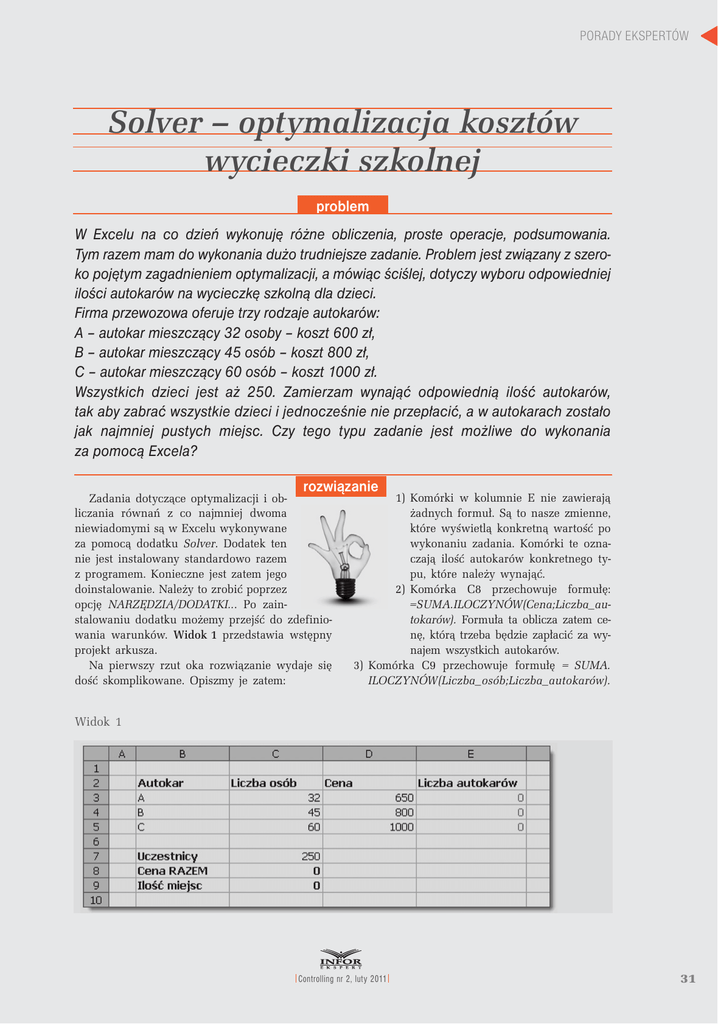 Solver – optymalizacja kosztów wycieczki szkolnej