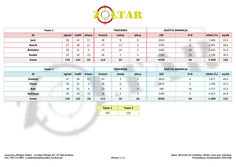 Team 1 TRAFIENIA ZUŻYTA AMUNICJA ID zginał trafił bilans