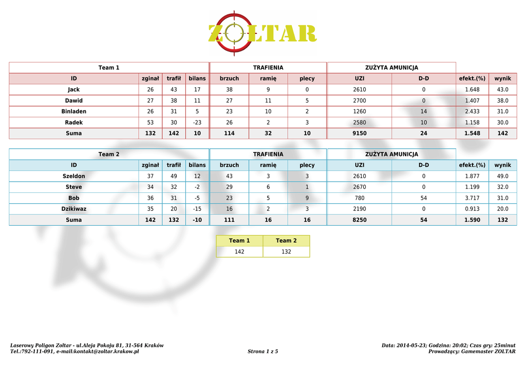 Team 1 TRAFIENIA ZUŻYTA AMUNICJA ID zginał trafił bilans brzuch ramię plecy UZI D-D efekt.(%) wynik Jack 26 43 17 38 9 0 2610 0 1.648 43.0 Dawid 27 38 11 27 11 5 2700 0 1.407 38.0 Binladen 26 31 5 23 10 2 1260 14 2.433 31.0 Radek 53 30 -23 26 2 3 2580 10 1.158 30.0 Suma 132 142 10 114 32 10 9150 24 1.548 142 Team 2 TRAFIENIA ZUŻYTA AMUNICJA ID zginał trafił bilans brzuch ramię plecy UZI D-D efekt.(%) wynik Szeldon 37 49 12 43 3 3 2610 0 1.877 49.0 Steve 34 32 -2 29 6 1 2670 0 1.199 32.0 Bob 36 31 -5 23 5 9 780 54 3.717 31.0 Dzikiwaz 35 20 -15 16 2 3 2190 0 0.913 20.0 Suma 142 132 -10 111 16 16 8250 54 1.590 132 Laserowy Poligon Zoltar - ul.Aleja Pokoju 81, 31-564 Kraków Tel.:792-111-091, e-mail:[email protected] Team 1 Team 2 142 132 Strona 1 z 5 Data: 2014-05-23; Godzina: 20:02; Czas gry: 25minut Prowadzący: Gamemaster ZOLTAR Team 1 TRAFIENIA ZUŻYTA AMUNICJA ID zginał trafił bilans brzuch ramię plecy UZI D-D efekt.(%) wynik Dawid 31 47 16 39 11 5 3960 6 1.185 47.0 Radek 42 44 2 32 10 4 3900 1 1.128 44.0 Jack 22 34 12 22 10 2 3450 0 0.986 34.0 Binladen 23 22 -1 18 12 2 1620 37 1.328 22.0 Suma 118 147 29 111 43 13 12930 44 1.133 147 Team 2 TRAFIENIA ZUŻYTA AMUNICJA ID zginał trafił bilans brzuch ramię plecy UZI D-D efekt.(%) wynik Szeldon 38 49 11 40 6 5 3180 0 1.541 49.0 Bob 32 27 -5 22 8 5 960 122 2.495 27.0 Dzikiwaz 38 24 -14 21 1 3 2640 0 0.909 24.0 Steve 39 18 -21 16 1 1 2490 0 0.723 18.0 Suma 147 118 -29 99 16 14 9270 122 1.256 118 Laserowy Poligon Zoltar - ul.Aleja Pokoju 81, 31-564 Kraków Tel.:792-111-091, e-mail:[email protected] Team 1 Team 2 147 118 Strona 2 z 5 Data: 2014-05-23; Godzina: 20:38; Czas gry: 25minut Prowadzący: Gamemaster ZOLTAR Drużyny Miejsce Laserowy Poligon Zoltar - ul.Aleja Pokoju 81, 31-564 Kraków Tel.:792-111-091, e-mail:[email protected] Nazwa Rozgrywki 1 2 Suma Team 1 142 147 289 Team 2 132 118 250 Strona 3 z 5 Data: 2014-05-23 Prowadzący: Gamemaster ZOLTAR Zestawienie wg wyniku Miejsce TRAFIENIA ZUŻYTA AMUNICJA ID zginał trafił bilans brzuch ramię plecy UZI D-D efekt.(%) wynik Szeldon 90.00 117.60 27.60 99.60 10.80 9.60 6948.00 0.00 1.693 117.60 Dawid 69.60 102.00 32.40 79.20 26.40 12.00 7992.00 7.20 1.275 102.00 Jack 57.60 92.40 34.80 72.00 22.80 2.40 7272.00 0.00 1.271 92.40 4 Radek 114.00 88.80 -25.20 69.60 14.40 8.40 7776.00 13.20 1.140 88.80 5 Bob 81.60 69.60 -12.00 54.00 15.60 16.80 2088.00 211.20 3.027 69.60 6 Binladen 58.80 63.60 4.80 49.20 26.40 4.80 3456.00 61.20 1.808 63.60 7 Steve 87.60 60.00 -27.60 54.00 8.40 2.40 6192.00 0.00 0.969 60.00 8 Dzikiwaz 87.60 52.80 -34.80 44.40 3.60 7.20 5796.00 0.00 0.911 52.80 Zestawienie wg bilansu Miejsce TRAFIENIA ZUŻYTA AMUNICJA ID zginał trafił bilans brzuch ramię plecy UZI D-D efekt.(%) wynik Jack 57.60 92.40 34.80 72.00 22.80 2.40 7272.00 0.00 1.271 92.40 Dawid 69.60 102.00 32.40 79.20 26.40 12.00 7992.00 7.20 1.275 102.00 Szeldon 90.00 117.60 27.60 99.60 10.80 9.60 6948.00 0.00 1.693 117.60 4 Binladen 58.80 63.60 4.80 49.20 26.40 4.80 3456.00 61.20 1.808 63.60 5 Bob 81.60 69.60 -12.00 54.00 15.60 16.80 2088.00 211.20 3.027 69.60 6 Radek 114.00 88.80 -25.20 69.60 14.40 8.40 7776.00 13.20 1.140 88.80 7 Steve 87.60 60.00 -27.60 54.00 8.40 2.40 6192.00 0.00 0.969 60.00 8 Dzikiwaz 87.60 52.80 -34.80 44.40 3.60 7.20 5796.00 0.00 0.911 52.80 Laserowy Poligon Zoltar - ul.Aleja Pokoju 81, 31-564 Kraków Tel.:792-111-091, e-mail:[email protected] Strona 4 z 5 Data: 2014-05-23 Prowadzący: Gamemaster ZOLTAR Zestawienie wg efektywności Miejsce TRAFIENIA ZUŻYTA AMUNICJA ID zginał trafił bilans brzuch ramię plecy UZI D-D efekt.(%) wynik Bob 81.60 69.60 -12.00 54.00 15.60 16.80 2088.00 211.20 3.027 69.60 Binladen 58.80 63.60 4.80 49.20 26.40 4.80 3456.00 61.20 1.808 63.60 Szeldon 90.00 117.60 27.60 99.60 10.80 9.60 6948.00 0.00 1.693 117.60 4 Dawid 69.60 102.00 32.40 79.20 26.40 12.00 7992.00 7.20 1.275 102.00 5 Jack 57.60 92.40 34.80 72.00 22.80 2.40 7272.00 0.00 1.271 92.40 6 Radek 114.00 88.80 -25.20 69.60 14.40 8.40 7776.00 13.20 1.140 88.80 7 Steve 87.60 60.00 -27.60 54.00 8.40 2.40 6192.00 0.00 0.969 60.00 8 Dzikiwaz 87.60 52.80 -34.80 44.40 3.60 7.20 5796.00 0.00 0.911 52.80 Laserowy Poligon Zoltar - ul.Aleja Pokoju 81, 31-564 Kraków Tel.:792-111-091, e-mail:[email protected] Strona 5 z 5 Data: 2014-05-23 Prowadzący: Gamemaster ZOLTAR