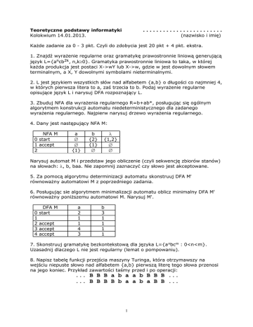 1. Znajdź wyrażenie regularne oraz gramatykę prawostronnie liniową generującą
