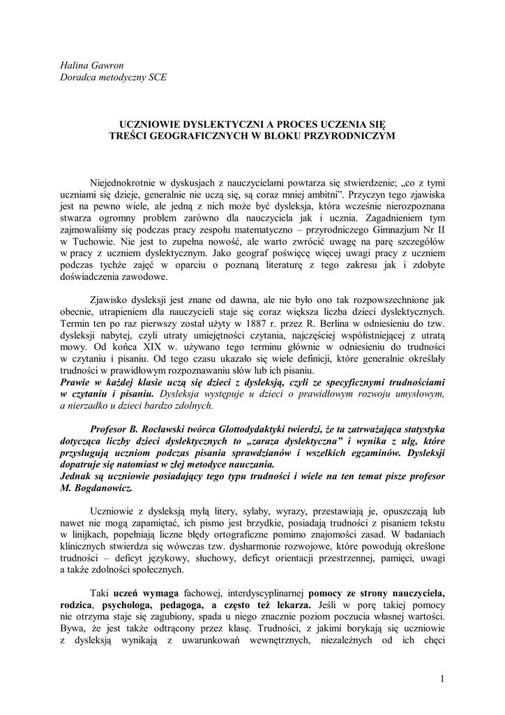 Halina Gawron Doradca metodyczny SCE UCZNIOWIE DYSLEKTYCZNI A PROCES UCZENIA SIĘ TREŚCI GEOGRAFICZNYCH W BLOKU PRZYRODNICZYM Niejednokrotnie w dyskusjach z nauczycielami powtarza się stwierdzenie; „co z tymi uczniami się dzieje, generalnie nie uczą się, są coraz mniej ambitni”. Przyczyn tego zjawiska jest na pewno wiele, ale jedną z nich może być dysleksja, która wcześnie nierozpoznana stwarza ogromny problem zarówno dla nauczyciela jak i ucznia. Zagadnieniem tym zajmowaliśmy się podczas pracy zespołu matematyczno – przyrodniczego Gimnazjum Nr II w Tuchowie. Nie jest to zupełna nowość, ale warto zwrócić uwagę na parę szczegółów w pracy z uczniem dyslektycznym. Jako geograf poświęcę więcej uwagi pracy z uczniem podczas tychże zajęć w oparciu o poznaną literaturę z tego zakresu jak i zdobyte doświadczenia zawodowe. Zjawisko dysleksji jest znane od dawna, ale nie było ono tak rozpowszechnione jak obecnie, utrapieniem dla nauczycieli staje się coraz większa liczba dzieci dyslektycznych. Termin ten po raz pierwszy został użyty w 1887 r. przez R. Berlina w odniesieniu do tzw. dysleksji nabytej, czyli utraty umiejętności czytania, najczęściej współistniejącej z utratą mowy. Od końca XIX w. używano tego terminu głównie w odniesieniu do trudności w czytaniu i pisaniu. Od tego czasu ukazało się wiele definicji, które generalnie określały trudności w prawidłowym rozpoznawaniu słów lub ich pisaniu. Prawie w każdej klasie uczą się dzieci z dysleksją, czyli ze specyficznymi trudnościami w czytaniu i pisaniu. Dysleksja występuje u dzieci o prawidłowym rozwoju umysłowym, a nierzadko u dzieci bardzo zdolnych. Profesor B. Rocławski twórca Glottodydaktyki twierdzi, że ta zatrważająca statystyka dotycząca liczby dzieci dyslektycznych to „zaraza dyslektyczna” i wynika z ulg, które przysługują uczniom podczas pisania sprawdzianów i wszelkich egzaminów. Dysleksji dopatruje się natomiast w złej metodyce nauczania. Jednak są uczniowie posiadający tego typu trudności i wiele na ten temat pisze profesor M. Bogdanowicz. Uczniowie z dysleksją mylą litery, sylaby, wyrazy, przestawiają je, opuszczają lub nawet nie mogą zapamiętać, ich pismo jest brzydkie, posiadają trudności z pisaniem tekstu w linijkach, popełniają liczne błędy ortograficzne pomimo znajomości zasad. W badaniach klinicznych stwierdza się wówczas tzw. dysharmonie rozwojowe, które powodują określone trudności – deficyt językowy, słuchowy, deficyt orientacji przestrzennej, pamięci, uwagi a także zdolności społecznych. Taki uczeń wymaga fachowej, interdyscyplinarnej pomocy ze strony nauczyciela, rodzica, psychologa, pedagoga, a często też lekarza. Jeśli w porę takiej pomocy nie otrzyma staje się zagubiony, spada u niego znacznie poziom poczucia własnej wartości. Bywa, że jest także odtrącony przez klasę. Trudności, z jakimi borykają się uczniowie z dysleksją wynikają z uwarunkowań wewnętrznych, niezależnych od ich chęci 1 i zaangażowania. Aby opanować materiał dydaktyczny tak jak ich rówieśnicy, muszą włożyć dwu-, trzykrotnie więcej wysiłku, a i tak efekty są mizerne ze względu na przykład na zbyt wolne tempo pracy lub uporczywie pojawiające się błędy ortograficzne. Bez pochwał, nagród, pozostawieni sami sobie, przestają się uczyć, nierzadko wagarują. Dysleksji nie da się całkowicie zapobiec, ale można znacznie złagodzić jej konsekwencje. To znacznie ułatwia start i funkcjonowanie dziecka w warunkach szkolnych. Dysleksja występuje u 10-15% populacji dziecięcej i częściej dotyczy chłopców niż dziewcząt i utrudnia edukację dzieci i młodzieży w największym stopniu nauczycielom j. polskiego, j. obcych oraz matematyki i geografii. Uczniowie dyslektyczni mają problemy: - z rozpoznawaniem symboli - przypominaniu sobie terminów - posiadają trudności w określaniu kierunków i czasu - mają kłopoty w orientacji przestrzennej - trudności z prawidłowym czytaniem i posługiwaniem się mapą (M. Bogdanowicz 1994 r.). Dziecko po uzyskaniu opinii z poradni psychologiczno-pedagogicznej musi być poddane terapii. Obowiązkiem każdego nauczyciela jest personalistyczne podejście do uczniów oraz troska o efektywne upowszechnianie wiadomości i umiejętności z zakresu danego bloku bądź przedmiotu. Aby nauczyciel mógł spełnić te obowiązki powinien tak dobierać metody nauczania i pomoce dydaktyczne by w możliwie optymalny sposób zapewnić efektywność pracy całego zespołu w tym uczniów dyslektycznych. Niezwykle ważną sprawą jest właściwe rozpoznanie źródeł niepowodzeń ucznia. Niełatwo jest rozstrzygnąć czy uczeń jest dyslektykiem czy też jego niepowodzenia na lekcjach geografii lub matematyki mają inne podłoże. Nauczyciel w pracy z takim uczniem musi liczyć na rzetelną diagnozę psychologów i innych kompetentnych osób. Praca z uczniem dyslektycznym jest ciężka gdyż oni posiadają niską samoocenę, co powoduje, że są albo zamknięci w sobie, albo agresywni i nieposłuszni. Dobry nauczyciel i odpowiedzialni rodzice by odbudować w nich poczucie własnej godności, postarają się znaleźć taka dziedzinę, w której są dobrzy i zdobędą popularność wśród rówieśników. Generalne zasady postępowania każdego nauczyciela wobec dyslektyka to: - posadzenie ucznia blisko siebie w celu lepszej obserwacji, by mieć lepszy wgląd na tempo pracy ucznia. - wyraźne pisanie na tablicy - zarezerwowanie dla niego w czasie sprawdzianów dłuższego czasu nawet o 1/3 - nie odpytywanie go na środku klasy - nie zmuszanie go do czytania na głos przy całej klasie - nie wyrywanie do natychmiastowej odpowiedzi. Dyslektycy przy odpowiednim sterowaniu procesem nauczania mogą się stać doskonałymi geografami i przyrodnikami. Najlepszą drogą do osiągnięcia tego celu jest nauczanie polisensoryczne, czyli uczenie z zaangażowaniem wszystkich zmysłów u