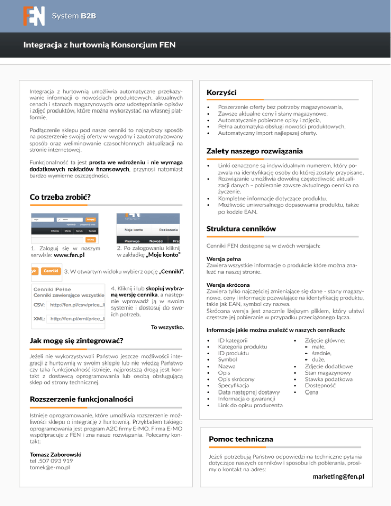 System B2B Integracja z hurtownią Konsorcjum FEN Integracja z hurtownią umożliwia automatyczne przekazywanie informacji o nowościach produktowych, aktualnych cenach i stanach magazynowych oraz udostępnianie opisów i zdjęć produktów, które można wykorzystać na własnej platformie. Podłączenie sklepu pod nasze cenniki to najszybszy sposób na poszerzenie swojej oferty w wygodny i zautomatyzowany sposób oraz weliminowanie czasochłonnych aktualizacji na stronie internetowej. Funkcjonalność ta jest prosta we wdrożeniu i nie wymaga dodatkowych nakładów finansowych, przynosi natomiast bardzo wymierne oszczędności. Co trzeba zrobić? Korzyści • • • • • Poszerzenie oferty bez potrzeby magazynowania, Zawsze aktualne ceny i stany magazynowe, Automatycznie pobierane opisy i zdjęcia, Pełna automatyka obsługi nowości produktowych, Automatyczny import najlepszej oferty. Zalety naszego rozwiązania • • • • Linki oznaczone są indywidualnym numerem, który pozwala na identyfikację osoby do której zostały przypisane. Rozwiązanie umożliwia dowolną częstotliwość aktualizacji danych - pobieranie zawsze aktualnego cennika na życzenie. Kompletne informacje dotyczące produktu. Możliwośc uniwersalnego dopasowania produktu, także po kodzie EAN. Struktura cenników 1. Zaloguj się w naszym serwisie: www.fen.pl 2. Po zalogowaniu kliknij w zakładkę „Moje konto” 3. W otwartym widoku wybierz opcję „Cenniki”. 4. Kliknij i lub skopiuj wybraną wersję cennika, a następnie wprowadź ją w swoim systemie i dostosuj do swoich potrzeb. To wszystko. Jak mogę się zintegrować? Jeżeli nie wykorzystywali Państwo jeszcze możliwości integracji z hurtownią w swoim sklepie lub nie wiedzą Państwo czy taka funkcjonalność istnieje, najprostszą drogą jest kontakt z dostawcą oprogramowania lub osobą obsługującą sklep od strony technicznej. Rozszerzenie funkcjonalności Cenniki FEN dostępne są w dwóch wersjach: Wersja pełna Zawiera wszystkie informacje o produkcie które można znależć na naszej stronie. Wersja skrócona Zawiera tylko najczęściej zmieniające się dane - stany magazynowe, ceny i informacje pozwalające na identyfikację produktu, takie jak EAN, symbol czy nazwa. Skrócona wersja jest znacznie lżejszym plikiem, który ułatwi częstsze jej pobieranie w przypadku przeciążonego łącza. Informacje jakie można znaleźć w naszych cennikach: • • • • • • • • • • • ID kategorii Kategoria produktu ID produktu Symbol Nazwa Opis Opis skrócony Specyfikacja Data następnej dostawy Informacja o gwarancji Link do opisu producenta • • • • • • Zdjęcie główne: • małe, • średnie, • duże, Zdjęcie dodatkowe Stan magazynowy Stawka podatkowa Dostępność Cena Istnieje oprogramowanie, które umożliwia rozszerzenie możliwości sklepu o integrację z hurtownią. Przykładem takiego oprogramowania jest program A2C firmy E-MO. Firma E-MO współpracuje z FEN i zna nasze rozwiązania. Polecamy kontakt: Pomoc techniczna Tomasz Zaborowski tel .507 093 919 [email protected] Jeżeli potrzebują Państwo odpowiedzi na techniczne pytania dotyczące naszych cenników i sposobu ich pobierania, prosimy o kontakt na adres: [email protected] FAQ Ważne pytania 1. Jak często można i powinno się pobierać aktualny cennik? 1. Jak często będę aktualizwoał cennik? Nasz system umożliwia pobieranie pliku z dowolną częstotliwością, a zalecana częstotliwość to 3-4 aktualizacje dziennie. 2. Cennik nie działa, co mogę zrobić? Cenniki są uniwersalne i powinny pasować do każdego systemu umożliwiającego integrację z hurtownią. Mnogość rozwiązań na rynku może powodować, że pojawią się nieprzewidziane przypadki w których cennik nie spełnia wymagań technicznych. Prosimy o wówczas o kontakt z opiekunem handlowym, który pomoże w rozwiązaniu sprawy. 3. Korzystam z wielu hurtowni, jak mogę porównać produkty między nimi a wami? Udostępniamy kod EAN, który jest indywidualnym i niepowtarzalnym kodem dla każdego produktu, co gwarantuje że ten sam produkt w innej hurtowni będzie miał ten sam kod EAN. 4. Czy jest możliwość zmniejszenia objętości pliku z cennikiem? Im częstsza aktualizacja tym bardziej aktualna oferta. Jeżeli planujecie Państwo rzadszą aktualizację to warto poinformować o tym opiekuna handlowego, który może wtedy interweniować i informować Państwa o istotnych zmianach znacznie szybciej. 2. W jaki sposób wybiorę produkty z oferty? Rekomendujemy zawsze pełną integrację całej oferty FEN, natomiast jeżeli z różnych powodów chcą Państwo połączyć jedynie wybrane kategorie lub produkty to warto poinformować o tym opiekuna handlowego. Pomoże w odpowiednim doborze produktów i będzie informował Państwa w przypadku pojawienia się produktu lub kategorii, którą warto rozważyć. 3. W jaki sposób mój system będzie radził sobie z produktami wycofanymi i nowościami? Nie wszystkie systemy mają możliwość automatycznego informowania o nowościach w ofercie lub produktach, które zostały wycofane. Jeżeli nie mają Państwo takiej funkcjonalności to warto poinformować opiekuna handlowego, który będzie przekazywał bieżące zmiany w ofercie. Oprócz wersji pełnej cennika udostępniamy wersję skróconą, która zawiera tylko najczęściej aktualizowane informacje i jest znacznie „lżejsza” a tymsamym przygotowana do częstszego pobierania. Pomoc techniczna Jeżeli potrzebują Państwo odpowiedzi na techniczne pytania dotyczące naszych cenników i sposobu ich pobierania, prosimy o kontakt na adres: [email protected]