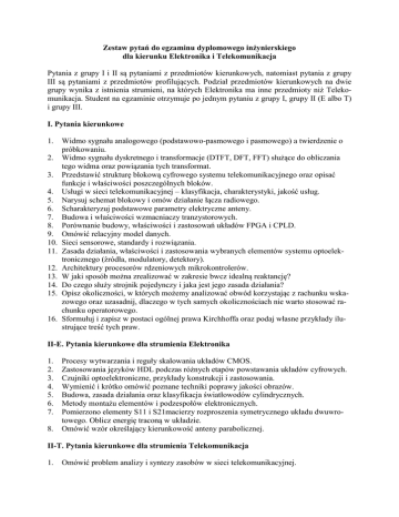 Zestaw pytań do egzaminu dyplomowego inżynierskiego dla kierunku Elektronika i Telekomunikacja Pytania z grupy I i II są pytaniami z przedmiotów kierunkowych, natomiast pytania z grupy III są pytaniami z przedmiotów profilujących. Podział przedmiotów kierunkowych na dwie grupy wynika z istnienia strumieni, na których Elektronika ma inne przedmioty niż Telekomunikacja. Student na egzaminie otrzymuje po jednym pytaniu z grupy I, grupy II (E albo T) i grupy III. I. Pytania kierunkowe 1. 2. 3. 4. 5. 6. 7. 8. 9. 10. 11. 12. 13. 14. 15. 16. Widmo sygnału analogowego (podstawowo-pasmowego i pasmowego) a twierdzenie o próbkowaniu. Widmo sygnału dyskretnego i transformacje (DTFT, DFT, FFT) służące do obliczania tego widma oraz powiązania tych transformat. Przedstawić strukturę blokową cyfrowego systemu telekomunikacyjnego oraz opisać funkcje i właściwości poszczególnych bloków. Usługi w sieci telekomunikacyjnej – klasyfikacja, charakterystyki, jakość usług. Narysuj schemat blokowy i omów działanie łącza radiowego. Scharakteryzuj podstawowe parametry elektryczne anteny. Budowa i właściwości wzmacniaczy tranzystorowych. Porównanie budowy, właściwości i zastosowań układów FPGA i CPLD. Omówić relacyjny model danych. Sieci sensorowe, standardy i rozwiązania. Zasada działania, właściwości i zastosowania wybranych elementów systemu optoelektronicznego (źródła, modulatory, detektory). Architektury procesorów rdzeniowych mikrokontrolerów. W jaki sposób można zrealizować w zakresie bwcz idealną reaktancję? Do czego służy strojnik pojedynczy i jaka jest jego zasada działania? Opisz okoliczności, w których możemy analizować obwód korzystając z rachunku wskazowego oraz uzasadnij, dlaczego w tych samych okolicznościach nie warto stosować rachunku operatorowego. Sformułuj i zapisz w postaci ogólnej prawa Kirchhoffa oraz podaj własne przykłady ilustrujące treść tych praw. II-E. Pytania kierunkowe dla strumienia Elektronika 1. 2. 3. 4. 5. 6. 7. 8. Procesy wytwarzania i reguły skalowania układów CMOS. Zastosowania języków HDL podczas różnych etapów powstawania układów cyfrowych. Czujniki optoelektroniczne, przykłady konstrukcji i zastosowania. Wymienić i krótko omówić poznane techniki poprawy jakości obrazów. Budowa, zasada działania oraz klasyfikacja światłowodów cylindrycznych. Metody montażu elementów i podzespołów elektronicznych. Pomierzono elementy S11 i S21macierzy rozproszenia symetrycznego układu dwuwrotowego. Oblicz energię traconą w układzie. Omówić wzór określający kierunkowość anteny parabolicznej. II-T. Pytania kierunkowe dla strumienia Telekomunikacja 1. Omówić problem analizy i syntezy zasobów w sieci telekomunikacyjnej. 2. 3. 4. 5. 6. 7. 8. Scharakteryzuj architektury wspierające realizację sieci IP QoS. Przedstaw bilans energetyczny i scharakteryzuj jego znaczenie przy projektowaniu łącza radiowego. System komórkowy GSM, architektura, podstawowe parametry i rodzaje usług. Filtry cyfrowe o skończonej i o nieskończonej odpowiedzi impulsowej. Zasada działania i rodzaje sztucznych sieci neuronowych. Przedstawić zasadę pracy systemów echolokacyjnych i zdefiniować ich podstawowe parametry eksploatacyjne. Omówić budowę, właściwości i zastosowania wielowiązkowych systemów echolokacyjnych. III. Pytania dla Profili Profil: Inżynieria Biomedyczna 1. 2. 3. 4. 5. 6. 7. 8. 9. 10. Pomiary sygnałów bioelektrycznych. Pomiary ciśnienia i przepływów w organizmie człowieka. Pomiary stężenia gazów w organizmie. Metody ultradźwiękowe w medycynie. Budowa i zasada działania skanera CT. Tomografia MRI, podstawy fizyczne i budowa skanera. Zasady konstruowania bezpiecznej, elektrycznej aparatury medycznej. Zasilacze izolowane i bariery sygnałowe, zasada działania, konstrukcja. Dokonać klasyfikacji systemów informacji w medycynie i omówić powiązane normy. Omówić poznane architektury systemów informacji w medycynie. Profil: Inżynieria Mikrofalowa i Antenowa 1. 2. 3. 4. 5. Opisz metodykę projektowania zintegrowanego sprzęgacza zbliżeniowego. Opisz metodykę projektowania wybranego dzielnika mocy. Omówić budowę i własności anteny mikropaskowej. Tryby pracy anteny śrubowej i ich wykorzystanie w systemach bezprzewodowych. Podać przykłady modulacji cyfrowych różniących się wpływem na jakość i wydajność wzmacniacza mocy w nadajniku systemu komunikacyjnego. 6. Przedstawić mechanizm, który w modulacji OFDM poprawia odporność na propagację wielodrogową. 7. Omówić techniki pomiarów parametrów rozproszenia układów wielowrotowych. 8. Wymienić zalety oraz wady sprzętowej i programowej reflektometrii czasowej. 9. Omówić kryteria doboru parametrów podłoża dla płyt drukowanych w aplikacjach gigabitowych. 10. Scharakteryzować zjawisko przesłuchu oraz omówić techniki jego redukcji na poziomie płyt drukowanych. Profil: Komputerowe Systemy Elektroniczne 1. 2. 3. 4. Płaszczyzny integracji systemów elektronicznych. Gniazda i porty w protokole TCP/IP. Konfiguracje systemów elektronicznych wynikające z podziału zadań pomiędzy sprzęt i oprogramowanie. Sprzętowe i programowe narzędzia uruchomieniowe. 5. 6. Klasyfikacja i zasada działania integracyjnych przetworników analogowo-cyfrowych. Klasyfikacja i budowa przetworników analogowo-cyfrowych przetwarzania bezpośredniego. 7. Porównać metody modelowania układów: sieciowe, zaciskowe i przestrzeni stanów. 8. Biblioteka Simulinka do modelowania elementów systemów dynamicznych o charakterystykach nieciągłych. 9. Standardy konstrukcji mechanicznych pakietowych obudów urządzeń elektronicznych. 10. Badania i sposoby oznaczeń odporności na narażenia technoklimatyczne urządzeń elektronicznych. Profil: Optoelektronika 1. 1. Klasyfikacja detektorów promieniowania optycznego, przykładowe konstrukcje zasada działania. 2. Budowa, zasada działania i podstawowe charakterystyk