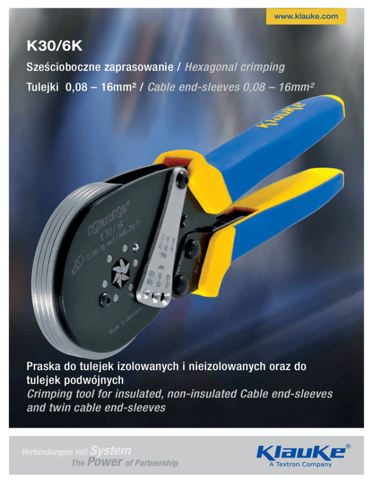 www.klauke.com K30/6K Sześcioboczne zaprasowanie / Hexagonal crimping Tulejki 0,08 – 16mm² / Cable end-sleeves 0,08 – 16mm² Praska do tulejek izolowanych i nieizolowanych oraz do tulejek podwójnych Crimping tool for insulated, non-insulated Cable end-sleeves and twin cable end-sleeves Praska ręczna Mechanical crimping tool n n n n n n Jeden profil zaprasowania dla wszystkich przekrojów od 0,08 do 16 mm 2 One crimping profile for cross-sections from 0,08 – 16 mm² by automatic cross-sectional area adjustment Zaprasowanie sześcioboczne Hexagonal crimping Z systemem zapadkowym pozwalającym na kontrolowanie zaprasowania With ratchet for smooth controlled press results Boczne wprowadzanie tulejki Lateral insertion (Side crimping) Ułatwienie pozycjonowania małych tulejek 0,08 – 4 mm² Positioner for exact crimping results with small cable end-sleeves 0,08 – 4 mm² Nieślizgające się uchwyty i miejsce do opisu narzędzia Non-slip handles and marking field Samonastawianie i ergonomia Self-adjusting & Ergonomic Dane techniczne / Technical data 0,08 – 16 mm² 0,08 – 16 mm² 2 x 0,5 – 2 x 6 mm² Długość: / Length: 215 mm Masa: / Weight: 0,5 kg Symbol Part No. Nazwa / Item Praska ręczna do tulejek i tulejek podwójnych 0,08 – 16 mm² Crimping tool for cable end-sleeves and twin cable end-sleeves 0,08 – 16 mm² Wariant / Variant K306K Symbol Part No. L-BOXX z praską do tulejek 0,5 – 16 mm² LBOXXMINIK306K L-BOXX with Crimping tool for cable end-sleeves 0,5 – 16 mm² Zakres dostawy / Scope of supply Praska ręczna do i tulejek podwójnych 0,08 – 16 mm² Crimping tool for cable end-sleeves 0,08 – 16 mm² Nożyce do kabli do o 12 mm Hand-operated cutting tool to 12 mm dia. Tulejek izolowane 1,5 mm² 100 sztuk Insulated cable end-sleeves 1,5 mm² 100 pieces Tulejek izolowane 2,5 mm² 100 sztuk Insulated cable end-sleeves 2,5 mm² 100 pieces Tulejek izolowane 4 mm² 50 sztuk Insulated cable end-sleeves 4 mm² 50 pieces Tulejek izolowane 6 mm² 50 sztuk Insulated cable end-sleeves 6 mm² 50 pieces Tulejek izolowane 10 mm² 30 sztuk Insulated cable end-sleeves 10 mm² 30 pieces L-BOXX-Mini L-BOXX-Mini K306K K118 4728 47312 47412 K30/6K Praska ręczna Mechanical crimping tool 47512 47612 Klauke Polska Sp. z o.o. • ul. Piłsudskiego 243 • 05-270 Marki • Tel.: +48 226141815 E-Mail: [email protected] • www.klauke-polska.pl © 2015 Gustav Klauke GmbH. All rights reserved. Technische Änderungen vorbehalten. FLK3015GBPL 5000 06/15 I Pełny zakres: Crimping range total: Tulejki: Cable end-sleeves: Tulejki podwójne: Twin cable end-sleeves: