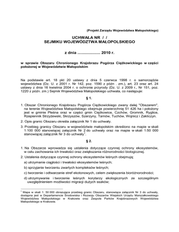 (Projekt Zarządu Województwa Małopolskiego) UCHWAŁA NR / / SEJMIKU WOJEWÓDZTWA MAŁOPOLSKIEGO z dnia .................... 2010 r. w sprawie Obszaru Chronionego Krajobrazu Pogórza CięŜkowickiego w części połoŜonej w Województwie Małopolskim Na podstawie art. 18 pkt 20 ustawy z dnia 5 czerwca 1998 r. o samorządzie województwa (Dz. U. z 2001 r. Nr 142, poz. 1590 z późn . zm.), art. 23 oraz art. 24 ustawy z dnia 16 kwietnia 2004 r. o ochronie przyrody (Dz. U. z 2009 r., Nr 151, poz. 1220 z późn. zm.) Sejmik Województwa Małopolskiego uchwala, co następuje: § 1. 1. Obszar Chronionego Krajobrazu Pogórza CięŜkowickiego zwany dalej "Obszarem", na terenie Województwa Małopolskiego obejmuje powierzchnię 51 426 ha i połoŜony jest w gminie Pleśna oraz w części gmin CięŜkowice, Czchów, Gromnik, Ryglice, Rzepiennik StrzyŜewski, Skrzyszów, Szerzyny, Tarnów, Tuchów, Wojnicz i Zakliczyn. 2. Opis granic Obszaru określa załącznik Nr 1 do uchwały. 3. Przebieg granicy Obszaru w województwie małopolskim określono na mapie w skali 1:100 000 stanowiącej załącznik Nr 2 do uchwały oraz na mapie w skali 1:50 000 stanowiącej załącznik Nr 3 do uchwały1. § 2. 1. Na Obszarze wprowadza się ustalenia dotyczące czynnej ochrony ekosystemów, w celu zachowania ich trwałości oraz zwiększania róŜnorodności biologicznej. 2. Ustalenia dotyczące czynnej ochrony ekosystemów leśnych obejmują: a) utrzymanie ciągłości i trwałości ekosystemów leśnych; b) sprzyjanie tworzeniu zwartych kompleksów leśnych; c) tworzenie i odtwarzanie stref ekotonowych, celem zwiększenia bioróŜnorodności; d) utrzymywanie i tworzenie leśnych korytarzy ekologicznych ze szczególnym uwzględnieniem moŜliwości migracji duŜych ssaków; 1 Mapa w skali 1: 50 000 obrazująca przebieg granic Obszaru, stanowiąca załącznik Nr 3 do uchwały, dostępna jest w Departamencie Środowiska i Rozwoju Obszarów Wiejskich Urzędu Marszałkowskiego Województwa Małopolskiego w Krakowie oraz Zespole Parków Krajobrazowych Województwa Małopolskiego w Krakowie. e) zalesianie i zadrzewianie gruntów mało przydatnych do produkcji rolnej i nie przeznaczonych na inne cele, z wyłączeniem terenów na których występują nieleśne siedliska przyrodnicze podlegające ochronie, siedliska gatunków roślin, grzybów i zwierząt związanych z ekosystemami nieleśnymi, a takŜe miejsca pełniące funkcje punktów i ciągów widokowych na terenach o duŜych wartościach krajobrazowych; f) pozostawianie drzew o charakterze pomnikowym, drzew dziuplastych, części drzew obumarłych aŜ do całkowitego ich rozkładu; g) zachowanie śródleśnych cieków, mokradeł, polan, torfowisk, wrzosowisk, muraw kserotermicznych i piaskowych oraz polan o wysokiej bioróŜnorodności; h) utrzymanie odpowiedniego poziomu wód gruntowych dla zachowania siedlisk wilgotnych i bagiennych; i) zachowanie i grzybów; siedlisk chronionych i zagroŜonych gatunków roślin, zwierząt j) działania na rzecz czynnej ochrony oraz reintrodukcji rzadkich i zagroŜonych gatunków roślin, zwierząt i grzybów. 3. Ustalenia dotyczące czynnej ochrony ekosystemów nieleśnych obejmują: a) przeciwdziałanie procesom zarastania łąk i pastwisk cennych ze względów przyrodniczych i krajobrazowych; b) zachowanie śródpolnych torfowisk, obszarów wodno-błotnych, oczek wodnych wraz z pasem roślinności stanowiącej ich obudową biologiczną oraz obszarów źródliskowych cieków; c) kształtowanie zróŜnicowanego krajobrazu rolniczego poprzez zachowanie mozaiki pól uprawnych, miedz, płatów wieloletnich ziołorośli, a takŜe ochronę istniejących oraz formowanie nowych zadrzewień i zakrzewień śródpolnych i przydroŜnych; d) utrzymanie i zwiększanie powierzchni trwałych uŜytków zielonych; e) prowadzenie zabiegów agrotechnicznych z uwzględnieniem wymogów zbiorowisk roślinnych i zasiedlających je gatunków fauny, zwłaszcza ptaków (odpowiednie terminy, częstość i techniki koszenia); f) utrzymanie poziomu bioróŜnorodności; wód gruntowych odpowiedniego dla zachowania g) zachowanie i odtwarzanie korytarzy ekologicznych; h) zachowanie i grzybów; siedlisk chronionych i zagroŜonych gatunków roślin, zwierząt i) działania na rzecz czynnej ochrony oraz reintrodukcji rzadkich i zagroŜonych gatunków roślin, zwierząt i grzybów. 4. Ustalenia w zakresie czynnej ochrony ekosystemów wodnych obejmują: a) zachowanie zbiorników wód powierzchniowych wraz z ich naturalną obudową biologiczną; b) utrzymanie i tworzenie stref buforowych wzdłuŜ cieków wodnych oraz wokół zbiorników wodnych, w tym starorzeczy i oczek wodnych, w postaci pasów szuwarów, zakrzewień i zadrzewień, jako naturalnej obudowy biologicznej, celem zwiększenia bioróŜnorodności oraz ograniczenia spływu substancji biogennych; c) prowadzenie prac regulacyjnych cieków wodnych tylko w zakresie niezbędnym dla ochrony przeciwpowodziowej i w oparciu o zasady dobrej praktyki utrzymania rzek i potoków górskich; d) zwiększanie retencji wodnej, odtwarzania funkcji obszarów źródliskowych o duŜych zdolnościach retencyjnych; e) zachowanie i odtwarzanie korytarzy ekologicznych opartych o ekosystemy wodne, celem zachowania dróg migracji gatunków; f) działania na rzecz czynnej ochrony oraz reintrodukcji rzadkich i zagroŜonych gatunków roślin, zwierząt i grzybów. § 3. 1. Na terenie Obszaru zakazuje się: 1) zabijania dziko występujących zwierząt, niszczenia ich nor, legowisk, innych schronień i miejsc rozrodu oraz tarlisk, złoŜonej ikry, z wyjątkiem amatorskiego połowu ryb oraz wykonywania czynności związanych z racjonalną gospodarką rolną, leśną, rybacką i łowiecką; 2) realizacji przedsięwzięć mogących znacząco oddziaływać na środowisko w rozumieniu przepisów ustawy z dnia 3 października 2008 r. o udostępnieniau informacji o środowisku i jego ochronie, udziale społeczeństwa w ochronie środowiska ora