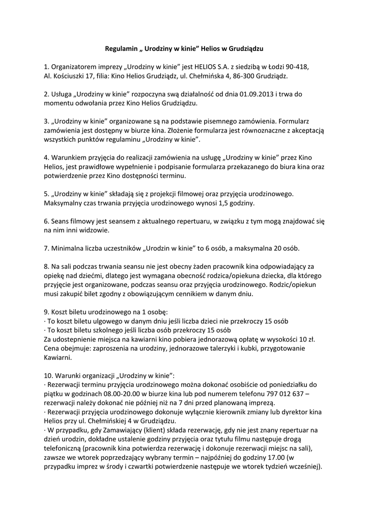 Regulamin „ Urodziny w kinie” Helios w Grudziądzu 1. Organizatorem imprezy „Urodziny w kinie” jest HELIOS S.A. z siedzibą w Łodzi 90-418, Al. Kościuszki 17, filia: Kino Helios Grudziądz, ul. Chełmińska 4, 86-300 Grudziądz. 2. Usługa „Urodziny w kinie” rozpoczyna swą działalność od dnia 01.09.2013 i trwa do momentu odwołania przez Kino Helios Grudziądzu. 3. „Urodziny w kinie” organizowane są na podstawie pisemnego zamówienia. Formularz zamówienia jest dostępny w biurze kina. Złożenie formularza jest równoznaczne z akceptacją wszystkich punktów regulaminu „Urodziny w kinie”. 4. Warunkiem przyjęcia do realizacji zamówienia na usługę „Urodziny w kinie” przez Kino Helios, jest prawidłowe wypełnienie i podpisanie formularza przekazanego do biura kina oraz potwierdzenie przez Kino dostępności terminu. 5. „Urodziny w kinie” składają się z projekcji filmowej oraz przyjęcia urodzinowego. Maksymalny czas trwania przyjęcia urodzinowego wynosi 1,5 godziny. 6. Seans filmowy jest seansem z aktualnego repertuaru, w związku z tym mogą znajdować się na nim inni widzowie. 7. Minimalna liczba uczestników „Urodzin w kinie” to 6 osób, a maksymalna 20 osób. 8. Na sali podczas trwania seansu nie jest obecny żaden pracownik kina odpowiadający za opiekę nad dziećmi, dlatego jest wymagana obecność rodzica/opiekuna dziecka, dla którego przyjęcie jest organizowane, podczas seansu oraz przyjęcia urodzinowego. Rodzic/opiekun musi zakupić bilet zgodny z obowiązującym cennikiem w danym dniu. 9. Koszt biletu urodzinowego na 1 osobę: · To koszt biletu ulgowego w danym dniu jeśli liczba dzieci nie przekroczy 15 osób · To koszt biletu szkolnego jeśli liczba osób przekroczy 15 osób Za udostepnienie miejsca na kawiarni kino pobiera jednorazową opłatę w wysokości 10 zł. Cena obejmuje: zaproszenia na urodziny, jednorazowe talerzyki i kubki, przygotowanie Kawiarni. 10. Warunki organizacji „Urodziny w kinie”: · Rezerwacji terminu przyjęcia urodzinowego można dokonać osobiście od poniedziałku do piątku w godzinach 08.00-20.00 w biurze kina lub pod numerem telefonu 797 012 637 – rezerwacji należy dokonać nie później niż na 7 dni przed planowaną imprezą. · Rezerwacji przyjęcia urodzinowego dokonuje wyłącznie kierownik zmiany lub dyrektor kina Helios przy ul. Chełmińskiej 4 w Grudziądzu. · W przypadku, gdy Zamawiający (klient) składa rezerwację, gdy nie jest znany repertuar na dzień urodzin, dokładne ustalenie godziny przyjęcia oraz tytułu filmu następuje drogą telefoniczną (pracownik kina potwierdza rezerwację i dokonuje rezerwacji miejsc na sali), zawsze we wtorek poprzedzający wybrany termin – najpóźniej do godziny 17.00 (w przypadku imprez w środy i czwartki potwierdzenie następuje we wtorek tydzień wcześniej). W pozostałych przypadkach potwierdzenie godziny następuje w momencie złożenia formularza zamówienia. · Kino Helios Grudziądz nie ponosi odpowiedzialności za rzeczy pozostawione na terenie kina. 11. Kino Helios jest jedynie organizatorem „Urodzin w kinie” i nie sprawuje nadzoru nad uczestnikami podczas przyjęcia i seansu filmowego. 12. Organizator zastrzega sobie prawo do zmian w regulaminie, wyłącznie z ważnych przyczyn, których nie mógł przewidzieć i zmiany te nie mogą powodować pogorszenia sytuacji prawnej i faktycznej zamawiającego. ****