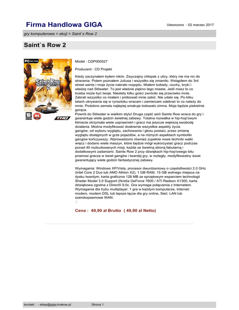 Firma Handlowa GIGA Utworzono : 02 marzec 2017 gry komputerowe > akcji > Saint`s Row 2 Saint`s Row 2 Model : CDP000527 Producent : CD Projekt Kiedy zaczynałem byłem nikim. Zwyczajny chłopak z ulicy, który nie ma nic do stracenia. Potem poznałem Juliusa i wszystko się zmieniło. Wstąpiłem do 3rd street saints i moje życie nabrało rozpędu. Miałem kobiety, ciuchy, bryki i władzę nad Stilwater. To jest właśnie piękno tego miasta. Jeśli masz to co trzeba może być twoje. Niestety kilku gości zwróciło się przeciwko mnie. Zabrali wszystko co miałem i próbowali mnie zabić. Nie udało się. Po kliku latach ukrywania się w rynsztoku wracam i zamierzam odebrać to co należy do mnie. Podobno zemsta najlepiej smakuje lodowato zimna. Moja będzie piekielnie gorąca. Powrót do Stilwater w wielkim stylu! Druga część serii Saints Row wraca do gry i gwarantuje wiele godzin świetnej zabawy. Totalna rozwałka w hip-hop'owym klimacie otrzymała wiele usprawnień i gracz ma jeszcze większą swobodę działania. Można modyfikować dosłownie wszystkie aspekty życia gangów, od wyboru wyglądu, zachowania i głosu postaci, przez zmianę wyglądu dostępnych w grze pojazdów, a na różnych aspektach symboliki gangów kończywszy. Wprowadzono również zupełnie nowe techniki walki wręcz i dodano wiele maszyn, które będzie mógł wykorzystać gracz podczas ponad 40 rozbudowanych misji, każda ze świetną stroną fabularną i dodatkowymi zadaniami. Saints Row 2 przy dźwiękach hip-hop'owego bitu przenosi gracza w świat gangów i twardej gry, w rozległy, modyfikowalny świat gwarantujący wiele godzin fantastycznej zabawy. Wymagania: Windows XP/Vista, procesor dwurdzeniowy o częstotliwości 2.0 GHz (Intel Core 2 Duo lub AMD Athlon X2), 1 GB RAM, 15 GB wolnego miejsca na dysku twardym, karta graficzna 128 MB ze sprzętowym wsparciem technologii Shader Model 3.0 Support (Nvidia GeForce 7600 / ATI Radeon X1300, karta dźwiękowa zgodna z DirectX 9.0c. Gra wymaga połączenia z Internetem. Wymagania dla trybu multiplayer: 1 gra w każdym komputerze, Internet: modem, modem DSL lub lepsze łącze dla gry online, Sieć: LAN lub szerokopasmowe WAN. � Cena : 49,90 zł Brutto ( 49,90 zł Netto) kontakt : - [email protected] Strona 1