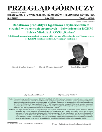 PRZEGLĄD GÓRNICZY Nr 2 PRZEGLĄD GÓRNICZY 1 założono 01.10.1903 r. MIESIĘCZNIK STOWARZYSZENIA INŻYNIERÓW I TECHNIKÓW GÓRNICTWA Nr 2 (1107) Tom 71 (LXXI) luty 2015 UKD 622.34:622.23:622.1:550.8 Dodatkowa profilaktyka tąpaniowa z wykorzystaniem strzelań w warstwach stropowych – doświadczenia kghm polska miedź s.A. O/zg „rudna” Additional prevention against tremors with the use of blasting in roof layers – tests of KGHM Polska Miedź S.A. ”Rudna” coal mine Mgr inż. Arkadiusz Anderko*) Mgr inż. Mirosław Laskowski*) Mgr inż. Robert Osman*) dr inż. Adam Mirek**) Mgr inż. Jerzy Wróbel*) Treść: Przedstawiono przypadki stosowania w KGHM Polska Miedź S.A. O/ZG „Rudna” strzelań w warstwach stropowych w ramach profilaktyki tąpaniowej w różnych uwarunkowaniach geologiczno-górniczych. Omówiono genezę, przebieg i efektywność odprężenia górotworu strzelaniem długimi otworami w warstwach stropowych na przykładzie pól eksploatacyjnych G-23/1, G-1/7, X/1, G-7/5 i G-11/8. W przypadku pól G-23/1 i G-1/7, z uwagi na rodzaj użytego MW i długość otworów strzałowych rzędu 60 m, konieczne było opracowanie przez służby kopalni wielu szczegółów technicznych dotyczących konstrukcji i sposobu ładowania MW oraz jego zabezpieczenia przed wypadnięciem z otworu. Abstract: This paper presents the cases of using blasting in roof layers in the framework of prevention against tremors in different geological and mining conditions, performed in KGHM Polska Miedź S.A. “Rudna” coal mine. It describes the origin, course and efficiency of rock mass decompression thanks to blasting with long blast-holes in roof layers on the example of exploitation fields G-23/1, G-1/7, X/1, G-7/5 and G-11/8. In cases of fields G-23/1 and G-1/7, it was necessary to develop a series of technical details, concerning the structure and manner of loading the blasting material and securing it against falling down the hole, because of the type of the used blasting material and the length of blast-holes amounting to 60m. *) KGHM Polska Miedź S.A. O/ZG Rudna, **) ITI EMAG Uwaga – Redakcja nie otrzymała od autorów fotografii 2 PRZEGLĄD GÓRNICZY 2015 Słowa kluczowe: geologia, górnictwo, eksploatacja złoża, profilaktyka tąpaniowa Key words: geology, mining, deposit exploitation, prevention against tremors 1. Wprowadzenie Własności geomechaniczne górotworu, jego znaczne zaangażowanie tektoniczne oraz sukcesywny przyrost powierzchni wybranej, a tym samym konieczność prowadzenia eksploatacji w warunkach skrępowanych, to główne czynniki decydujące o wysokim poziomie sejsmiczności i zagrożenia tąpaniami w O/ZG „Rudna”. Uwarunkowania takie przy prowadzeniu robót górniczych wymagają bieżącego stosowania i sukcesywnego rozwijania profilaktyki tąpaniowej. W O/ ZG „Rudna”, w ramach aktywnych metod profilaktycznych w szczególnie złożonych warunkach geologiczno-górniczych, podjęto próbę ingerencji robotami strzałowymi w sztywne warstwy stropowe. Pierwsze takie, doraźne strzelania w stropie, otworami odwierconymi nad rozcinaną calizną i sięgającymi przystropowych partii węglanów (~60 m), wykonano w polach G-23/1 i G-1/7. W późniejszym okresie podobne strzelania, lecz większą liczbą otworów, o długości około 15 m, wykonano w polu G-7/5 (w otoczeniu resztki calizny podzielonej uskokiem) oraz w polu X/1, usytuowanym w bliskim sąsiedztwie Synkliny Paulinowa. Od 2010 r. w polu G-11/8 prowadzono sukcesywne strzelania torpedujące w stropie z wyrobisk przyzrobowych, usytuowanych między pozostawioną resztką a narożem rozcinanej calizny. 2. Pole G-23/1 W dniu 18.07.2000 r. w polu G-23/1 KGHM Polska Miedź S.A O/ZG „Rudna” miało miejsce tąpnięcie wskutek samoistnego wstrząsu górotworu o energii 2,0E9J. Epicentrum wstrząsu zlokalizowano na krawędzi wydzielonego filara zasobów nieprzemysłowych, na przedłużeniu komory K-1 i pasa P-17. We wrześniu 2000 r. uruchomiono eksploatację w tym polu, a po uzyskaniu około 10 m postępu przodków rozpoczęto roboty związane z wykonywaniem strzelania torpedującego w stropie. Zgodnie z zaleceniem Komisji ds. Tąpań, Obudowy i Kierowania Stropem w Zakładach Górniczych Wydobywających Rudy Miedzi strzelanie wykonano według następujących założeń: 1. Wzdłuż frontu odwiercono cztery otwory sięgające przystropowych partii węglanów, przy czym końce otworów znajdowały się nad strefą zawartą między 45÷55 m rozcinanej calizny licząc od upadowej K-3; 2. Trzy otwory zlokalizowano w bliskim sąsiedztwie uskoków przebiegających w polu, nadając im kierunek zbliżony do przebiegu tych uskoków. Czwarty otwór zlokalizowano w pasie P-23 w sąsiedztwie komory K-18; 3.Sumaryczny ładunek MW zawarty w tych otworach około 1000 kg. Strzelanie torpedujące w stropie wykonano w dniu 14.10.2000 r. odpalając 948 kg emulgitu 82 GP załadowanego ręcznie do otworów o długości 60 m i średnicy 93 mm. Schemat wykonanych strzelań torpedujących przedstawiono na rysunku 1. Bezpośrednio po odpaleniu MW zarejestrowano (w polu G-23/1) wstrząs o energii 8,6E3J. Strzelanie ładunków MW w otworach o długości rzędu kilkudziesięciu metrów było wykonywane po raz pierwszy w kopalniach KGHM. Do tego czasu podobne roboty wykonywane były w otworach w stropie o głębokości do 15 m i w otworach poziomych długości do 25 m. 3. Pole G-1/7 [2] W dniu 5.08.2005 r. w polu G-1/7 doszło do tąpnięcia związanego z samoistnym wstrząsem górotworu o energii 6,4E7J. Eksploatację w tym polu zatrzymano do czasu dokonania analizy sytuacji geologiczno-górniczej oraz oceny stanu zagrożenia tąpaniami i zawałami w rejonie prowadzonej eksploatacji. Po przeprowadzeniu stosownych analiz opracowano nowy projekt, w którym jednym Rys. 1.Schemat wykonanych strzelań torpedujących w polu G-23/1 w dniu 14.10.2000 r. Fig. 1. Scheme of torpedoing blasts in field G-23/1 from 14 October 2000 Nr 2 PRZEGLĄD G