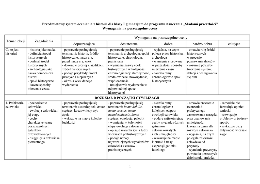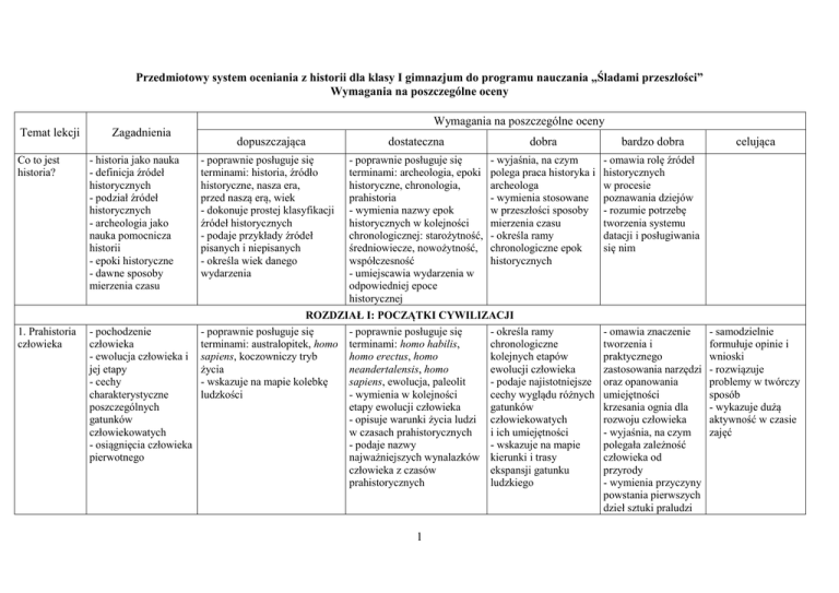 Przedmiotowy system oceniania z historii dla klasy I gimnazjum do programu nauczania „Śladami przeszłości” Wymagania na poszczególne oceny Wymagania na poszczególne oceny Temat lekcji Co to jest historia? 1. Prahistoria człowieka Zagadnienia - historia jako nauka - definicja źródeł historycznych - podział źródeł historycznych - archeologia jako nauka pomocnicza historii - epoki historyczne - dawne sposoby mierzenia czasu dopuszczająca - poprawnie posługuje się terminami: historia, źródło historyczne, nasza era, przed naszą erą, wiek - dokonuje prostej klasyfikacji źródeł historycznych - podaje przykłady źródeł pisanych i niepisanych - określa wiek danego wydarzenia dostateczna dobra bardzo dobra - poprawnie posługuje się terminami: archeologia, epoki historyczne, chronologia, prahistoria - wymienia nazwy epok historycznych w kolejności chronologicznej: starożytność, średniowiecze, nowożytność, współczesność - umiejscawia wydarzenia w odpowiedniej epoce historycznej - wyjaśnia, na czym polega praca historyka i archeologa - wymienia stosowane w przeszłości sposoby mierzenia czasu - określa ramy chronologiczne epok historycznych - omawia rolę źródeł historycznych w procesie poznawania dziejów - rozumie potrzebę tworzenia systemu datacji i posługiwania się nim ROZDZIAŁ I: POCZĄTKI CYWILIZACJI - pochodzenie - poprawnie posługuje się - poprawnie posługuje się - określa ramy człowieka terminami: australopitek, homo terminami: homo habilis, chronologiczne - ewolucja człowieka i sapiens, koczowniczy tryb homo erectus, homo kolejnych etapów jej etapy życia neandertalensis, homo ewolucji człowieka - cechy - wskazuje na mapie kolebkę sapiens, ewolucja, paleolit - podaje najistotniejsze charakterystyczne ludzkości - wymienia w kolejności cechy wyglądu różnych poszczególnych etapy ewolucji człowieka gatunków gatunków - opisuje warunki życia ludzi człowiekowatych człowiekowatych w czasach prahistorycznych i ich umiejętności - osiągnięcia człowieka - podaje nazwy - wskazuje na mapie pierwotnego najważniejszych wynalazków kierunki i trasy człowieka z czasów ekspansji gatunku prahistorycznych ludzkiego 1 - omawia znaczenie tworzenia i praktycznego zastosowania narzędzi oraz opanowania umiejętności krzesania ognia dla rozwoju człowieka - wyjaśnia, na czym polegała zależność człowieka od przyrody - wymienia przyczyny powstania pierwszych dzieł sztuki praludzi celująca - samodzielnie formułuje opinie i wnioski - rozwiązuje problemy w twórczy sposób - wykazuje dużą aktywność w czasie zajęć Tajemnice sprzed wieków – Jak zbadano pochodzenie człowieka? 2. Czas wielkich przemian - teorie dotyczące powstania człowieka - Karol Darwin i jego odkrycie - zadania antropologii - wpływ zmian klimatu na życie człowieka - rewolucja neolityczna - początki rolnictwa i hodowli - pierwsze osady - budowle megalityczne - początek metalurgii - przedstawia główne założenia teorii Karola Darwina - wymienia teorie dotyczące powstania człowieka - poprawnie posługuje się terminami: rewolucja neolityczna, osiadły tryb życia, osada, epoka brązu, epoka żelaza - przedstawia zmiany, które zaszły w życiu człowieka w okresie neolitu - podaje nazwy metali wykorzystywanych przez praludzi do wytopu broni, narzędzi, ozdób - poprawnie posługuje się terminami: ewolucjonizm, antropologia - opisuje, czym zajmuje się antropolog - omawia sposoby ustalania wieku znalezisk - omawia teorię ewolucji Karola Darwina - wyjaśnia różnice między teorią kreacjonizmu a ewolucjonizmu - przedstawia znaczenie badań naukowych oraz wykorzystania różnych technologii dla poznania historii człowieka - poprawnie posługuje się terminami: neolit, megalit - określa ramy chronologiczne rewolucji neolitycznej - opisuje życie codzienne ludzi przed rewolucją neolityczną - omawia sposób wytopu brązu i żelaza - przedstawia wpływ zmian klimatycznych na tryb życia człowieka pierwotnego - omawia tryb życia i zajęcia ludzi epoki neolitu - nazywa i lokalizuje na mapie pozostałości najstarszej znanej osady ludzkiej - wskazuje na mapie miejsce położenia najbardziej znanej budowli megalitycznej - wyjaśnia, jakie zmiany nastąpiły w życiu człowieka dzięki opanowaniu - omawia tryb życia i zajęcia ludzi epoki neolitu - charakteryzuje wygląd osad neolitycznych - opisuje wygląd i funkcje budowli megalitycznych 2 - prezentuje argumenty zwolenników i przeciwników ewolucjonizmu Ponadto: - samodzielnie formułuje opinie i wnioski - rozwiązuje problemy w twórczy sposób - wykazuje dużą aktywność w czasie zajęć - uzasadnia słuszność określenia rewolucja dla zmian, które zaszły w życiu człowieka w okresie neolitu Ponadto: - samodzielnie formułuje opinie i wnioski - rozwiązuje problemy w twórczy sposób - wykazuje dużą aktywność w czasie zajęć 3. W kraju Sumerów 4. Babilonia i Asyria umiejętności wytopu metali - położenie - poprawnie posługuje się - podaje ramy chronologiczne - charakteryzuje geograficzne i warunki terminami: cywilizacja, istnienia cywilizacji oddziaływanie naturalne Mezopotamii Mezopotamia, system sumeryjskiej warunków naturalnych - powstanie pierwszych irygacyjny, Sumerowie, miasto- - poprawnie posługuje się na życie mieszkańców państw państwo terminami: Żyzny Półksiężyc, Mezopotamii - organizacja państwa - lokalizuje na mapie król-kapłan, zikkurat Sumerów Mezopotamię - określa rolę rzek w - osiągnięcia - omawia położenie starożytnej Mezopotamii cywilizacji geograficzne i warunki - opisuje wygląd miast sumeryjskiej naturalne panujące w sumeryjskich Mezopotamii - wymienia osiągnięcia Sumerów - państwo babilońskie - Hammurabi i jego kodeks prawny - Babilon - państwo asyryjskie - organizacja armii asyryjskiej - poprawnie posługuje się terminami: Babilon, Kodeks Hammurabiego, politeizm - określa, kim był i czym zasłynął Hammurabi - 