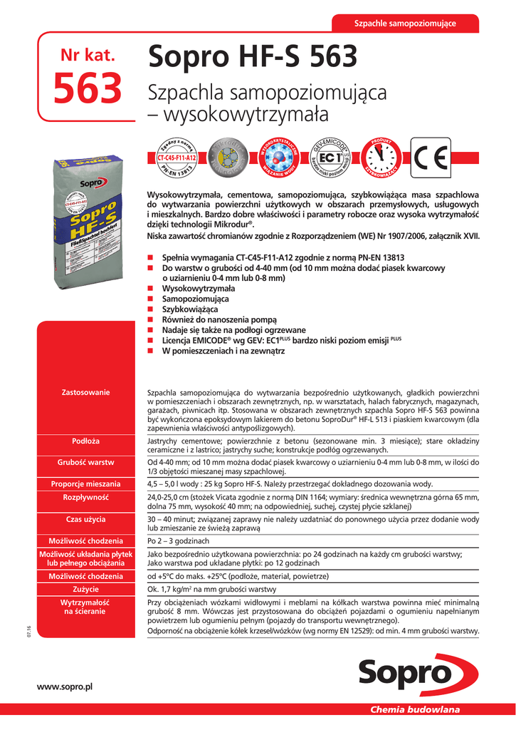 Szpachle samopoziomujące Szpachla samopoziomująca – wysokowytrzymała ZA O N IE W i s ji nis em IĄ Y 3 1 zo 138 b ar d -EN W P N NE CZ CT-C45-F11-A12 DU PRO KT KRYSTAL KO I D 563 Sopro HF-S 563 WY SO Nr kat. k i p ozi o m Wysokowytrzymała, cementowa, samopoziomująca, szybkowiążąca masa szpachlowa do wytwarzania powierzchni użytkowych w obszarach przemysłowych, usługowych i mieszkalnych. Bardzo dobre właściwości i parametry robocze oraz wysoka wytrzymałość dzięki technologii Mikrodur®. Niska zawartość chromianów zgodnie z Rozporządzeniem (WE) Nr 1907/2006, załącznik XVII. Spełnia wymagania CT-C45-F11-A12 zgodnie z normą PN-EN 13813 Do warstw o grubości od 4-40 mm (od 10 mm można dodać piasek kwarcowy o uziarnieniu 0-4 mm lub 0-8 mm) Wysokowytrzymała Samopoziomująca Szybkowiążąca Również do nanoszenia pompą Nadaje się także na podłogi ogrzewane Licencja EMICODE® wg GEV: EC1PLUS bardzo niski poziom emisji PLUS W pomieszczeniach i na zewnątrz Zastosowanie Szpachla samopoziomująca do wytwarzania bezpośrednio użytkowanych, gładkich powierzchni w pomieszczeniach i obszarach zewnętrznych, np. w warsztatach, halach fabrycznych, magazynach, garażach, piwnicach itp. Stosowana w obszarach zewnętrznych szpachla Sopro HF-S 563 powinna być wykończona epoksydowym lakierem do betonu SoproDur® HF-L 513 i piaskiem kwarcowym (dla zapewnienia właściwości antypoślizgowych). Podłoża Jastrychy cementowe; powierzchnie z betonu (sezonowane min. 3 miesiące); stare okładziny ceramiczne i z lastrico; jastrychy suche; konstrukcje podłóg ogrzewanych. Grubość warstw Od 4-40 mm; od 10 mm można dodać piasek kwarcowy o uziarnieniu 0-4 mm lub 0-8 mm, w ilości do 1/3 objętości mieszanej masy szpachlowej. Proporcje mieszania 4,5 – 5,0 l wody : 25 kg Sopro HF-S. Należy przestrzegać dokładnego dozowania wody. Rozpływność 24,0-25,0 cm (stożek Vicata zgodnie z normą DIN 1164; wymiary: średnica wewnętrzna górna 65 mm, dolna 75 mm, wysokość 40 mm; na odpowiedniej, suchej, czystej płycie szklanej) Czas użycia 30 – 40 minut; związanej zaprawy nie należy uzdatniać do ponownego użycia przez dodanie wody lub zmieszanie ze świeżą zaprawą Możliwość chodzenia Możliwość układania płytek lub pełnego obciążania Możliwość chodzenia Zużycie 07.16 Wytrzymałość na ścieranie www.sopro.pl Po 2 – 3 godzinach Jako bezpośrednio użytkowana powierzchnia: po 24 godzinach na każdy cm grubości warstwy; Jako warstwa pod układane płytki: po 12 godzinach od +5ºC do maks. +25ºC (podłoże, materiał, powietrze) Ok. 1,7 kg/m2 na mm grubości warstwy Przy obciążeniach wózkami widłowymi i meblami na kółkach warstwa powinna mieć minimalną grubość 8 mm. Wówczas jest przystosowana do obciążeń pojazdami o ogumieniu napełnianym powietrzem lub ogumieniu pełnym (pojazdy do transportu wewnętrznego). Odporność na obciążenie kółek krzeseł/wózków (wg normy EN 12529): od min. 4 mm grubości warstwy. Podłogi ogrzewane Nadaje się Składowanie W oryginalnych, zamkniętych opakowaniach, w suchym miejscu na paletach, 6 miesięcy od daty produkcji. Opakowania Worek 25 kg Właściwości Przygotowanie podłoża Gruntowanie Sposób użycia Sopro HF-S jest cementową, samopoziomującą, szybkowiążącą masą szpachlową, o bardzo wysokiej wytrzymałości na ściskanie, zginanie i ścieranie. Wytrzymałość na ściskanie po 28 dniach wynosi ok. 45 N/mm2, wytrzymałość na zginanie po 28 dniach wynosi ok. 11 N/mm2, a odporność na ścieranie (przy użyciu tarczy Böhme’go) wynosi A12. Szpachla Sopro HF-S jest stosowana zarówno w pomieszczeniach, jak i na zewnątrz. Może być przetwarzana mechanicznie, cechuje ją niska zawartość chromianów. Charakteryzuje się bardzo dobrymi właściwościami i parametrami roboczymi oraz wysoką wytrzymałością dzięki technologii Mikrodur®. Podłoża muszą być suche, nośne, odporne na odkształcenia, pozbawione pęknięć oraz substancji zmniejszających przyczepność np. kurz, olej, wosk, środki antyadhezyjne, wykwity, spieki, pozostałości farb i lakierów, pozostałości klejów podłogowych. Wykruszenia i otwory należy uzupełnić przy pomocy szpachli Sopro RAM 3® 454. Pęknięcia występujące w jastrychu należy skleić (zszyć za pomocą klamer) żywicą Sopro GH 564. Jastrychy anhydrytowe muszą wykazywać się wilgotnością ≤ 0,5 % wag. oraz powinny być odpowiednio zeszlifowane, oczyszczone i zagruntowane preparatem Sopro MGR 637 lub Sopro EPG 522 z posypką z piasku kwarcowego Sopro QS 511. Jastrychy cementowe muszą być sezonowane min. 28 dni i być suche. Jastrychy wykonane z zastosowaniem szybkowiążących spoiw np. Sopro Rapidur® B5 są gotowe do układania płytek już po 3 dniach. Ogrzewane jastrychy cementowe i anhydrytowe przed rozpoczęciem układania muszą zostać poddane procedurze wygrzewania wstępnego i uzyskać wynik pomiaru wilgotności dla jastrychów cementowych ≤ 2,0% wag., dla jastrychów anhydrytowych ≤ 0,3% wag. Przy krawędziach sąsiadujących elementów budowlanych należy umieścić odpowiednią taśmę dylatacji brzegowej np. Sopro ERS 961, aby zapobiec powstawaniu naprężeń i nie dopuścić do wycieku masy szpachlowej. Jeśli w podłożu już wcześniej zostały zamontowane taśmy dylatacji brzegowej, muszą zostać sprawdzone pod względem przydatności i równej powierzchni oraz muszą mieć taką samą szerokość. Przy ocenie podłoża obowiązują branżowe zalecenia i odpowiednie normy. Wytrzymałość podłoża na odrywanie musi osiągnąć wartość co najmniej 1,5 N/mm2, w żadnym przypadku nie może wynieść poniżej 1,0 N/mm2. Powierzchnie betonowe powinny zostać oczyszczone metodą piaskowania lub śrutowania. Sopro HE 449: jastrychy cementowe, powierzchnie betonowe (sezonowane min. 3 miesiące), stare okładziny ceramiczne, z lastrico, kamienia naturalnego, płyt betonowych oraz mocno przylegające lakiery do 
