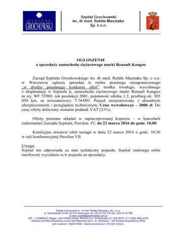 OGŁOSZENIE o sprzedaży samochodu ciężarowego marki Renault Kangoo Zarząd Szpitala Grochowskiego im. dr med. Rafała Masztaka Sp. z o.o. w Warszawie ogłasza sprzedaż w trybie przetargu nieograniczonego „w drodze pisemnego konkursu ofert” środka trwałego, wycofanego z eksploatacji w Szpitalu tj. samochodu ciężarowego marki Renault Kangoo nr rej. WF 53980, rok produkcji 2001, pojemność silnika 1.2, przebieg ok. 303 050 km, nr inwentarzowy 7-74/003. Pojazd zarejestrowany z aktualnym ubezpieczeniem i przeglądem technicznym. Cena wywoławcza – 2000 zł. Do ceny oferty doliczony zostanie podatek VAT (23%). Oferty pisemne składać w zapieczętowanej kopercie – w kancelarii (sekretariat) Zarządu Szpitala, Pawilon IV, do 22 marca 2016 do godz. 10,00 Komisyjne otwarcie ofert nastąpi w dniu 22 marca 2016 o godz. 10,30 w sali konferencyjnej Pawilon VII. Uwaga: Szpital nie odpowiada za stan techniczny pojazdu. Szpital zastrzega sobie możliwość wycofania w/w pojazdu ze sprzedaży. Szpital Grochowski im. dr med. Rafała Masztaka Sp. z o.o. ul. Grenadierów 51/59, 04-073 Warszawa, tel. (22) 51-52-716; fax. (22) 51 52 789 E-mail: [email protected] NIP: 1132869037; Regon: 002153989; Konto: PEKAO S.A. O/Warszawa 37 1240 6074 1111 0000 4992 9164 Wpisany do KRS prowadzony przez Sąd Rejonowy dla m. st. Warszawy , XIII Wydział Gospodarczy KRS pod numerem: 0000478458. Kapitał Zakładowy 5 100 000 złotych.
