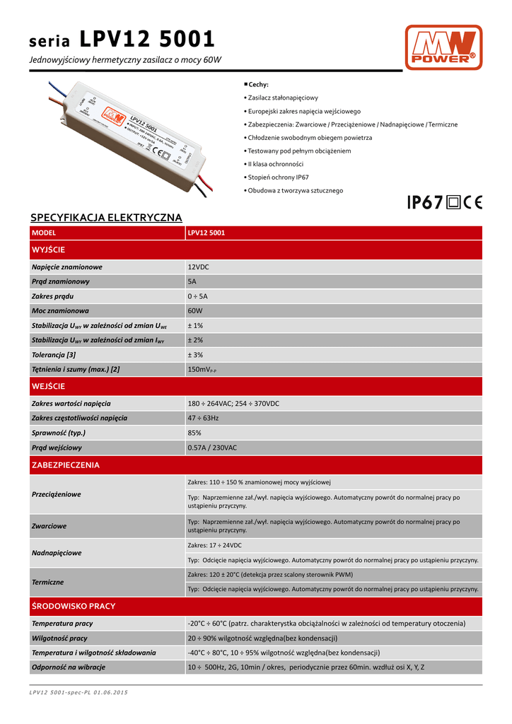 seria LPV12 5001 Jednowyjściowy hermetyczny zasilacz o mocy 60W ■ Cechy: • Zasilacz stałonapięciowy • Europejski zakres napięcia wejściowego • Zabezpieczenia: Zwarciowe / Przeciążeniowe / Nadnapięciowe / Termiczne • Chłodzenie swobodnym obiegem powietrza • Testowany pod pełnym obciążeniem • II klasa ochronności • Stopień ochrony IP67 • Obudowa z tworzywa sztucznego SPECYFIKACJA ELEKTRYCZNA MODEL LPV12 5001 WYJŚCIE Napięcie znamionowe 12VDC Prąd znamionowy 5A Zakres prądu 0 ÷ 5A Moc znamionowa 60W Stabilizacja UWY w zależności od zmian UWE ± 1% Stabilizacja UWY w zależności od zmian IWY ± 2% Tolerancja [3] ± 3% Tętnienia i szumy (max.) [2] 150mVP-P WEJŚCIE Zakres wartości napięcia 180 ÷ 264VAC; 254 ÷ 370VDC Zakres częstotliwości napięcia 47 ÷ 63Hz Sprawność (typ.) 85% Prąd wejściowy 0.57A / 230VAC ZABEZPIECZENIA Zakres: 110 ÷ 150 % znamionowej mocy wyjściowej Przeciążeniowe Zwarciowe Nadnapięciowe Termiczne Typ: Naprzemienne zał./wył. napięcia wyjściowego. Automatyczny powrót do normalnej pracy po ustąpieniu przyczyny. Typ: Naprzemienne zał./wył. napięcia wyjściowego. Automatyczny powrót do normalnej pracy po ustąpieniu przyczyny. Zakres: 17 ÷ 24VDC Typ: Odcięcie napięcia wyjściowego. Automatyczny powrót do normalnej pracy po ustąpieniu przyczyny. Zakres: 120 ± 20°C (detekcja przez scalony sterownik PWM) Typ: Odcięcie napięcia wyjściowego. Automatyczny powrót do normalnej pracy po ustąpieniu przyczyny. ŚRODOWISKO PRACY Temperatura pracy -20°C ÷ 60°C (patrz. charakterystka obciążalności w zależności od temperatury otoczenia) Wilgotność pracy 20 ÷ 90% wilgotność względna(bez kondensacji) Temperatura i wilgotność składowania -40°C ÷ 80°C, 10 ÷ 95% wilgotność względna(bez kondensacji) Odporność na wibracje 10 ÷ 500Hz, 2G, 10min / okres, periodycznie przez 60min. wzdłuż osi X, Y, Z LPV12 5001-spec-PL 01.06.2015 seria LPV12 5001 Jednowyjściowy hermetyczny zasilacz o mocy 60W NORMY BEZPIECZEŃSTWA I KOMPATYBILNOŚCI ELEKTROMAGNETYCZNEJ Wytrzymałość izolacji WE/WY: 3kVAC Normy bezpieczeństwa Zgodność z EN60950-1 Normy emisji EMC Zgodność z EN55022 Normy odporności EMC Zgodność z EN55024; EN61000-4-2, -3, -4, -5, -6, -8, -11 Prąd harmonicznych Zgodność z EN61000-3-3; EN61000-3-2 Rezystancja izolacji WE/WY:100MΩ (500V/25°C/70%RH) POZOSTAŁE Wymiary 163.5 x 42 x 32mm (dł. x szer. x wys.) Masa i opakowanie 380g; 56szt./karton; masa i wymiary kartonu: 22kg; 40 x 26 x 29cm 1. Podane parametry(jeśli nie zaznaczono inaczej) zmierzono dla napięcia zasilania 230VAC, obciążenia znamionowego w temperaturze otoczenia 25°C. 2. Tętnienia i szumy zmierzono dla pasma 20MHz używając skręconych przewodów pomiarowych oraz kondensatorów 0.1μF i 47μF połączonych ze sobą równolegle. 3. Tolerancja wyraża maksymalną rozbieżność napięcia wyjściowego uwzględniając zmiany przy załączaniu, w zależności od zmian napięcia wejściowego oraz w zależności od zmian prądu obciążenia. 4. Zasilacz spełnia normy bezpieczeństwa oraz kompatybilności elektromagnetycznej. W przypadku instalacji zasilacza w finalnym urządzeniu jako podzespół, należy ponownie wykonać badania celem weryfikacji spełnienia norm dla całego układu. SPECYFIKACJA MECHANICZNA 163.5 WEJŚCIE 3.5 UL1015 2x18AWG(0.824mm 2) dł. = 250 ± 30mm 3.5 AC/L (brązowy) Ф3.5 Ф3.5 AC/L (BROWN) V+ (RED) INPUT: 200-240VAC, 0.6A, 50/60Hz OUTPUT: +12V 5A CONST ANT VOLTAGE V(BLACK) IP67 Ф3.5 WYJŚCIE UL1015 2x18AWG(0.824mm 2) dł. = 250 ± 30mm 42 AC/N (BLUE) AC/N (niebieski) LPV series OUTPUT LPV12 5001 V+ (czerwony) V- (czarny) 32 3.5 100 90 80 70 60 50 40 30 20 -20 0 10 20 30 40 50 Praca w pozycji TEMPERATURA OTOCZENIA [°C] poziomej LPV12 5001-spec-PL 01.06.2015 CHARAKTERYSTYKA OBCIĄŻALNOŚCI W ZALEŻNOŚCI OD NAPIĘCIA WEJŚCIOWEGO OBCIĄŻENIE / OBCIĄŻENIE ZNAMIONOWE [%] OBCIĄŻENIE / OBCIĄŻENIE ZNAMIONOWE [%] CHARAKTERYSTYKA OBCIĄŻALNOŚCI W ZALEŻNOŚCI OD TEMPERATURY OTOCZENIA 60 70 100 90 80 70 60 50 40 30 20 180 200 220 240 NAPIĘCIE WEJŚCIOWE [VAC / 60Hz] 264 277