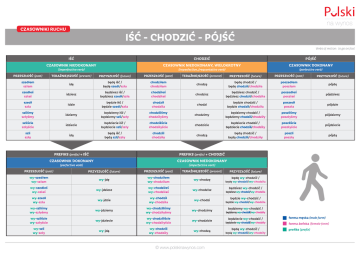 na wynos CZASOWNIKI RUCHU IŚĆ - CHODZIĆ - PÓJŚĆ Verbs of motion: to go on foot IŚĆ CHODZIĆ PÓJŚĆ CZASOWNIK NIEDOKONANY CZASOWNIK NIEDOKONANY, WIELOKROTNY CZASOWNIK DOKONANY (imperfective verb) PRZESZŁOŚĆ (past) (imperfective, frequentative verb) (perfective verb) TERAŹNIEJSZOŚĆ (present) PRZYSZŁOŚĆ (future) PRZESZŁOŚĆ (past) TERAŹNIEJSZOŚĆ (present) PRZYSZŁOŚĆ (future) PRZESZŁOŚĆ (past) PRZYSZŁOŚĆ (future) szedłem szłam idę będę iść / będę szedł/szła chodziłem chodziłam chodzę będę chodzić / będę chodził/chodziła poszedłem poszłam pójdę szedłeś szłaś idziesz będziesz iść / będziesz szedł/szła chodziłeś chodziłaś chodzisz będziesz chodzić / będziesz chodził/chodziła poszedłeś poszłaś pójdziesz szedł szła idzie będzie iść / będzie szedł/szła chodził chodziła chodzi będzie chodzić / będzie chodził/chodziła poszedł poszła pójdzie szliśmy szłyśmy idziemy będziemy iść / będziemy szli/szły chodziliśmy chodziłyśmy chodzimy będziemy chodzić / będziemy chodzili/chodziły poszliśmy poszłyśmy pójdziemy szliście szłyście idziecie będziecie iść / będziecie szli/szły chodziliście chodziłyście chodzicie będziecie chodzić / będziecie chodzili/chodziły poszliście poszłyście pójdziecie szli szły idą będą iść / będą szli/szły chodzili chodziły chodzą będą chodzić / będą chodzili/chodziły poszli poszły pójdą PREFIKS (prefix) + IŚĆ PREFIKS (prefix) + CHODZIĆ CZASOWNIK DOKONANY CZASOWNIK NIEDOKONANY (perfective verb) PRZESZŁOŚĆ (past) (imperfective verb) PRZYSZŁOŚĆ (future) PRZESZŁOŚĆ (past) TERAŹNIEJSZOŚĆ (present) wy-szedłem wy-szłam wy-jdę wy-chodziłem wy-chodziłam wy-chodzę wy-szedłeś wy-szłaś wy-jdziesz wy-chodziłeś wy-chodziłaś wy-chodzisz wy-szedł wy-szła wy-jdzie wy-chodził wy-chodziła wy-chodzi wy-szliśmy wy-szłyśmy wy-jdziemy wy-chodziliśmy wy-chodziłyśmy wy-chodzimy wy-szliście wy-szłyście wy-jdziecie wy-chodziliście wy-chodziłyście wy-chodzicie wy-jdą wy-chodzili wy-chodziły wy-szli wy-szły wy-chodzą © www.polskinawynos.com PRZYSZŁOŚĆ (future) będę wy-chodzić / będę wy-chodził/wy-chodziła będziesz wy-chodzić / będziesz wy-chodził/wy-chodziła będzie wy-chodzić / będzie wy-chodził/wy-chodziła będziemy wy-chodzić / będziemy wy-chodzili/wy-chodziły będziecie wy-chodzić / będziecie wy-chodzili/wy-chodziły będą wy-chodzić / będą wy-chodzili/wy-chodziły forma męska (male form) forma żeńska (female form) prefiks (prefix)