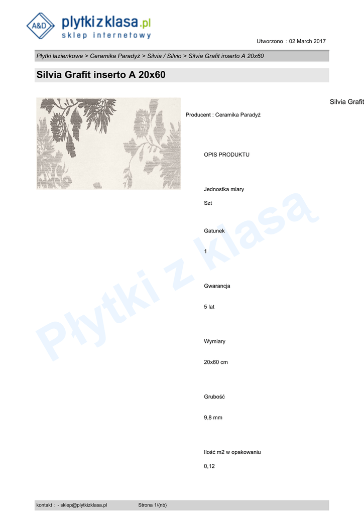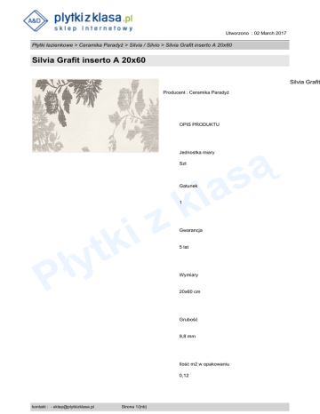 Utworzono : 02 March 2017 Płytki łazienkowe > Ceramika Paradyż > Silvia / Silvio > Silvia Grafit inserto A 20x60 Silvia Grafit inserto A 20x60 Silvia Grafit Producent : Ceramika Paradyż OPIS PRODUKTU ą s la Jednostka miary Szt Gatunek k z 1 i tk y ł P Gwarancja 5 lat Wymiary 20x60 cm Grubość 9,8 mm Ilość m2 w opakowaniu 0,12 kontakt : - [email protected] Strona 1/{nb} Utworzono : 02 March 2017 Płytki łazienkowe > Ceramika Paradyż > Silvia / Silvio > Silvia Grafit inserto A 20x60 Silvia Grafit inserto A 20x60 lość sztuk w opakowaniu 1 Rodzaj Dekoracje ścienne ą s la Zastosowanie Wewnątrz k z Pomieszczenia i tk y ł P Łazienka, kuchnia Powierzchnia Błyszcząca Mrozoodporność Nie Klasa ścieralności (PEI) Nie dotyczy Waga opakowania / szuki 2,11 kg / 2,11 kg Podana cena dotyczy 1 sztuki Sprzedaż produktu Produkt sprzedawany na sztuki kontakt : - [email protected] Strona 2/{nb} Utworzono : 02 March 2017 Płytki łazienkowe > Ceramika Paradyż > Silvia / Silvio > Silvia Grafit inserto A 20x60 Silvia Grafit inserto A 20x60 Cena : 40,15 zł Brutto ( 32,64 zł Netto) ą s la Dostępność: Produkt dostępny w naszym sklepie od 08 February 2015 i tk y ł P kontakt : - [email protected] Strona 3/{nb} k z