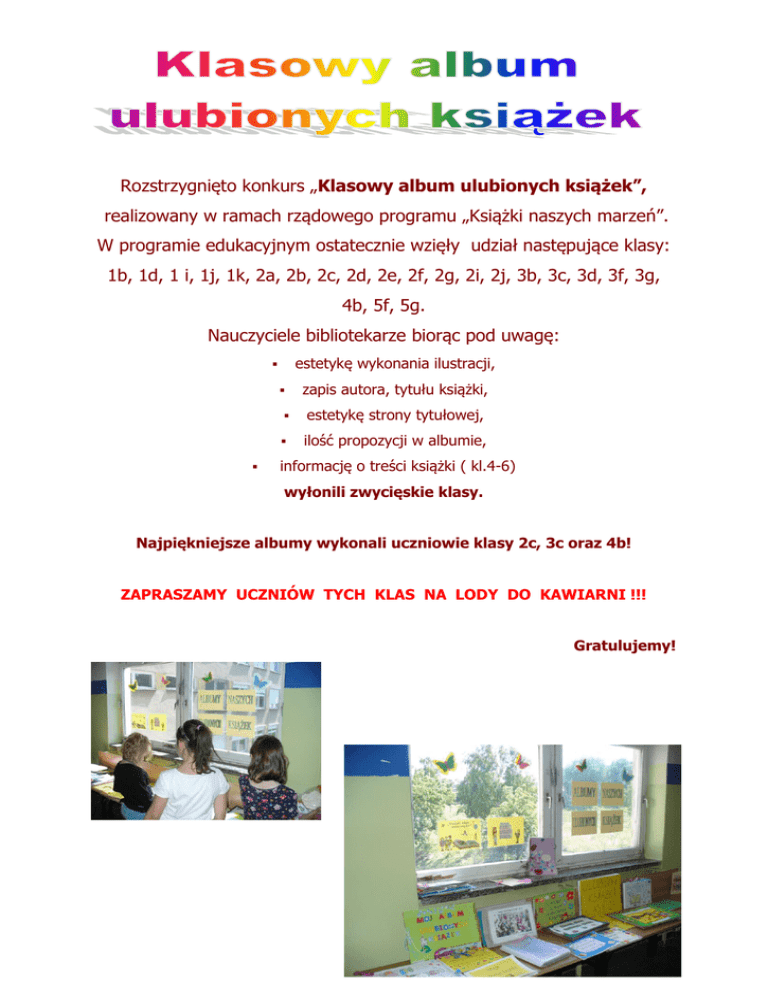 Rozstrzygnięto konkurs „Klasowy album ulubionych książek”, realizowany w ramach rządowego programu „Książki naszych marzeń”. W programie edukacyjnym ostatecznie wzięły udział następujące klasy: 1b, 1d, 1 i, 1j, 1k, 2a, 2b, 2c, 2d, 2e, 2f, 2g, 2i, 2j, 3b, 3c, 3d, 3f, 3g, 4b, 5f, 5g. Nauczyciele bibliotekarze biorąc pod uwagę: estetykę wykonania ilustracji, zapis autora, tytułu książki, estetykę strony tytułowej, ilość propozycji w albumie, informację o treści książki ( kl.4-6) wyłonili zwycięskie klasy. Najpiękniejsze albumy wykonali uczniowie klasy 2c, 3c oraz 4b! ZAPRASZAMY UCZNIÓW TYCH KLAS NA LODY DO KAWIARNI !!! Gratulujemy!