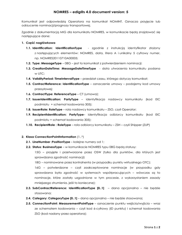 NOMRES – edig@s 4.0 document version: 5 Komunikat jest odpowiedzią Operatora na komunikat NOMINT. Oznacza przyjęcie lub odrzucenie nominacji/prognozy transportowej. Zgodnie z dokumentacją MIG dla komunikatu NOMRES, w komunikacie będą znajdować się następujące dane: 1. Część nagłówkowa 1.1. Identification: IdentificationType - zgodnie z instrukcją identyfikator złożony z następujących elementów: NOMRES, data, litera A i unikalny 5 cyfrowy numer, np. NOMRES20110710A00005; 1.2. Type: MessageType – 08G – jest to komunikat z potwierdzeniem nominacji; 1.3. CreationDateTime: MessageDateTimeType - data utworzenia komunikatu podana w UTC; 1.4. ValidityPeriod: TimeIntervalType – przedział czasu, którego dotyczy komunikat; 1.5. ContractReference: IdentificationType – oznaczenie umowy – podajemy kod umowy przesyłowej; 1.6. ContractType: ReferenceType – CT (umowa); 1.7. IssuerIdentification: PartyType – identyfikacja nadawcy komunikatu (kod EIC podmiotu + schemat kodowania 305); 1.8. IssuerRole: RoleType – rola nadawcy komunikatu – ZSO, czyli Operator; 1.9. RecipientIdentification: PartyType– identyfikacja odbiorcy komunikatu (kod EIC podmiotu + schemat kodowania 305); 1.10. RecipientRole : RoleType – rola odbiorcy komunikatu – ZSH – czyli Shipper (ZUP) 2. Klasa ConnectionPointInformation (1..*) 2.1. LineNumber :PositionType – kolejne numery od 1; 2.2. Status: BusinessType – w komunikacie NOMRES typu 08G będą statusy: 15G – przyjęte i przetworzone przez OSW (tylko dla punktów, dla których jest sprawdzana zgodność nominacji) 18G – nominowane przez kontrahenta (w przypadku punktu wirtualnego OTC); 16G – potwierdzone – czyli zaakceptowane nominacje (w przypadku gdy sprawdzana była zgodność w systemach współpracujących – wówczas są to nominacje, które zostały uzgodnione w tym procesie, z wykorzystaniem zasady mniejszego strumienia, jeśli to konieczne); 2.3. SubContractReference: IdentificationType [0..1] – dana opcjonalna – nie będzie stosowana; 2.4. Category: CategoryType [0..1] – dana opcjonalna – nie będzie stosowana; 2.5. ConnectionPoint: MeasurementPointType – oznaczenie punktu wejścia/wyjścia – wraz ze schematem kodowania – czyli kod 6-cyfrowy (ID punktu) i schemat kodowania ZSO (kod nadany przez operatora); Strona 1 z 2 NOMRES – edig@s 4.0 document version: 5 2.6. InternalShipperAccount: PartyType [0..1] – oznaczenie ZUP wraz ze schematem kodowania – kod ZUP nadany przez Operatora i schemat kodowania ZSO; w przypadku prognoz transportowych kod OSD i schemat kodowania ZSO; 2.7. AccountIdentification: PartyType – oznaczenie dostawcy ZUP / Kontrahenta ZUP – czyli ZUP po stronie OSW – kod podmiotu i schemat kodowania ZSO; w przypadku prognoz transportowych kod OSD i schemat kodowania ZSO; 2.8. AccountRole: RoleType – ZES – External Shipper. 3. Klasa Period (1..*) 3.1. TimeInterval : TimeIntervalType – okres czasu, dla którego będą obowiązywały podawane wartości nominacji/prognozy transportowej (w UTC); 3.2. Direction: QuantityTypeType – kierunek: ZO2 - punkt wejścia, Z03 - punkt wyjścia; 3.3. Quantity: QuantityType – wartość nominacji/prognozy transportowej; 3.4. MeasureUnit: UnitOfMeasureType – jednostka: KW1 (kWh/h). 4. Klasa Status (0..*) – klasa opcjonalna – będzie stosowana w przypadku, gdy nominacja jest odrzucana (wówczas będą potwierdzone wartości 0 w serii 16G) – dla punktów, które są powodem odrzucenia nominacji będzie tu podana przyczyna odrzucenia: 4.1. QuantityStatus: StatusType 06G – mismatch (niezgodność)– stosowany dla wartości, gdzie zastosowano zasadę mniejszego strumienia; 07G – interrupted (moc przerywana) – stosowany w przypadku mocy przerywanych, gdy nominacja jest zatwierdzana z redukcją w ramach mocy umownej przerywanej; 08G –Interrupted firm (moc ciągła bez przerywanej) – stosowany gdy przekroczona jest moc umowna ciągła; 09G – quality deficient (nieodpowiednia jakość gazu) – nie jest stosowany (chyba że taki status pojawi się w komunikacie otrzymanym od OSW to jest automatycznie powtórzony); 10G – reduced capacity (ograniczenie) – stosowany w przypadku ograniczeń związanych z pracami Statusy od 11G do 14G nie będą stosowane. 4.2. ReasonText: ReasonTextType [0..1] – dana opcjonalna - nie będzie stosowana. 5. Klasa Decomposition (0..*) – klasa opcjonalna – nie będzie stosowana. 6. Klasa GcvEstimatedInformation (0..*) – klasa opcjonalna – nie będzie stosowana. Strona 2 z 2