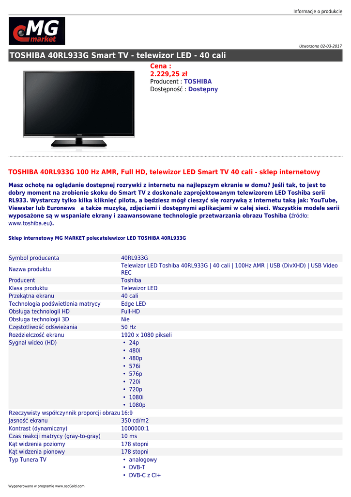 Informacje o produkcie Utworzono 02-03-2017 TOSHIBA 40RL933G Smart TV - telewizor LED - 40 cali Cena : 2.229,25 zł Producent : TOSHIBA Dostępność : Dostępny TOSHIBA 40RL933G 100 Hz AMR, Full HD, telewizor LED Smart TV 40 cali - sklep internetowy Masz ochotę na oglądanie dostępnej rozrywki z internetu na najlepszym ekranie w domu? Jeśli tak, to jest to dobry moment na zrobienie skoku do Smart TV z doskonale zaprojektowanym telewizorem LED Toshiba serii RL933. Wystarczy tylko kilka kliknięć pilota, a będziesz mógł cieszyć się rozrywką z Internetu taką jak: YouTube, Viewster lub Euronews a także muzyką, zdjęciami i dostępnymi aplikacjami w całej sieci. Wszystkie modele serii wyposażone są w wspaniałe ekrany i zaawansowane technologie przetwarzania obrazu Toshiba (źródło: www.toshiba.eu). Sklep internetowy MG MARKET polecatelewizor LED TOSHIBA 40RL933G Symbol producenta 40RL933G Telewizor LED Toshiba 40RL933G | 40 cali | 100Hz AMR | USB (DivXHD) | USB Video Nazwa produktu REC Producent Toshiba Klasa produktu Telewizor LED Przekątna ekranu 40 cali Technologia podświetlenia matrycy Edge LED Obsługa technologii HD Full-HD Obsługa technologii 3D Nie Częstotliwość odświeżania 50 Hz Rozdzielczość ekranu 1920 x 1080 pikseli Sygnał wideo (HD) • 24p • 480i • 480p • 576i • 576p • 720i • 720p • 1080i • 1080p Rzeczywisty współczynnik proporcji obrazu 16:9 Jasność ekranu 350 cd/m2 Kontrast (dynamiczny) 1000000:1 Czas reakcji matrycy (gray-to-gray) 10 ms Kąt widzenia poziomy 178 stopni Kąt widzenia pionowy 178 stopni Typ Tunera TV • analogowy • DVB-T • DVB-C z CI+ Wygenerowano w programie www.oscGold.com System dźwięku Moc wyjściowa audio Telegazeta (pamięć) PiP (obraz w obrazie) PaP (obraz i obraz) Funkcje użyteczne Czytnik kart pamięci Bezprzewodowa karta sieciowa Złącze HDMI Złącze SCART Złącze DVI Złącze D-Sub Złącze COMPONENT (Y, Pb, Pr) Złącze S-Video Złącze USB 2.0 Dodatkowe informacje n/t złącz Pobór mocy (praca/spoczynek) Montaż na ścianie (VESA) Szerokość Wysokość Głębokość Szerokość (bez podstawy) Wysokość (bez podstawy) Głębokość (bez podstawy) Masa netto Masa brutto Kolor Dodatkowe informacje • Tuner HD H.264 (MPEG-4) • Dolby Digital Plus • Stereo Nicam 2 x 10 Wat 500 stron Nie Nie • Tryb hotelowy • Personal Video Recording (PVR) • EPG • Odtwarzanie filmów, muzyki i zdjęć z urządzeń USB Nie Nie 3 szt. 1 szt. 0 szt. 1 szt. 1 szt. 0 szt. 1 szt. • 1 x cyfrowe wyjście optyczne audio • 1 x RJ45 • Ethernet DLNA • 1 x Złącze C.I. (Common Interface) • 1 x wejście AV (kabel Component/Composite + Audio R/L) • WiDi (Wireless Display) 90/0,3 Wat 400 x 400 mm 923 mm 612 mm 216 mm 923 mm 555 mm 57 mm 14 kg 17 kg czarny • 100Hz - Active Motion Rate • Smart-TV Gwarancja producenta - 24 miesiące. Technologia przetwarzania obrazów telewizora TOSHIBA 40RL933G zapewnia częstotliwość odtwarzania 100 AMR (Active Motion & Resolution), dzięki czemu obrazy są wyraźne, a ruchy szybkie i płynne. Redukcja rozmyć wywołanych ruchem i wysoka częstotliwość odświeżania oznaczają, że telewizor z łatwością wyświetla nawet najszybciej zmieniające się transmisje sportowe czy sceny akcji.