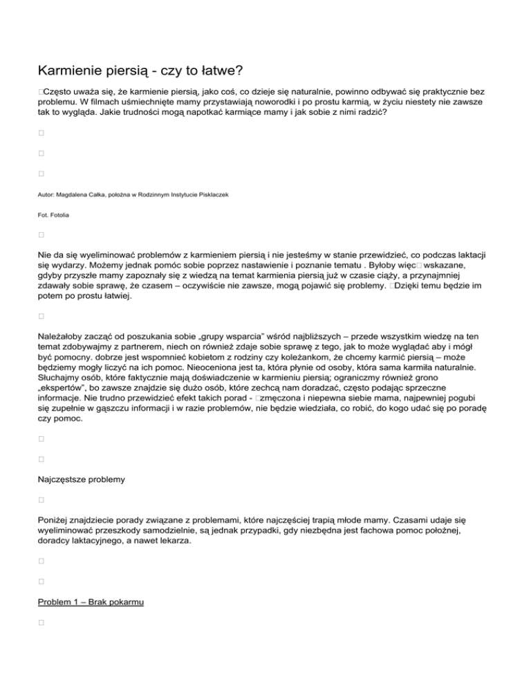 Karmienie piersią - czy to łatwe? Często uważa się, że karmienie piersią, jako coś, co dzieje się naturalnie, powinno odbywać się praktycznie bez problemu. W filmach uśmiechnięte mamy przystawiają noworodki i po prostu karmią, w życiu niestety nie zawsze tak to wygląda. Jakie trudności mogą napotkać karmiące mamy i jak sobie z nimi radzić? Autor: Magdalena Całka, położna w Rodzinnym Instytucie Pisklaczek Fot. Fotolia Nie da się wyeliminować problemów z karmieniem piersią i nie jesteśmy w stanie przewidzieć, co podczas laktacji się wydarzy. Możemy jednak pomóc sobie poprzez nastawienie i poznanie tematu . Byłoby więc wskazane, gdyby przyszłe mamy zapoznały się z wiedzą na temat karmienia piersią już w czasie ciąży, a przynajmniej zdawały sobie sprawę, że czasem – oczywiście nie zawsze, mogą pojawić się problemy. Dzięki temu będzie im potem po prostu łatwiej. Należałoby zacząć od poszukania sobie „grupy wsparcia” wśród najbliższych – przede wszystkim wiedzę na ten temat zdobywajmy z partnerem, niech on również zdaje sobie sprawę z tego, jak to może wyglądać aby i mógł być pomocny. dobrze jest wspomnieć kobietom z rodziny czy koleżankom, że chcemy karmić piersią – może będziemy mogły liczyć na ich pomoc. Nieoceniona jest ta, która płynie od osoby, która sama karmiła naturalnie. Słuchajmy osób, które faktycznie mają doświadczenie w karmieniu piersią; ograniczmy również grono „ekspertów”, bo zawsze znajdzie się dużo osób, które zechcą nam doradzać, często podając sprzeczne informacje. Nie trudno przewidzieć efekt takich porad - zmęczona i niepewna siebie mama, najpewniej pogubi się zupełnie w gąszczu informacji i w razie problemów, nie będzie wiedziała, co robić, do kogo udać się po poradę czy pomoc. Najczęstsze problemy Poniżej znajdziecie porady związane z problemami, które najczęściej trapią młode mamy. Czasami udaje się wyeliminować przeszkody samodzielnie, są jednak przypadki, gdy niezbędna jest fachowa pomoc położnej, doradcy laktacyjnego, a nawet lekarza. Problem 1 – Brak pokarmu Prawie na pewno nie trzeba się martwić czy pokarm będzie lub czy będzie go wystarczająca ilość. Muszę przyznać, że jest to jedno z najczęstszych zmartwień kobiet w ciąży i karmiących mam. Krąży wiele mitów na ten właśnie temat, które wprowadzają wiele zamieszania w tym i tak trudnym okresie, jakim są pierwsze dni po porodzie. Tak naprawdę faktyczny brak pokarmu spotyka tylko znikomą ilość kobiet, u pozostałych trudności te mogą wynikać z przeżywanego stresu, z opóźnionego pierwszego karmienia, z oddzielenia matki z dzieckiem, zbyt rzadkiego przystawiania (częste u spokojnych, niedomagających się piersi dzieci, np. przy początkach nasilającej się żółtaczki fizjologicznej, u wcześniaków), czyli są to sytuacje, które można szybko naprawić. Często też mamy oczekują, że zaraz po porodzie dziecko złapie pierś i będzie ssało, a czasem na początku dzidziuś chce ją tylko polizać, przytulić się do mamy i trzeba cierpliwie poczekać, aż zacznie otwierać buzię, szukać brodawki i jeść. Problem 2 – Płaskie brodawki Troszkę więcej cierpliwości będą potrzebowały mamy z płaskimi (lub wciągniętymi) brodawkami, lecz niech nie uważają, że mają „gorsze” (jak czasami same określają) piersi – noworodki naprawdę nie mają konkretnego wzorca i świetnie sobie poradzą z każdą piersią, tylko czasem trzeba im trochę pomóc. Problemowi płaskich brodawek można zaradzić już wcześniej, stosując w końcowej fazie ciąży niplette. Jest to przyrząd służący trwałemu wyciąganiu brodawek sutkowych, który można nosić po porostu pod ubraniem. Można również przed karmieniem wyciągnąć brodawkę za pomocą odciągacza. Niektóre firmy oferują równie specjalne silikonowe kapturki, które służą temu samemu, ale również są pomocne przy poranionych brodawkach . Chciałam zaznaczyć, że - wbrew powszechnej opinii - rozmiar piersi nie ma znaczenia przy karmieniu, ewentualnie może mieć wpływ na pozycję przy przystawianiu dziecka. Problem 3 – Dziecko się „nie najada” i ciągle domaga się piersi Na początku zwracamy baczną uwagę na częstość przystawiania, ponieważ laktacja dopiero się reguluje, a przy tym maluszek przechodzi przejściowe fizjologiczne stany (żółtaczka, spadek wagi, podwyższona temperatura) i to wymaga regularnego przystawiania, również w nocy. Zwracamy uwagę, czy dzidziuś nie przesypia karmienia, może sobie zrobić jedna dłuższą przerwę (tzw. nocną, – choć nie koniecznie w nocy) ok., 4 godz., ale poza tym karmimy, co 2 -3 godziny i oczywiście na każde żądanie. Na początku malec może chcieć być bardzo często przy piersi, to też normalne, lecz należałoby wtedy zwrócić uwagę, czy wypija tylko mleczko I fazy, (które wypływa na początku karmienia – jest bardziej wodniste, ma więcej laktozy), czy również II fazy, które ma więcej tłuszczu i białka i którym się dziecko najada. Jeżeli dziecko zbyt szybko przysypia przy piersi trzeba je lekko rozbudzić – dotykać w policzek, nosek. Problem 4 – Nawał pokarmu Nawał pokarmu to stan fizjologiczny, pojawia się około 2 – 6 doby po porodzie, gdy nagle wzrasta ilość pokarmu w piersiach. Bywa dokuczliwy, bo piersi są wprost „rozpierane” przez mleko., Starajmy się wtedy często karmić, bo najlepiej pierś opróżni noworodek. Jeżeli jednak pierś jest pełna, a noworodek nie chce już jeść – odciągamy troszeczkę pokarmu, do odczucia ulgi, a po karmieniu stosujemy zimny okład na piersi (może to być liść kapusty z lodówki, wcześniej lekko potłuczony tłuczkiem). Przed karmieniem można też odciągnąć trochę mleka, by zmiękczyć brodawkę i żeby dzidziuś umiał ją lepiej złapać. Problem 5 – Obrzęki i zastoje Obrzęk i zastój w piersi t