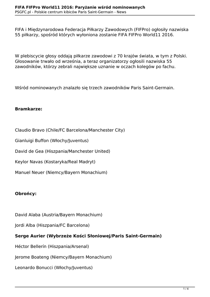 FIFA FIFPro World11 2016: Paryżanie wśród nominowanych PSGFC.pl - Polskie centrum kibiców Paris Saint-Germain - News FIFA i Międzynarodowa Federacja Piłkarzy Zawodowych (FIFPro) ogłosiły nazwiska 55 piłkarzy, spośród których wyłoniona zostanie FIFA FIFPro World11 2016. W plebiscycie głosy oddają piłkarze zawodowi z 70 krajów świata, w tym z Polski. Głosowanie trwało od września, a teraz organizatorzy ogłosili nazwiska 55 zawodników, którzy zebrali największe uznanie w oczach kolegów po fachu. Wśród nominowanych znalazło się trzech zawodników Paris Saint-Germain. Bramkarze: Claudio Bravo (Chile/FC Barcelona/Manchester City) Gianluigi Buffon (Włochy/Juventus) David de Gea (Hiszpania/Manchester United) Keylor Navas (Kostaryka/Real Madryt) Manuel Neuer (Niemcy/Bayern Monachium) Obrońcy: David Alaba (Austria/Bayern Monachium) Jordi Alba (Hiszpania/FC Barcelona) Serge Aurier (Wybrzeże Kości Słoniowej/Paris Saint-Germain) Héctor Bellerín (Hiszpania/Arsenal) Jerome Boateng (Niemcy/Bayern Monachium) Leonardo Bonucci (Włochy/Juventus) 1/4 FIFA FIFPro World11 2016: Paryżanie wśród nominowanych PSGFC.pl - Polskie centrum kibiców Paris Saint-Germain - News Daniel Carvajal (Hiszpania/Real Madryt) Giorgio Chiellini (Włochy/Juventus) Dani Alves (Brazylia/ FC Barcelona/Juventus) David Luiz (Brazylia/Paris Saint-Germain/Chelsea) Diego Godin (Urugwaj/Atletico Madryt) Mats Hummels (Niemcy/Borussia Dortmund/Bayern Monachium) Philipp Lahm (Niemcy/Bayern Monachium) Marcelo (Brazylia/Real Madryt) Javier Mascherano (Argentyna/FC Barcelona) Pepe (Portugalia/Real Madryt) Gerard Pique (Hiszpania/FC Barcelona) Sergio Ramos (Hiszpania/Real Madryt) Thiago Silva (Brazylia/Paris Saint-Germain) Raphael Varane (Francja/Real Madryt) Pomocnicy: Xabi Alonso (Hiszpania/Bayern Monachium) Sergio Busquets (Hiszpania/FC Barcelona) Kevin De Bruyne (Belgia/Manchester City) Eden Hazard (Belgia/Chelsea) Andres Iniesta (Hiszpania/FC Barcelona) N'Golo Kante (Francja/Leicester City/Chelsea) 2/4 FIFA FIFPro World11 2016: Paryżanie wśród nominowanych PSGFC.pl - Polskie centrum kibiców Paris Saint-Germain - News Toni Kroos (Niemcy/Real Madryt) Luka Modric (Chorwacja/Real Madryt) Mesut Ozil (Niemcy/Arsenal) Dimitri Payet (Francja/West Ham United) Paul Pogba (Francja/Juventus / Manchester United) Ivan Rakitic (Chorwacja FC Barcelona) David Silva (Hiszpania/Manchester City) Marco Verratti (Włochy/Paris Saint-Germain) Arturo Vidal (Chile/Bayern Monachium) Napastnicy: Sergio Aguero (Argentyna/Manchester City) Gareth Bale (Walia/Real Madryt) Karim Benzema (Francja/Real Madryt) Cristiano Ronaldo (Portugalia/Real Madryt) Paulo Dybala (Argentyna/Juventus) Antoine Griezmann (Francja/Atlético Madryt) Gonzalo Higuain (Argentyna/Napoli/Juventus) Zlatan Ibrahimovic (Szwecja/Paris Saint-Germain/Manchester United) Robert Lewandowski (Polska/Bayern Monachium) Lionel Messi (Argentyna/FC Barcelona) Thomas Muller (Niemcy/Bayern Monachium) 3/4 FIFA FIFPro World11 2016: Paryżanie wśród nominowanych PSGFC.pl - Polskie centrum kibiców Paris Saint-Germain - News Neymar (Brazylia/FC Barcelona) Alexis Sanchez (Chile/Arsenal) Luis Suarez (Urugwaj/FC Barcelona) Jamie Vardy (Anglia/Leicester City) Autor: PSGKP 4/4 Powered by TCPDF (www.tcpdf.org)