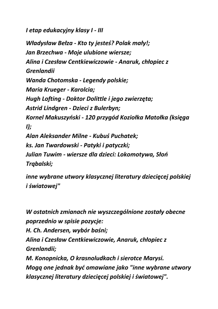 I etap edukacyjny klasy I - III Władysław Bełza - Kto ty jesteś? Polak mały!; Jan Brzechwa - Moje ulubione wiersze; Alina i Czesław Centkiewiczowie - Anaruk, chłopiec z Grenlandii Wanda Chotomska - Legendy polskie; Maria Krueger - Karolcia; Hugh Lofting - Doktor Dolittle i jego zwierzęta; Astrid Lindgren - Dzieci z Bulerbyn; Kornel Makuszyński - 120 przygód Koziołka Matołka (księga I); Alan Aleksander Milne - Kubuś Puchatek; ks. Jan Twardowski - Patyki i patyczki; Julian Tuwim - wiersze dla dzieci: Lokomotywa, Słoń Trąbalski; inne wybrane utwory klasycznej literatury dziecięcej polskiej i światowej" W ostatnich zmianach nie wyszczególnione zostały obecne poprzednio w spisie pozycje: H. Ch. Andersen, wybór baśni; Alina i Czesław Centkiewiczowie, Anaruk, chłopiec z Grenlandii; M. Konopnicka, O krasnoludkach i sierotce Marysi. Mogą one jednak być omawiane jako "inne wybrane utwory klasycznej literatury dziecięcej polskiej i światowej". II etap edukacyjny klasy IV - VI 1. Carlo Collodi - Pinokio; Wiktor Gomulicki - Wspomnienia niebieskiego mundurka; Irena Jurgielewiczowa - Ten obcy; Rudyard Kipling - Księga Dżungli; Józef Ignacy Kraszewski - Stara Baśń; C.S. Lewis - Opowieści z Narnii, cz. I: Lew, Czarownica i stara szafa; Kornel Makuszyński - Szatan z siódmej klasy; Lucy Maud Montgomery - Ania z Zielonego Wzgórza; Edmund Niziurski - Sposób na Alcybiadesa; Henryk Sienkiewicz - W pustyni i w puszczy; Alfred Szklarski - Tomek w krainie kangurów; ks. Jan Twardowski - Zeszyt w kratkę; Mark Twain - Przygody Tomka Sawyera; Juliusz Verne - W 80 dni dookoła świata; Stanisław Lem - Bajki robotów. 2. Baśnie, legendy, opowiadania i utwory poetyckie pochodzące z regionu. 3. Inne teksty reprezentatywne dla źródeł kultury europejskiej. 4. Wybrane przez uczniów i nauczyciela stosownie do możliwości i potrzeb uczniów: 1) utwory prozatorskie i poetyckie wprowadzające w polską tradycję i współczesność literacką, 2) teksty reprezentatywne dla różnych rodzajów, gatunków i form artystycznego wyrazu, ze szczególnym uwzględnieniem utworów epickich, w tym odmian prozy fabularnej, literatury science fiction. 5. Teksty użytkowe, publicystyczne, popularnonaukowe, przedstawienia teatralne, filmy, słuchowiska radiowe, programy telewizyjne. W ostatnich zmianach nie wyszczególnione zostały obecne poprzednio w spisie pozycje: Karol Bunsch - Dzikowy skarb (fragmenty); Daniel Dafoe - Robinson Cruzoe; Zbigniew Nienacki - Pan Samochodzik i Templariusze; John Ronald Reuel Tolkien - Władca Pierścieni.