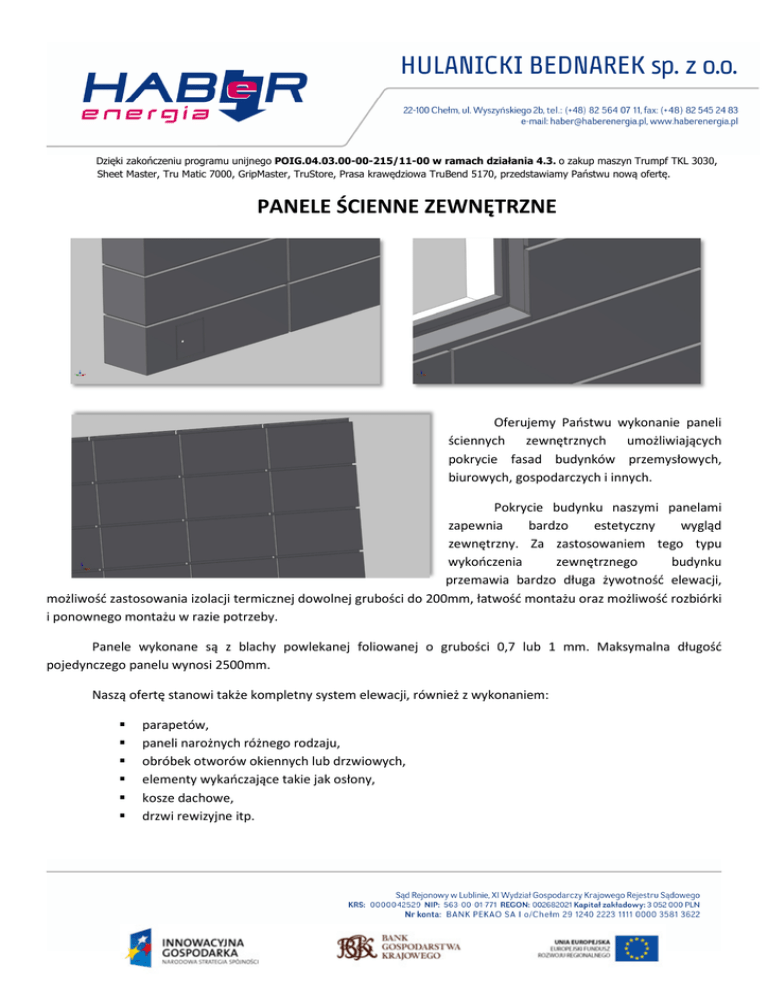 Dzięki zakończeniu programu unijnego POIG.04.03.00-00-215/11-00 w ramach działania 4.3. o zakup maszyn Trumpf TKL 3030, Sheet Master, Tru Matic 7000, GripMaster, TruStore, Prasa krawędziowa TruBend 5170, przedstawiamy Państwu nową ofertę. PANELE ŚCIENNE ZEWNĘTRZNE Oferujemy Państwu wykonanie paneli ściennych zewnętrznych umożliwiających pokrycie fasad budynków przemysłowych, biurowych, gospodarczych i innych. Pokrycie budynku naszymi panelami zapewnia bardzo estetyczny wygląd zewnętrzny. Za zastosowaniem tego typu wykończenia zewnętrznego budynku przemawia bardzo długa żywotność elewacji, możliwość zastosowania izolacji termicznej dowolnej grubości do 200mm, łatwość montażu oraz możliwość rozbiórki i ponownego montażu w razie potrzeby. Panele wykonane są z blachy powlekanej foliowanej o grubości 0,7 lub 1 mm. Maksymalna długość pojedynczego panelu wynosi 2500mm. Naszą ofertę stanowi także kompletny system elewacji, również z wykonaniem: parapetów, paneli narożnych różnego rodzaju, obróbek otworów okiennych lub drzwiowych, elementy wykańczające takie jak osłony, kosze dachowe, drzwi rewizyjne itp. SYSTEM MOCOWANIA I UKŁADANIE System mocowania paneli opiera się na wspornikach pionowych wykonanych z blachy stalowej, pokrytych warstwą alucynkową zabezpieczającą przed korozją. Pomiędzy wsporniki pionowe, rozkładana jest wełna mineralna wraz z folią paroprzepuszczalną, jako izolacja termiczna. Układanie paneli rozpoczynamy od dołu odpowiednio wyprofilowaną listwą startową. Panele zahaczane są od dołu specjalnym kołnierzem natomiast góra przykręcana jest wkrętami montażowymi do profili pionowych. W każdym panelu wykonane są otwory od strony dolnej odprowadzające wodę powstałą wskutek kondesacji. Zapewniamy pomoc przy pomiarach, możliwość wykonania projektu poglądowego, pomagamy na każdym etapie realizacji inwestycji. Ze względu na duże możliwości adaptacyjne dla indywidualnego zastosowania paneli elewacyjnych, prosimy o kontakt z działem handlowym naszej firmy w celu ustalenia zakresu wykonania i zaprojektowania. E-Mail: [email protected] Tel.: 82 564 07 11