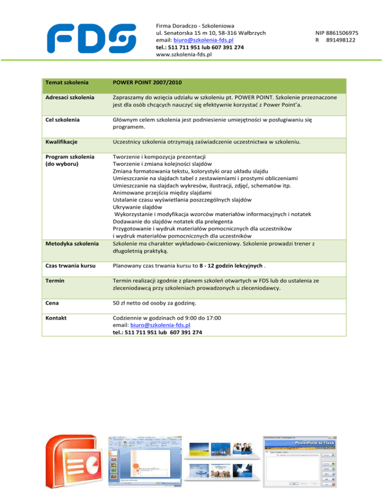 FDS Firma Doradczo - Szkoleniowa ul. Senatorska 15 m 10, 58-316 Wałbrzych email: [email protected] tel.: 511 711 951 lub 607 391 274 www.szkolenia-fds.pl NIP 8861506975 R 891498122 Temat szkolenia POWER POINT 2007/2010 Adresaci szkolenia Zapraszamy do wzięcia udziału w szkoleniu pt. POWER POINT. Szkolenie przeznaczone jest dla osób chcących nauczyd się efektywnie korzystad z Power Point’a. Cel szkolenia Głównym celem szkolenia jest podniesienie umiejętności w posługiwaniu się programem. Kwalifikacje Uczestnicy szkolenia otrzymają zaświadczenie uczestnictwa w szkoleniu. Program szkolenia (do wyboru) Tworzenie i kompozycja prezentacji Tworzenie i zmiana kolejności slajdów Zmiana formatowania tekstu, kolorystyki oraz układu slajdu Umieszczanie na slajdach tabel z zestawieniami i prostymi obliczeniami Umieszczanie na slajdach wykresów, ilustracji, zdjęd, schematów itp. Animowane przejścia między slajdami Ustalanie czasu wyświetlania poszczególnych slajdów Ukrywanie slajdów Wykorzystanie i modyfikacja wzorców materiałów informacyjnych i notatek Dodawanie do slajdów notatek dla prelegenta Przygotowanie i wydruk materiałów pomocnicznych dla uczestników i wydruk materiałów pomocnicznych dla uczestników Szkolenie ma charakter wykładowo-dwiczeniowy. Szkolenie prowadzi trener z długoletnią praktyką. Metodyka szkolenia Czas trwania kursu Planowany czas trwania kursu to 8 - 12 godzin lekcyjnych . Termin Termin realizacji zgodnie z planem szkoleo otwartych w FDS lub do ustalenia ze zleceniodawcą przy szkoleniach prowadzonych u zleceniodawcy. Cena 50 zł netto od osoby za godzinę. Kontakt Codziennie w godzinach od 9:00 do 17:00 email: [email protected] tel.: 511 711 951 lub 607 391 274