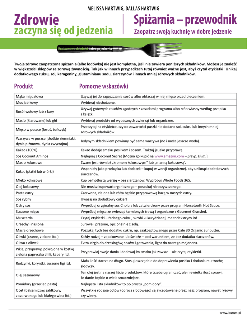 MELISSA HARTWIG, DALLAS HARTWIG Zdrowie zaczyna się od jedzenia Spiżarnia – przewodnik Zaopatrz swoją kuchnię w dobre jedzenie Podstawowe składniki dobrego jedzenia Twoja zdrowo zaopatrzona spiżarnia (albo lodówka) nie jest kompletna, jeśli nie zawiera poniższych składników. Możesz je znaleźć w większości sklepów ze zdrową żywnością. Tak jak w innych przypadkach tutaj również ważne jest, abyś czytał etykietki! Unikaj dodatkowego cukru, soi, karageniny, glutaminianu sodu, siarczynów i innych mniej zdrowych składników. Produkt Pomocne wskazówki Mąka migdałowa Używaj jej do zagęszczania sosów albo obtaczaj w niej mięso przed pieczeniem. Mus jabłkowy Wybieraj niesłodzone. Rosół wołowy lub z kury Używaj gotowych rosołów zgodnych z zasadami programu albo zrób własny według przepisu z książki. Masło (klarowane) lub ghi Wybieraj produkty od wypasanych zwierząt lub organiczne. Mięso w puszce (łosoś, tuńczyk) Przeczytaj na etykietce, czy do zawartości puszki nie dodano soi, cukru lub innych mniej zdrowych składników. Warzywa w puszce (słodkie ziemniaki, dynia piżmowa, dynia zwyczajna) Jedynym składnikiem powinny być same warzywa (no i może jeszcze woda). Kakao (100%) Kakao dodaje smaku posiłkom i sosom. Traktuj je jako przyprawę. Sos Coconut Aminos Najlepiej z Coconut Secret [Można go kupić na www.amazon.com – przyp. tłum.] Masło kokosowe Zwane jest również „kremem kokosowym” lub „manną kokosową”. Kokos (płatki lub wiórki) Wspaniały jako przekąska lub dodatek – kupuj w wersji organicznej, aby uniknąć dodatkowych siarczanów. Mleko kokosowe Kup pełnotłustą wersję – bez siarczanów. Wypróbuj Whole Foods 365. Olej kokosowy Nie musisz kupować organicznego – poszukaj nieoczyszczonego. Pasta curry Czerwona, zielona lub żółta będzie przyprawową bazą w naszych curry. Sos rybny Uważaj na dodatkowy cukier! Ostry sos Wypróbuj oryginalny sos Cholula lub zatwierdzony przez program Horsetooth Hot Sauce. Suszone mięso Wypróbuj mięsa ze zwierząt karmionych trawą i organiczne z Gourmet Grassfed. Musztarda Czytaj etykietki – żadnego cukru, skrobi kukurydzianej, maltodekstryny itd. Orzechy i nasiona Surowe i prażone, opcjonalnie z solą. Masła orzechowe Poszukaj tych bez dodatku cukru, np. zaakceptowanego przez Cale 30 Organic Sunbu er. Oliwki (czarne, zielone itd.) Każdy rodzaj – zapakowane lub świeże – pod warunkiem, że bez dodatku siarczanów. Oliwa z oliwek Extra-virgin do dressingów, sosów i gotowania, light do naszego majonezu. Pikle, przyprawy, pokrojona w kostkę zielona papryczka chili, kapary itd. Przyprawiaj swoje dania i dodawaj im smaku jak zawsze – ale czytaj etykietki. Rodzynki, koryntki, suszone figi itd. Mała ilość starcza na długo. Stosuj oszczędnie do doprawienia posiłku i dodania mu trochę słodyczy. Olej sezamowy Ten olej jest na naszej liście produktów, które trzeba ograniczać, ale niewielka ilość sprawi, że danie będzie o wiele smaczniejsze. Pomidory (przecier, pasta) Najlepsza lista składników to po prostu „pomidory”. Ocet (balsamiczny, jabłkowy, z czerwonego lub białego wina itd.) Wszystkie rodzaje octów (oprócz słodowego) są akceptowane przez nasz program, nawet ryżowy czy winny. www.laurum.pl