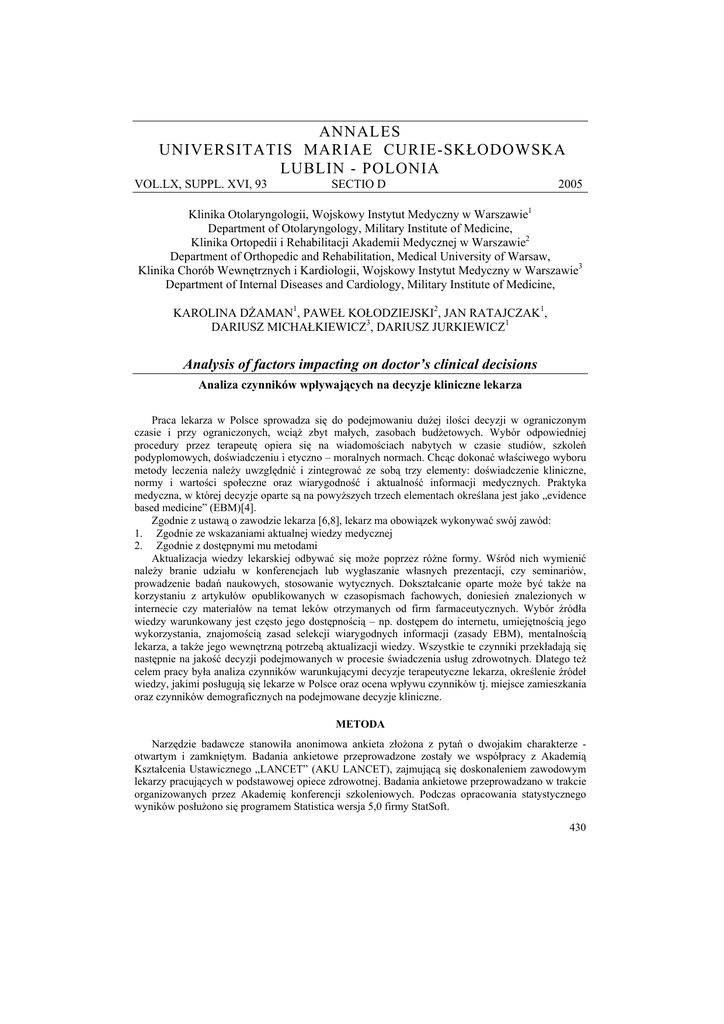 ANNALES UNIVERSITATIS MARIAE CURIE-SKŁODOWSKA LUBLIN - POLONIA VOL.LX, SUPPL. XVI, 93 SECTIO D 2005 Klinika Otolaryngologii, Wojskowy Instytut Medyczny w Warszawie1 Department of Otolaryngology, Military Institute of Medicine, Klinika Ortopedii i Rehabilitacji Akademii Medycznej w Warszawie2 Department of Orthopedic and Rehabilitation, Medical University of Warsaw, Klinika Chorób Wewnętrznych i Kardiologii, Wojskowy Instytut Medyczny w Warszawie3 Department of Internal Diseases and Cardiology, Military Institute of Medicine, KAROLINA DŻAMAN1, PAWEŁ KOŁODZIEJSKI2, JAN RATAJCZAK1, DARIUSZ MICHAŁKIEWICZ3, DARIUSZ JURKIEWICZ1 Analysis of factors impacting on doctor’s clinical decisions Analiza czynników wpływających na decyzje kliniczne lekarza Praca lekarza w Polsce sprowadza się do podejmowaniu dużej ilości decyzji w ograniczonym czasie i przy ograniczonych, wciąż zbyt małych, zasobach budżetowych. Wybór odpowiedniej procedury przez terapeutę opiera się na wiadomościach nabytych w czasie studiów, szkoleń podyplomowych, doświadczeniu i etyczno – moralnych normach. Chcąc dokonać właściwego wyboru metody leczenia należy uwzględnić i zintegrować ze sobą trzy elementy: doświadczenie kliniczne, normy i wartości społeczne oraz wiarygodność i aktualność informacji medycznych. Praktyka medyczna, w której decyzje oparte są na powyższych trzech elementach określana jest jako „evidence based medicine” (EBM)[4]. Zgodnie z ustawą o zawodzie lekarza [6,8], lekarz ma obowiązek wykonywać swój zawód: 1. Zgodnie ze wskazaniami aktualnej wiedzy medycznej 2. Zgodnie z dostępnymi mu metodami Aktualizacja wiedzy lekarskiej odbywać się może poprzez różne formy. Wśród nich wymienić należy branie udziału w konferencjach lub wygłaszanie własnych prezentacji, czy seminariów, prowadzenie badań naukowych, stosowanie wytycznych. Dokształcanie oparte może być także na korzystaniu z artykułów opublikowanych w czasopismach fachowych, doniesień znalezionych w internecie czy materiałów na temat leków otrzymanych od firm farmaceutycznych. Wybór źródła wiedzy warunkowany jest często jego dostępnością – np. dostępem do internetu, umiejętnością jego wykorzystania, znajomością zasad selekcji wiarygodnych informacji (zasady EBM), mentalnością lekarza, a także jego wewnętrzną potrzebą aktualizacji wiedzy. Wszystkie te czynniki przekładają się następnie na jakość decyzji podejmowanych w procesie świadczenia usług zdrowotnych. Dlatego też celem pracy była analiza czynników warunkującymi decyzje terapeutyczne lekarza, określenie źródeł wiedzy, jakimi posługują się lekarze w Polsce oraz ocena wpływu czynników tj. miejsce zamieszkania oraz czynników demograficznych na podejmowane decyzje kliniczne. METODA Narzędzie badawcze stanowiła anonimowa ankieta złożona z pytań o dwojakim charakterze otwartym i zamkniętym. Badania ankietowe przeprowadzone zostały we współpracy z Akademią Kształcenia Ustawicznego „LANCET” (AKU LANCET), zajmującą się doskonaleniem zawodowym lekarzy pracujących w podstawowej opiece zdrowotnej. Badania ankietowe przeprowadzano w trakcie organizowanych przez Akademię konferencji szkoleniowych. Podczas opracowania statystycznego wyników posłużono się programem Statistica wersja 5,0 firmy StatSoft. 430 MATERIAŁ Respondentami zaproszonymi do udziału w badaniach byli uczestnicy konferencji naukowych organizowanych przez AKU Lancet na terenie całej Polski w 2003 i 2004 roku. Zbadano 1427 lekarzy, wśród których 1034 osoby (72,4%) stanowiły kobiety, a pozostałe 393 osób (27,6%) mężczyźni. 81,9% badanych posiadało tytuł specjalisty, z czego połowa specjalizację z medycyny rodzinnej. Lekarze zostali podzieleni na 5 grup wiekowych – 140 os (9,8%) • do 30 rż – 421 os (29,5%) • 31-40 rż – 532 os (37,3%) • 41-50 rż – 261 os (18,3%) • 51-60 rż (5,1%) • powyżej 60 rż – 73 os WYNIKI 1. • • • • • • 2. Źródła wiedzy zawodowej, z których korzystają lekarze podejmując decyzje terapeutyczne: Czasopisma medyczne - 94,9% respondentów (podobnie często kobiety i mężczyźni) Wytyczne i rekomendacje - 69,2% (73,1% kobiet; 58,7% mężczyzn) Materiały informacyjne od firm farmaceutycznych - 57,7% (59% kobiet; 54,2% mężczyzn) Podręczniki akademickie - 48,6% (podobnie często kobiety i mężczyźni) Internet (EBM)- 24,5% (21,9% kobiet; 31,3% mężczyzn) CD ROM - 6,7% z (5,7% kobiet; 9,4% mężczyzn) Ilość osób korzystających z internetu (EBM) w zależności od miejsca zamieszkania przedstawia tabela 1. Tabela 1. Osoby korzystające z internetu w poszczególnych miastach • • • • • MIASTO Kraków Gdańsk Szczecin Poznań Warszawa % osób 44,0% 37,83% 35,82% 28,82% 28,0% • • • • • MIASTO Opole Białystok Łódź Zielona Góra Rzeszów % osób 26,0% 25,58% 24,68% 23,66% 20,34% • • • • • MIASTO Kielce Lublin Wrocław Katowice Radom % osób 19,15% 19,0% 18,82% 17,43% 2,85% Ilość osób korzystających z internetu (EBM) w zależności od grupy wiekowej przedstawia tabela 2. Tabela 2. Korzystanie z internetu w poszczególnych grupach wiekowych. • • • • • Wiek do 30 rż 31-40 rż 41-50 rż 51-60 rż powyżej 60 rż Grupa wiekowa I II III IV V Liczba osób korzystajacych z internetu 47 116 116 65 6 % (33,57%) (27,55%) (21,80%) (24,90%) (8,23%) Ilość osób korzystających z internetu w zależności od płci przedstawia tabela 3. 431 Tabela 3. Korzystanie z internetu w poszczególnych grupach wiekowych zależnie od płci. • Wiek do 30 rż Grupa wiekowa I • 31-40 rż II • 41-50 rż III • 51-60 rż IV • > 60 rż V Płeć K M K M K M K M K M Liczba osób korzystajacych z internetu 31 16 81 35 75 41 36 29 4 2 % 32,3% 36,4% 22,4% 33,3% 18,7% 31,3% 20,7% 33,3% 8,5% 7,7% OMÓWIENIE Wykonywanie zawodu lekarza wiąże się ze spełnieniem określonych standardów opieki zdrowotnej ustalonych na mocy 