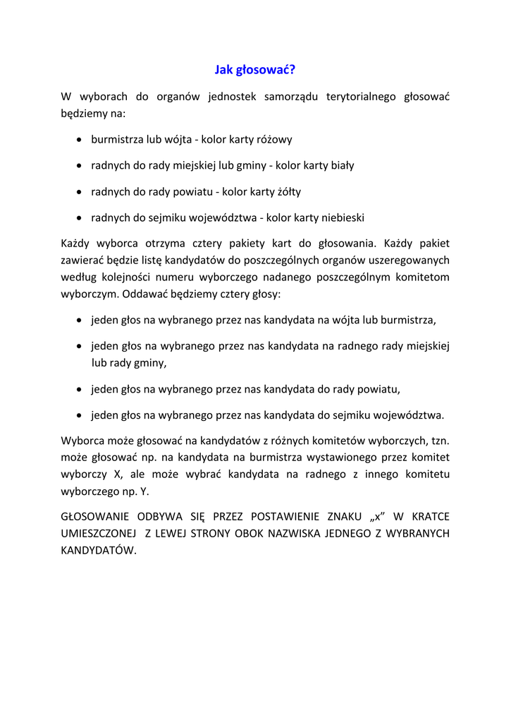 Jak głosować? W wyborach do organów jednostek samorządu terytorialnego głosowad będziemy na: burmistrza lub wójta - kolor karty różowy radnych do rady miejskiej lub gminy - kolor karty biały radnych do rady powiatu - kolor karty żółty radnych do sejmiku województwa - kolor karty niebieski Każdy wyborca otrzyma cztery pakiety kart do głosowania. Każdy pakiet zawierad będzie listę kandydatów do poszczególnych organów uszeregowanych według kolejności numeru wyborczego nadanego poszczególnym komitetom wyborczym. Oddawad będziemy cztery głosy: jeden głos na wybranego przez nas kandydata na wójta lub burmistrza, jeden głos na wybranego przez nas kandydata na radnego rady miejskiej lub rady gminy, jeden głos na wybranego przez nas kandydata do rady powiatu, jeden głos na wybranego przez nas kandydata do sejmiku województwa. Wyborca może głosowad na kandydatów z różnych komitetów wyborczych, tzn. może głosowad np. na kandydata na burmistrza wystawionego przez komitet wyborczy X, ale może wybrad kandydata na radnego z innego komitetu wyborczego np. Y. GŁOSOWANIE ODBYWA SIĘ PRZEZ POSTAWIENIE ZNAKU „x” W KRATCE UMIESZCZONEJ Z LEWEJ STRONY OBOK NAZWISKA JEDNEGO Z WYBRANYCH KANDYDATÓW.