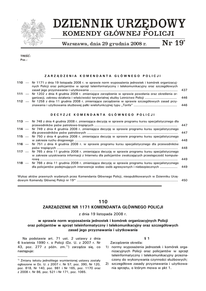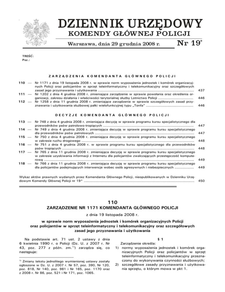 Dziennik Urzędowy Komendy Głównej Policji Nr 19 Poz. 110 ⎯ 437 ⎯ DZIENNIK URZĘDOWY KOMENDY GŁÓWNEJ POLICJI Warszawa, dnia 29 grudnia 2008 r. Nr 19* , , TRESC: Poz.: ZARZĄDZENIA KOMENDANTA GŁÓWNEGO POLICJI 110 ⎯ Nr 1171 z dnia 19 listopada 2008 r. w sprawie norm wyposażenia jednostek i komórek organizacyjnych Policji oraz policjantów w sprzęt teleinformatyczny i telekomunikacyjny oraz szczegółowych zasad jego przyznawania i użytkowania ........................................................................................ 111 ⎯ Nr 1202 z dnia 4 grudnia 2008 r. zmieniające zarządzenie w sprawie powołania oraz określenia organizacji, zakresu działania i właściwości terytorialnej służby Lotnictwo Policji ............................... 112 ⎯ Nr 1258 z dnia 11 grudnia 2008 r. zmieniające zarządzenie w sprawie szczegółowych zasad przyznawania i użytkowania służbowej pałki wielofunkcyjnej typu „Tonfa” .......................................... DECYZJE KOMENDANTA 113 ⎯ 114 ⎯ 115 ⎯ 116 ⎯ 117 ⎯ 118 ⎯ 437 446 446 GŁÓWNEGO POLICJI Nr 748 z dnia 4 grudnia 2008 r. zmieniająca decyzję w sprawie programu kursu specjalistycznego dla przewodników psów patrolowo-tropiących ................................................................................... Nr 749 z dnia 4 grudnia 2008 r. zmieniająca decyzję w sprawie programu kursu specjalistycznego dla przewodników psów patrolowych ........................................................................................ Nr 750 z dnia 4 grudnia 2008 r. zmieniająca decyzję w sprawie programu kursu specjalistycznego w zakresie ruchu drogowego .................................................................................................... Nr 751 z dnia 4 grudnia 2008 r. w sprawie programu kursu specjalistycznego dla przewodników psów tropiących ..................................................................................................................... Nr 765 z dnia 11 grudnia 2008 r. zmieniająca decyzję w sprawie programu kursu specjalistycznego w zakresie uzyskiwania informacji z Internetu dla policjantów zwalczających przestępczość komputerową ..................................................................................................................................... Nr 766 z dnia 11 grudnia 2008 r. zmieniająca decyzję w sprawie programu kursu specjalistycznego dla policjantów podejmujących interwencje wobec osób agresywnych i niebezpiecznych ................. 447 447 448 448 449 449 Wykaz aktów prawnych wydanych przez Komendanta Głównego Policji, nieopublikowanych w Dzienniku Urzędowym Komendy Głównej Policji nr 19* .................................................................................................. 450 110 ZARZĄDZENIE NR 1171 KOMENDANTA GŁÓWNEGO POLICJI z dnia 19 listopada 2008 r. w sprawie norm wyposażenia jednostek i komórek organizacyjnych Policji oraz policjantów w sprzęt teleinformatyczny i telekomunikacyjny oraz szczegółowych zasad jego przyznawania i użytkowania Na podstawie art. 71 ust. 2 ustawy z dnia 6 kwietnia 1990 r. o Policji (Dz. U. z 2007 r. Nr 43, poz. 277 z późn. zm. 1)) zarządza się, co następuje: 1) Zmiany tekstu jednolitego wymienionej ustawy zostały ogłoszone w Dz. U. z 2007 r. Nr 57, poz. 390, Nr 120, poz. 818, Nr 140, poz. 981 i Nr 165, poz. 1170 oraz z 2008 r. Nr 86, poz. 521 i Nr 171, poz. 1065. §1 Zarządzenie określa: 1) normy wyposażenia jednostek i komórek organizacyjnych Policji oraz policjantów w sprzęt teleinformatyczny i telekomunikacyjny przeznaczony do wykonywania czynności służbowych; 2) szczegółowe zasady przyznawania i użytkowania sprzętu, o którym mowa w pkt 1. Dziennik Urzędowy Komendy Głównej Policji Nr 19 1) 2) 3) 4) 5) ⎯ 438 ⎯ §2 Użyte w zarządzeniu określenia oznaczają: norma należności – przysługującą jednostce i komórce organizacyjnej Policji oraz policjantowi normę wyposażenia w sprzęt teleinformatyczny i telekomunikacyjny, w tym pochodzący z darowizn na rzecz tych jednostek i komórek organizacyjnych, niezbędny do wykonywania czynności służbowych; rezerwa dyspozycyjna – sprzęt telekomunikacyjny przeznaczony na pokrycie nieplanowanych potrzeb jednostek i komórek organizacyjnych Policji, umożliwiający podjęcie przez nie działań: operacyjnych na dużą skalę, w przypadku klęski żywiołowej, awarii, zmian struktur organizacyjnych Policji, itp.; rezerwa eksploatacyjno-techniczna – sprzęt teleinformatyczny i telekomunikacyjny utrzymywany przez wydziały: Obsługi Końcowego Użytkownika i Obsługi Radiokomunikacyjnej Biura Łączności i Informatyki Komendy Głównej Policji oraz wydziały łączności lub wydziały informatyki (wydziały łączności i informatyki) lub równorzędne komendy wojewódzkiej (Stołecznej) Policji i szkół policyjnych, służący do zaspokajania bieżących potrzeb nadzorowanych jednostek i komórek organizacyjnych Policji; stanowisko pracy – przestrzeń pracy wraz z wyposażeniem w środki i przedmioty pracy, w której policjant, pracownik Policji lub zespół policjantów, pracowników Policji wykonuje pracę; tabela należności – zbiorcze zestawienie norm należności. §3 1. Normy należności określa załącznik nr 1 do zarządzenia. 2. Zasady przyznawania telefonów stacjonarnych i komórkowych regulują odrębne przepisy. §4 Podstawę do planowania i zaopatrywania jednostek i komórek organizacyjnych Policji w sprzęt teleinformatyczny i telekomunikacyjny stanowią tabele należności. §5 1. Tabele należności opracowują: 1) wydziały: Obsługi Końcowego Użytkownika i Obsługi Radiokomunikacyjnej Biura Łączności i Informatyki Komendy Głównej Policji, zwanego dalej „BŁiI KGP” – dla komórek organizacyjnych Komendy Głównej Policji, zwanej dalej „KGP”; 2) wydziały łączności lub wydziały informatyki (wydziały łączności i informayki) komendy wo