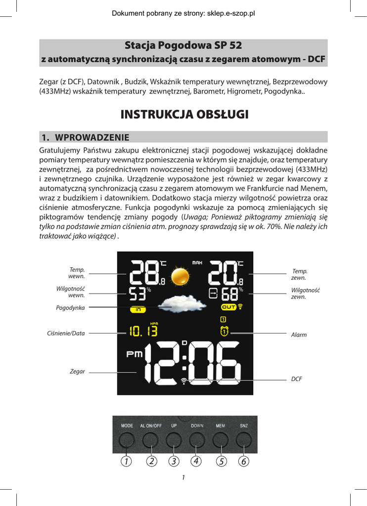 Dokument pobrany ze strony: sklep.e-szop.pl Stacja Pogodowa SP 52 z automatyczną synchronizacją czasu z zegarem atomowym - DCF Zegar (z DCF), Datownik , Budzik, Wskaźnik temperatury wewnętrznej, Bezprzewodowy (433MHz) wskaźnik temperatury zewnętrznej, Barometr, Higrometr, Pogodynka.. INSTRUKCJA OBSŁUGI 1. Wprowadzenie Gratulujemy Państwu zakupu elektronicznej stacji pogodowej wskazującej dokładne pomiary temperatury wewnątrz pomieszczenia w którym się znajduje, oraz temperatury zewnętrznej, za pośrednictwem nowoczesnej technologii bezprzewodowej (433MHz) i zewnętrznego czujnika. Urządzenie wyposażone jest również w zegar kwarcowy z automatyczną synchronizacją czasu z zegarem atomowym we Frankfurcie nad Menem, wraz z budzikiem i datownikiem. Dodatkowo stacja mierzy wilgotność powietrza oraz ciśnienie atmosferyczne. Funkcja pogodynki wskazuje za pomocą zmieniających się piktogramów tendencję zmiany pogody (Uwaga; Ponieważ piktogramy zmieniają się tylko na podstawie zmian ciśnienia atm. prognozy sprawdzają się w ok. 70%. Nie należy ich traktować jako wiążące) . Temp. wewn. Temp. zewn. Wilgotność wewn. Wilgotność zewn. Pogodynka Ciśnienie/Data Alarm Zegar DCF 1 Dokument pobrany ze strony: sklep.e-szop.pl 2. Uruchomienie urządzenia i sposób ustawiania poszczególnych funkcji a) stacja główna (odbiornik) -po otwarciu znajdującej się z tylnej strony urządzenia pokrywy zamontować 3 baterie AAA/1,5 V, zwracając uwagę na biegunowość Po usłyszeniu sygnału dźwiękowego należy odczekać, aż stacja ustawi pomiar temperatury wewnętrznej, oraz odbierze sygnał radiowy DCF umożliwiający automatyczne ustawienie zegara i datownika (operacja ta może trwać do kilkunastu minut – w tym czasie przyciski ustawień nie są aktywne) oraz sygnał od czujnika zewnętrznego. Zaleca się zainstalować baterie w czujniku zewnętrznym w pierwszej kolejności. Gdy stacja odbierze sygnał DCF – u dołu ekranu ukaże się ikona ikona . W przypadku wystąpienia zakłóceń w odbiorze sygnału, czas i datę można ustawić manualnie wg wskazówek jak niżej. Ustawianie poszczególnych funkcji stacji - Ustawianie automatyczne daty i czasu Stacja odbiera sygnał radiowy DCF raz na dobę i automatycznie synchronizuje ustawienia daty i zegara. W prawym dolnym rogu ekranu widnieje ikona . Odbiór sygnału można też wymusić przytrzymując przez ok. 3 sek przycisk „4” (down). - Ustawianie manualne daty i czasu Przytrzymać ok., 3 sek. przycisk „1” („mode”). Migające kolejno Funkcje (tryb 12/24 h <godziny<minuty<rok<miesiąc<dzień<układ miesiąc-dzień) , zmieniać odpowiednio przyciskiem „3” lub „4” i zatwierdzać znów przyciskiem „1”. -Pomiar Temperatury powietrza Krótkie wciśnięcie przycisku „4” pozwala na zmianę jednostki temp. (st C / st F) zarówno wewnątrz pomieszczenia w którym się znajduje, jak też mierzonej na zewnątrz. W przypadku odczytania pomiaru temperatury w zakresie -4stC… +1stC. Na wyświetlaczu zacznie migać ikona . Jeżeli temperatura spadnie poniżej -4stC ikona wyświetla się na stałe. - Higrometr – stacja mierzy wartość względnej wilgotności powietrza zarówno w pomieszczeniu w którym się znajduje, jak też w miejscu, gdzie zainstalowano czujnik zewnętrzny. Pomiar jest realny w zakresie od 20% do 90%. W przypadku ujemnych temperatur względna wilgotność zgodnie z teorią zbliża się do 100% w związku z czym pomiar w przypadku ujemnych temperatur jest nierealny. - Barometr – stacja mierzy wartość bezwzględną ciśnienia atmosferycznego w miejscu w którym się znajduje. Ponieważ komunikaty meteorologiczne , jak też informacje internetowe wskazują często ciśnienie przeliczone zgodnie z wysokością npm. danej miejscowości nie wszystkie dane bezwzględne są porównywalne z pomiarem stacji. Dokładność pomiaru ciśnienia wynosi +/- 5 hPa. Wartość ciśnienia pokazywana jest naprzemiennie z datą. Przytrzymując 3 sek. przycisk 5 (MEM)przełączamy wyświetlaną wartość : ciśnienie/data 2 Dokument pobrany ze strony: sklep.e-szop.pl -Odbiór sygnału nadawanego przez czujnik zewnętrzny (ew. czujniki – maksymalnie stacja może współpracować z 3-ma czujnikami zewnętrznymi) - przytrzymanie przez ok. 3 sek. przycisku „3” powoduje gotowość stacji do odebrania sygnału od czujnika (lub czujników) zewnętrznego (na wyświetlaczu poniżej odczytu temperatury zacznie migać ikona . W tym trybie stacja poszukuje przez kilka minut sygnału czujnika. Krótkie wciśnięcie przycisku „3” pozwala na ustawienie odczytu konkretnego czujnika na stałe (ukaże się ikona Ch1 lub Ch2 lub Ch3). Uwaga: - -Uwaga: W przypadku użycia dwóch lub trzech czujników należy każdy czujnik ustawić na inny kanał (1,2,lub 3) . W przypadku braku odbioru efektywnego sygnału od któregoś z czujników stacja pokazuje na danym kanale symbol „- - „. Należy wtedy sprawdzić i ew. wymienić baterie w czujniku i ponownie wymusić zarejestrowanie czujnika przytrzymując przez ok. 3 sek przycisk”3”. Najlepiej zastosować w czujniku baterie litowojonowe odporne na niskie temperatury lub ew. baterie alkaliczne dobrej jakości.. - Ustawianie budzika (alarmu) Naciskając krótko przycisk „2” możemy aktywować lub wyłączyć alarm A1, alarm A2 lub oba ustawione alarmy. Gdy alarm jest aktywny (na wyświetlaczu pokazuje się ikona , ). Wciskając krótko przycisk”1” powodujemy ukazanie się w miejsce aktualnego czasu–godziny alarmuA1. Przytrzymując przycisk „1” (w momencie, gdy na wyświetlaczu pokazana Jest godzina alarmu ) przez 3 sekundy możemy ustawić przyciskami „up” i „down” żądaną godzinę alarmu. Analogicznie postępujemy w przypadku Alarmu A2 Sygnał alarmu można wyłączyć dowolnym przyciskiem, przy czym przycisk „6” (snz) uruchamia funkcję „drzemka (ponowne załączenie się alarmu po 5 minutach). Sygnał alarmu wyłącza się automaty