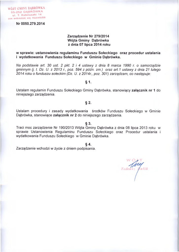 W Ó JT G M IN Y D Ą B R Ó W K A 05-252 DĄBRÓWKA ul. T. K o ś c iu s z k i 14 pow wołomiński, woj. mazowieckie Nr 0050.279.2014 Zarządzenie Nr 279/2014 Wójta Gminy Dąbrówka z dnia 07 lipca 2014 roku w sprawie: ustanowienia regulaminu Funduszu Sołeckiego oraz procedur ustalania i wydatkowania Funduszu Sołeckiego w Gminie Dąbrówka. Na podstawie art. 30 ust. 2 pkt. 2 i 4 ustawy z dnia 8 marca 1990 r. o samorządzie gminnym (j. t. Dz. U. z 2013 r., poz. 594 z późn. zm.) oraz art.1 ustawy z dnia 21 lutego 2014 roku o funduszu sołeckim (Dz. U. z 2014r., poz. 301) zarządzam, co następuje: §1. Ustalam regulamin Funduszu Sołeckiego Gminy Dąbrówka, stanowiący załącznik nr 1 do niniejszego zarządzenia. § 2. Ustalam procedury i zasady wydatkowania środków Funduszu Sołeckiego w Gminie Dąbrówka, stanowiące załącznik nr 2 do niniejszego zarządzenia. § 3. Traci moc zarządzenie Nr 190/2013 Wójta Gminy Dąbrówka z dnia 08 lipca 2013 roku w sprawie Ustanowienia Regulaminu Funduszu Sołeckiego oraz Procedur ustalania i wydatkowania Funduszu Sołeckiego w Gminie Dąbrówka. 4. Zarządzenie wchodzi w życie z dniem podpisania. § Załącznik Nr 1 do Zarządzenia Nr 279/2014 Wójta Gminy Dąbrówka z dnia 07.07.2014r. REGULAMIN FUNDUSZU SOŁECKIEGO GMINY DĄBRÓWKA § 1 1. Niniejszy regulamin określa zasady realizacji zadań wynikających z ustawy z dnia 21 lutego 2014 roku o funduszu sołeckim (Dz. U z 2014 r. poz. 301). 2. Ilekroć w regulaminie jest mowa o: 1) ustawie - należy przez to rozumieć ustawę z dnia 21 lutego 2014 r. o funduszu sołeckim (Dz. U z 2014 r. poz. 301); 2) zadaniu - należy przez to rozumieć zadanie, o którym mowa w art. 2 ust. 6 i 7 ustawy; 3) wniosku - należy przez to rozumieć wniosek o przyznanie środków z funduszu sołeckiego, o którym mowa w art. 5 ust. 1 ustawy na formularzu stanowiącym załącznik do niniejszego regulaminu; 4 ) sołectwie - należy przez to rozumieć Sołectwo Gminy Dąbrówka. §2 1. Uprawnionym do korzystania z funduszu sołeckiego jest sołectwo w imieniu, którego działa Sołtys. 2. O sposobie wydatkowania funduszu sołeckiego decyduje Zebranie Wiejskie. 3. Zakup usług lub materiałów realizowanych w ramach zadania winien być sprecyzowany pod kątem kosztowym oraz zakresowym. 4. Całkowita wartość zadania powinna uwzględniać wszystkie koszty, w tym przygotowanie niezbędnej dokumentacji projektowej i planistycznej oraz nadzoru inwestorskiego, o ile jest to wymagane. 5. Informację o wysokości środków funduszu sołeckiego dla danego Sołectwa Wójt Gminy przekazuje Sołtysom do dnia 31 lipca roku poprzedzającego rok budżetowy. 6. Informację, o której mowa w pkt. 5 W ójt Gminy przekazuje łącznie z formularzem wniosku, wzorem protokołu i wzorem uchwały - stanowiącymi odpowiednio załącznik nr 1, nr 2 i nr 3 do niniejszego Regulaminu. 7. Zadania przygotowywane są przez mieszkańców sołectwa w formie wniosku. Sołtys przekazuje wniosek Wójtowi Gminy w nieprzekraczalnym terminie do dnia 30 września roku poprzedzającego rok budżetowy. 8. We wniosku może zostać wykazany wkład własny sołectwa, np. w postaci pracy wolontariuszy, materiałów należących do mieszkańców itp. 9. Wniosek uchwalony przez Zebranie Wiejskie i złożony przez Sołtysa w terminie wskazanym w pkt. 7 podlega ocenie zgodnie z kryteriami przyjętymi w niniejszym Regulaminie. 10. Sołectwo w terminie do 31 października danego roku budżetowego może złożyć do Wójta Gminy wniosek o zmianę przedsięwzięć lub ich zakresu przewidzianych do realizacji w ramach funduszu - przy zachowaniu całej procedury dotyczącej uchwalania i złożenia wniosku. W zór wniosku o zmianę przedsięwzięć stanowi załącznik Nr 4 do niniejszego Regulaminu. §3 1. Pracownik ds. obsługi interesanta, Rady Gminy, archiwum dokonuje oceny wniosków pod względem formalno-prawnym (tj. czy wniosek: złożony został w wymaganym terminie, spełnia warunki, o których mowa w art. 5 ustawy, został podpisany przez osoby uprawnione i dołączono do niego wymagane załączniki) oraz czy planowane do wykonania zadania są: 1) zadaniami własnymi gminy; 2) służą poprawie warunków życia mieszkańców. 3. Pracownik ds. obsługi interesanta, Rady Gminy, archiwum: 1) w przypadku stwierdzenia braków lub uchybień wzywa wnioskodawcę do uzupełnienia lub poprawienia wskazanych kwestii w terminie 3 dni od dnia dostarczenia wezwania, 2) przedstawia swoje rekomendacje wraz z wnioskiem Wójtowi Gminy w terminie umożliwiającym dochowanie przez Wójta terminu określonego treścią w art. 5 ust. 5 ustawy. §4 1. Za realizację zadań w sołectwie odpowiada Sołtys. 2. Za realizację zadań z zakresu funduszu sołeckiego odpowiedzialni są pracownicy zgodnie z zakresami czynności. 3. Pracownik ds. obsługi interesanta, Rady Gminy, archiwum przygotowuje zestawienie planowanych przedsięwzięć w ramach funduszu i przekazuje do Skarbnika Gminy w celu ujęcia ich w materiałach planistycznych, składanych do projektu budżetu na rok budżetowy, którego dotyczą. Załącznik N r 1 do Regulam inu Funduszu Sołeckiego Gminy Dąbrówka miejscowość, data Wójt Gminy Dąbrówka W N IO SEK O P R Z E Z N A C Z E N IU Ś R O D K Ó W Z FU N D U S Z U S O ŁE C K IE G O NA R O K B U D ŻE TO W Y Sołectwo ..................................................................... w ramach przyznanych środków z funduszu sołeckiego w w y s o k o śc i.............................................................................. wnosi o ujęcie w projekcie budżetu na r o k ................................ następujących zadań: lp. nazwa zadania O GÓ ŁEM szacowany koszt całkowity środki z funduszu sołeckiego w tym: udział mieszkańcó w (praca) inne źródła finansowan ia zadania I. Uzasadnienie wykonania ww. zadań: Załączniki do wniosku: 1. Uchwała z zebrania mieszkańców 2. Kopia listy obecności 3. Protokół z zebrania Sołtys Ocena wniosk